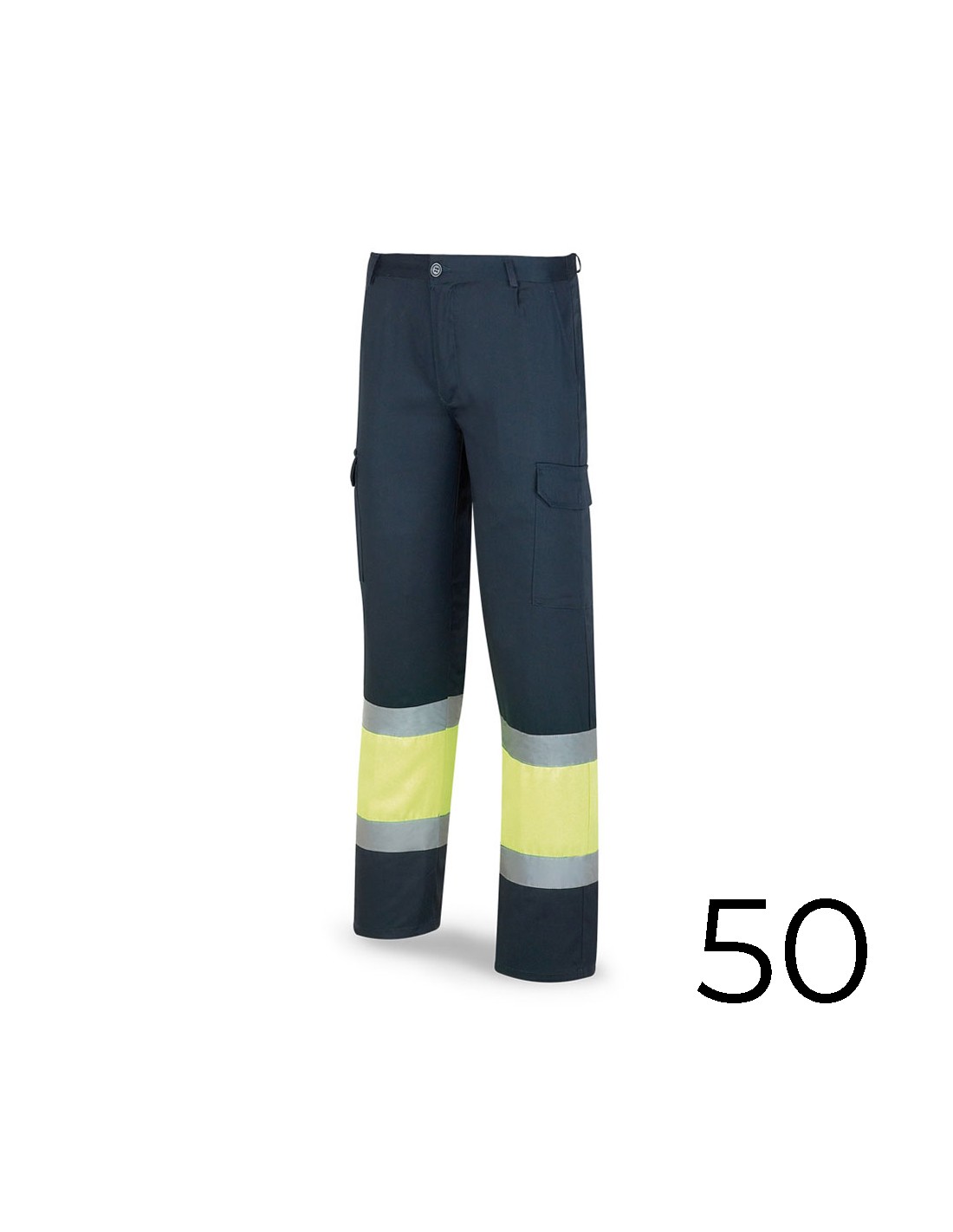 Pantalón poliester/algodón bicolor alta visibilidad azul/amarillo talla 50 388pfxyfa/50 pantalón poliester/algodón (80%/20%) bicolor alta visibilidad en20471 azul/amarillo. tejido 200g/m. 2 bolsillos a la cadera tipo francés, 1 bolsillo tipo plastron trasero ubicado a la derecha y 2 bolsillos plastron en perneras con tapeta y cierre con velcro. 2 bandas retroreflectantes en cada pernera que delimitan arriba y abajo el tejido de fondo. epi de clase i y categoria ii. talla 50