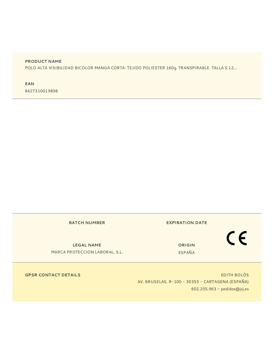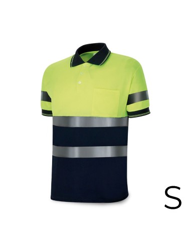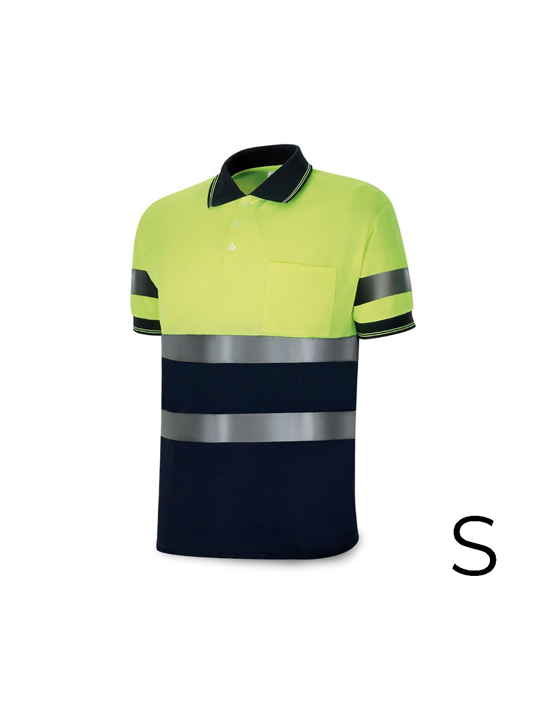 Polo alta visibilidad bicolor manga corta. tejido poliester 160g. transpirable talla s 1288pavxmcyfa/s polo bicolor amarillo fluorescente y azul marino de alta visibilidad en manga corta. tejido poliester 160g. transpirable. en20471.bolsillo en pecho ubicado a la izquierda. 1 banda retroreflectante en cada manga y 2 bandas retroreflectantes horizontales alrededor del contorno del pecho. epi de clase 1 y categoria ii. talla s