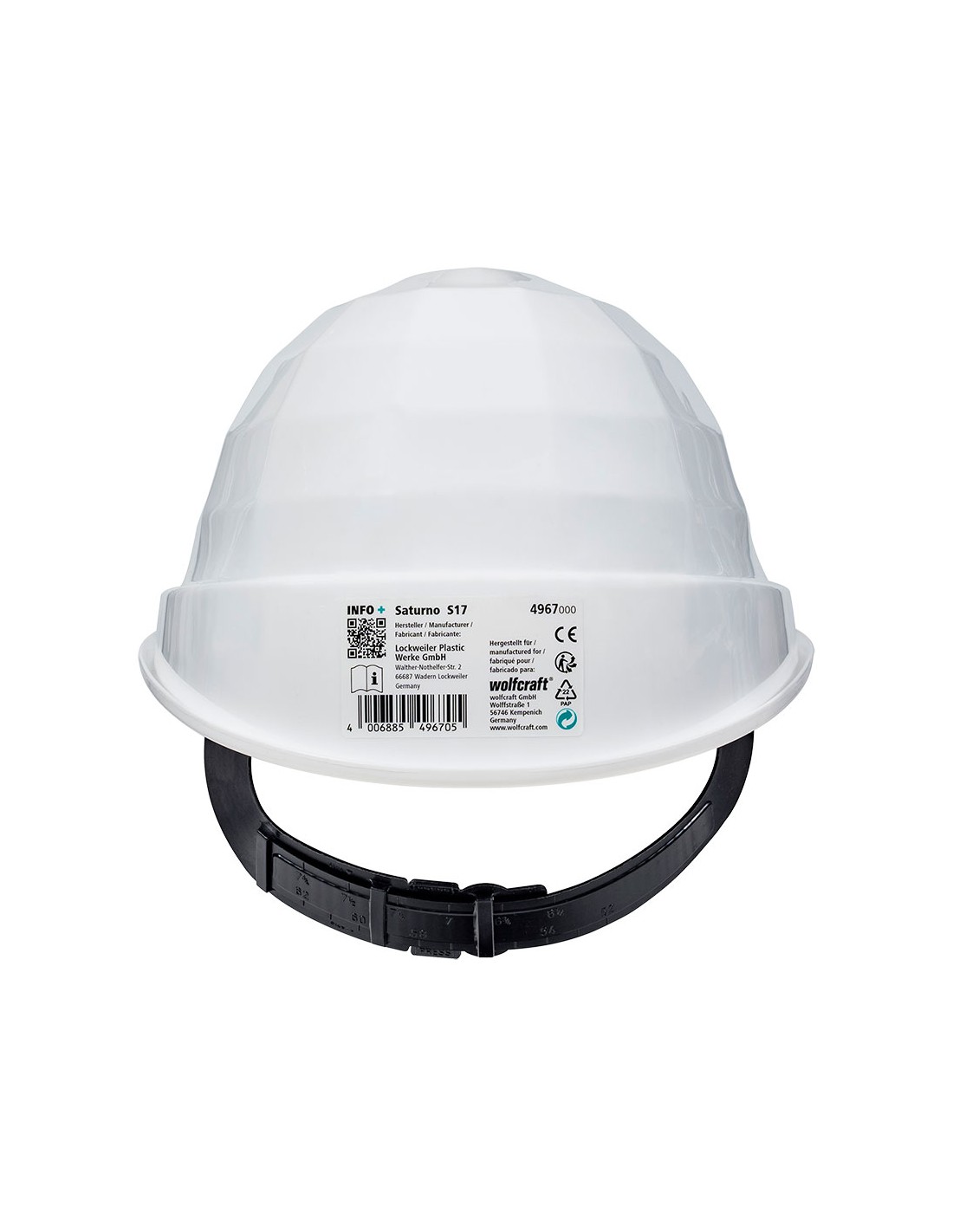 Casco de seguridad, blanco (ce), el casco protector industrial protege de forma fiable frente a la caída de objetos y los impactos mecánicos. el casco de pe (polietileno) ofrece una alta resistencia a los ácidos, las bases y otros productos químicos. para garantizar una larga vida útil, es resistente a los rayos ultravioleta. la protección contra la penetración evita lesiones en caso de grandes fuerzas por objetos puntiagudos y afilados. el casco protector es también adecuado para su uso a bajas temperaturas de hasta -30 °c. el cómodo equipamiento interior de 6 puntos con cierre de trinquete permite adaptar cómodamente el casco al contorno individual de la cabeza (desde 52 hasta 62 cm). dispone de ojales de seguridad para fijar de manera opcional una correa para la barbilla. los orificios de ventilación colocados a ambos lados garantizan la circulación óptima del aire cuando se lleva puesto. para garantizar un uso seguro, las correas y la banda de sudor han sido sometidas a pruebas de sustancias nocivas para la salud según oeko-tex® standard 100. el casco cumple los requisitos según la norma en 397:2012+a1:2012 y el reglamento relativo a los equipos de protección individual (ue) 2016/425. este es un producto "made in germany" de calidad garantizada. tenga en cuenta las indicaciones de seguridad y manejo. 4967000 wolfcraft