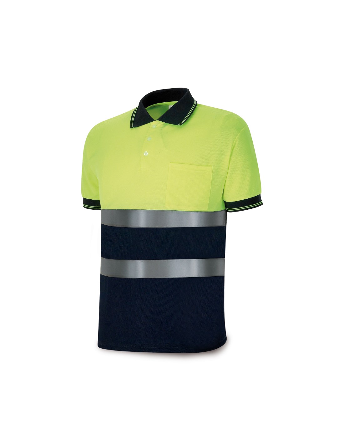 Polo amarillo fluorescente combinado con azul marino de manga corta de alta visibilidad, talla s. tejido poliester 150 g, transpirable. certificado por un organismo notificado europeo y testado por un laboratorio acreditado, de acuerdo con el reglamento ue 2016/425 sobre epi y la norma armonizada en iso 13688 sobre requisitos generales para la ropa de protección y en iso 20471 sobre ropa de alta visibilidad, logrando una clasificación de clase 1 y siendo clasificados como epi de categoría ii