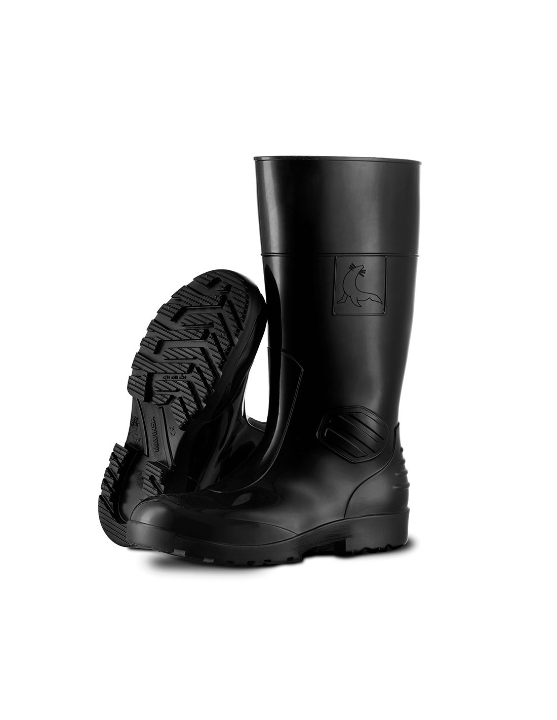 Bota negra de seguridad con puntera de acero, protección en los tobillos y plantilla antiperforación, pvc, antideslizante. normativa une-en iso 20345:2011. talla 40