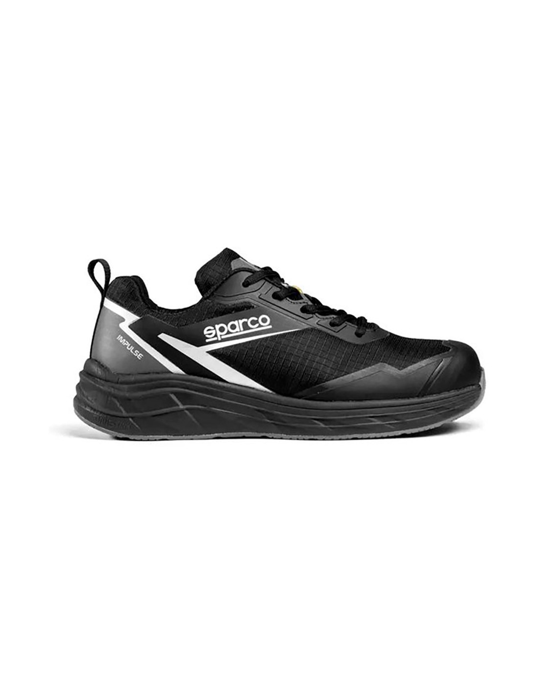 Zapato deportivo de seguridad tipo running impulse chris. talla 41. color negro con detalles en gris. certificación esd s3s sr fo hro. detalles en 3d. tejido rip stop resistente al agua. suela intermedia en eva super confort. suela inferior en goma nitrílica. segundo par de cordones de combinación de color incluído