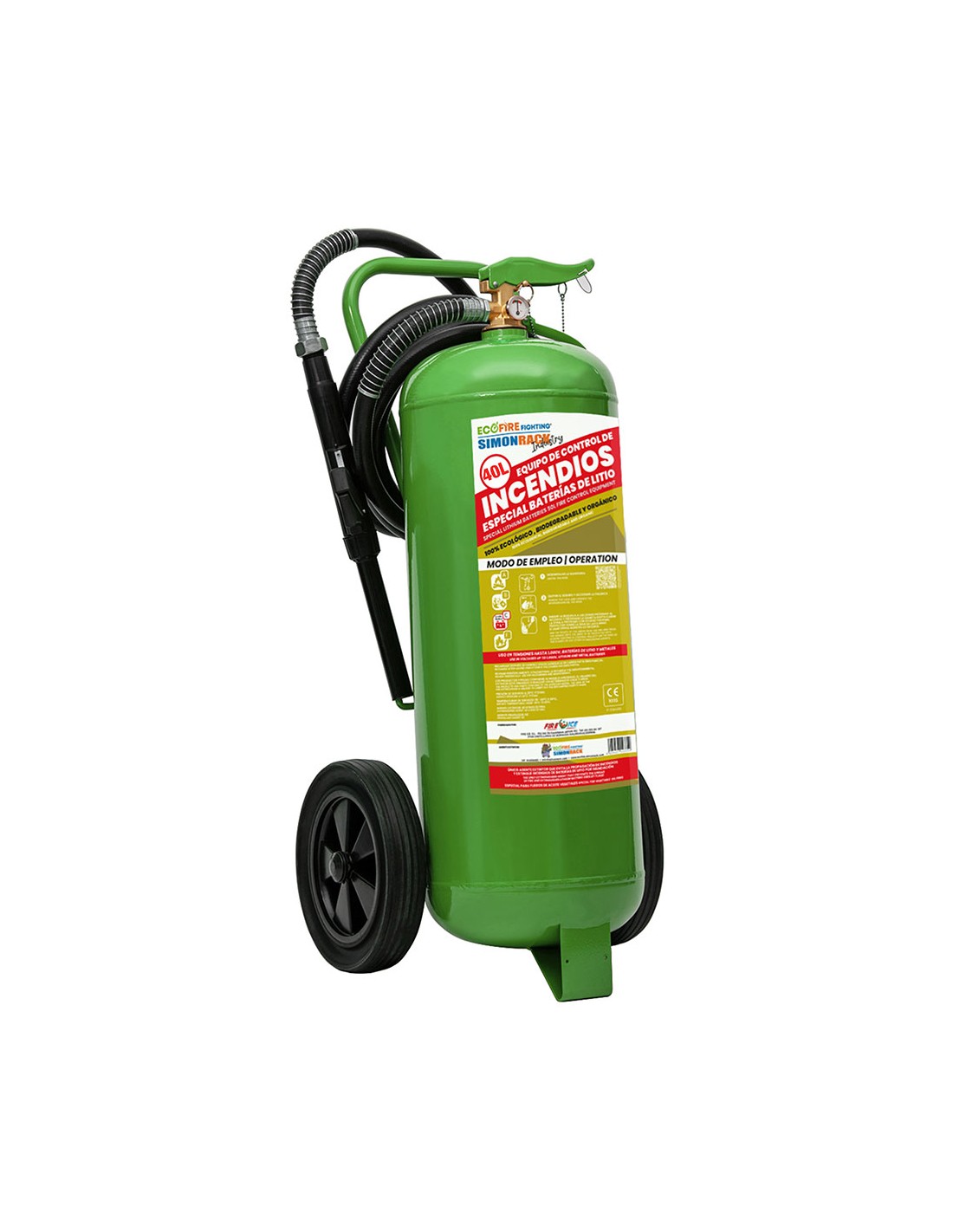 Equipo de protección contra incendios de 40 l, dimensiones 1130 x 560 x 450 mm, con ruedas para facilitar su transporte, actúa como bloqueante del fuego, encapsula el humo y evita emisión de gases tóxicos, previene transmisión de calor, propagación del incendio y reignición, eficaz en extinción de baterías de litio por inmersión y fuegos de grasas, aceites y metales (tipo d), 100% ecológico: no tóxico, no bioacumulable, no corrosivo y biodegradable, alcance de disparo de 20 metros (15 m + 5 m de manguera) para proyección segura, ideal para puntos de carga de coches eléctricos, transporte y almacenaje de dispositivos electrónicos, recargable aunque la descarga haya sido parcial, presión de servicio 20 °c: 17,5 bar, temperatura de servicio de -30°c a 60°c