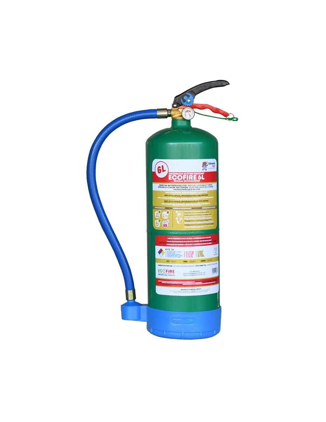 Equipo de protección contra incendios 6 l ecofire fighting ecológico, biodegradable, orgánico y no tóxico. encapsula el humo al instante, no daña a las personas, animales ni plantas y convierte de forma permanente en ignífugo todo lo que recubre. bloquea el fuego por completo: impide la reactivación del incendio una vez extinguido. su acción comienza al alcanzar los 90-95°c incluye soporte metálico para la pared. no transmite calor. se limpia con agua y no deja residuos. temperatura de servicio: desde -30°c. presión de servicio a 20°c: 17,5 bar. ensayo certificado dieléctrico hasta 25.000 v. para: coches eléctricos, patinetes, cocinas, enchufes y espacios de difícil evacuación