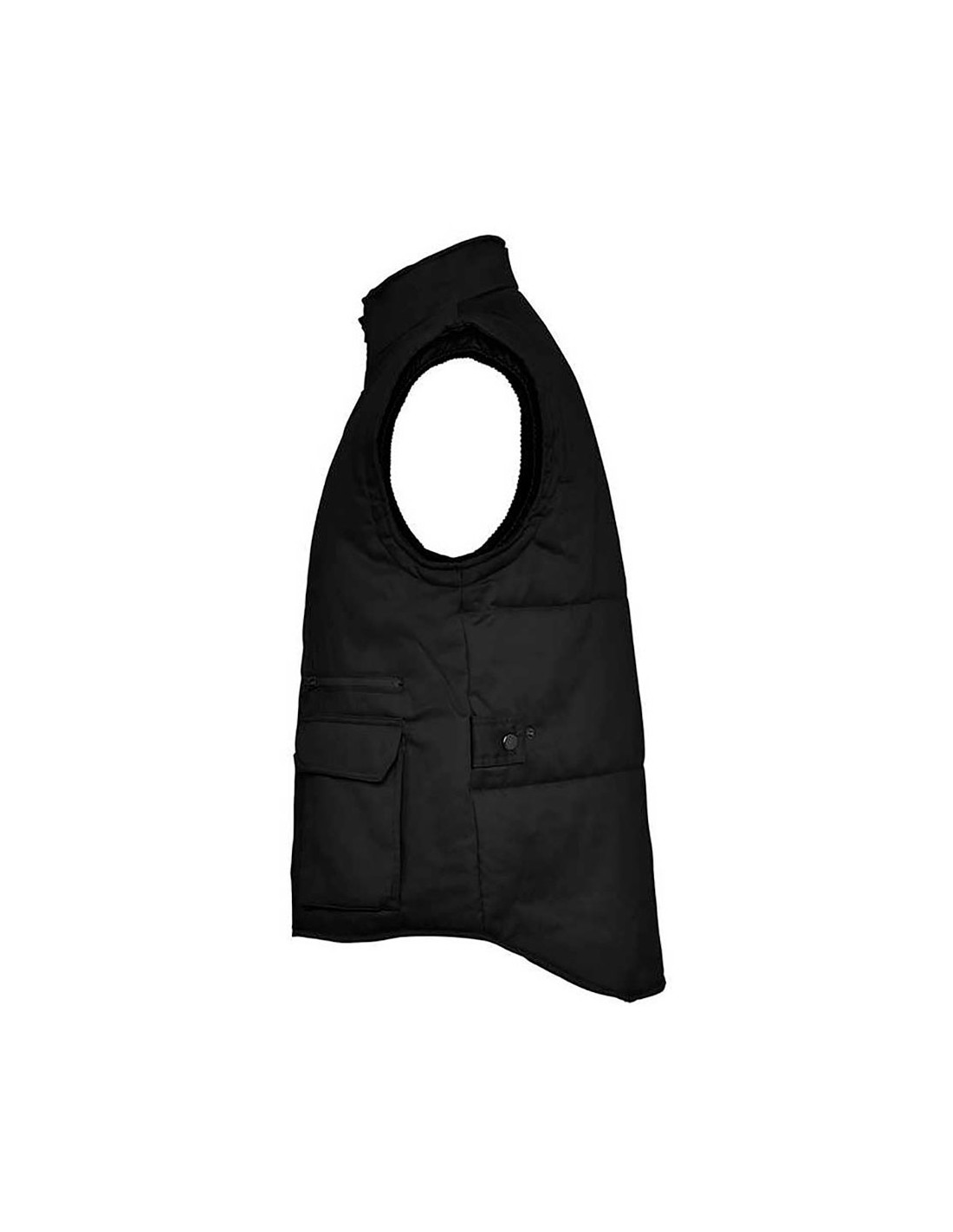 Chaleco laboral almanzor negro t-s, 55 x 64-70 cm, multi bolsillo exterior: 80% poliéster 20% algodón, 200 g/m interior: 100% poliéster acolchado 170 g/m cremallera central con trabilla y velcro, bolsillo exterior para móvil lado derecho dos bolsillos frontales con fuelle y aberturas laterales, dos depósitos para bolígrafos, bolsillo con cremallera, bolsillo interior con velcro, cortavientos en las bocamangas, bajo posterior con faldón, tapetas ajustables en laterales con botones a presión
