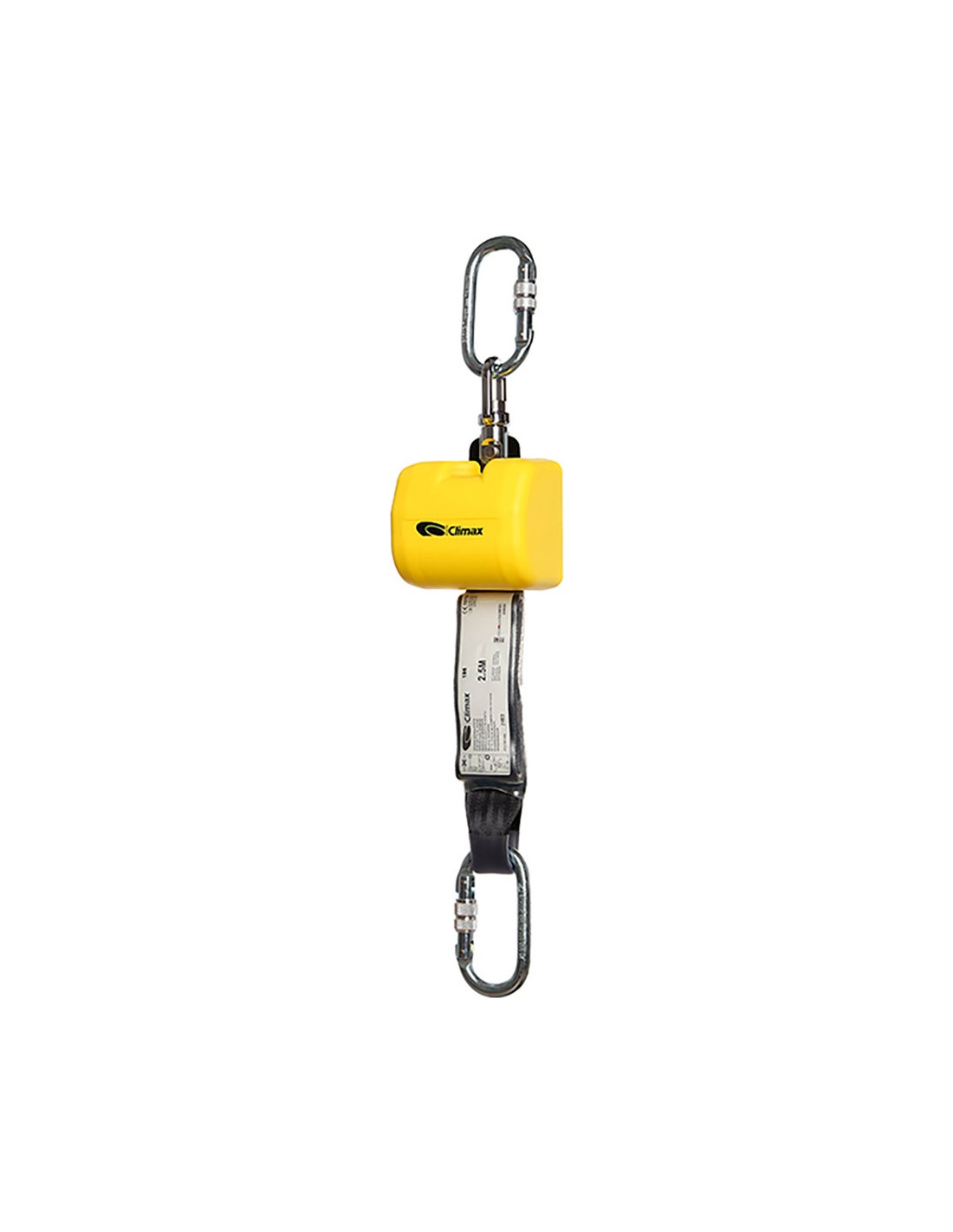 Dispositivo anticaídas retráctil climax 2,5 provisto de frenado automático por inercia. permite el desplazamiento del usuario en una amplia zona de trabajo, ofreciéndole protección contra eventuales caídas de altura. consta de: 2 conectores simétricos de bloqueo manual de rosca. diámetro de apertura: 16 mm. utilizados para realizar anclajes o para conectarse en estructuras. 1 conector quitavueltas. carcasa en abs. absorbedor de energía integrado para reducir la fuerza de frenado a menos de 23 kn. elemento de amarre a partir de cinta de poliamida de 49 mm de ancho nominal. longitud: 2,5 m. la carga máxima que puede soportar el equipo es de 100 kg