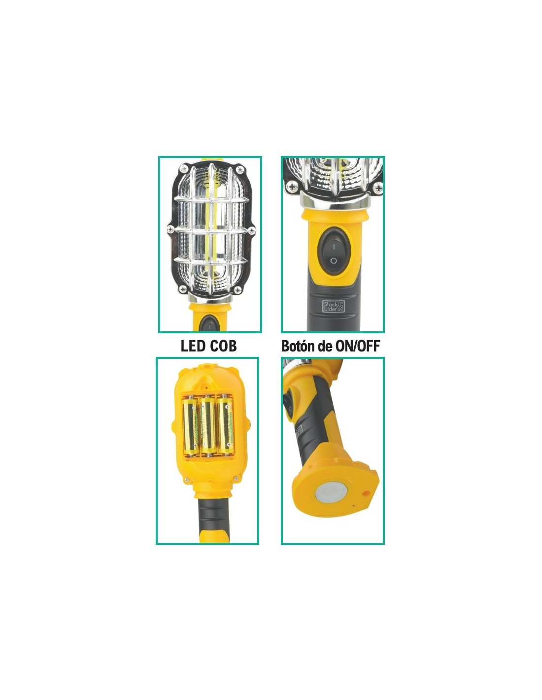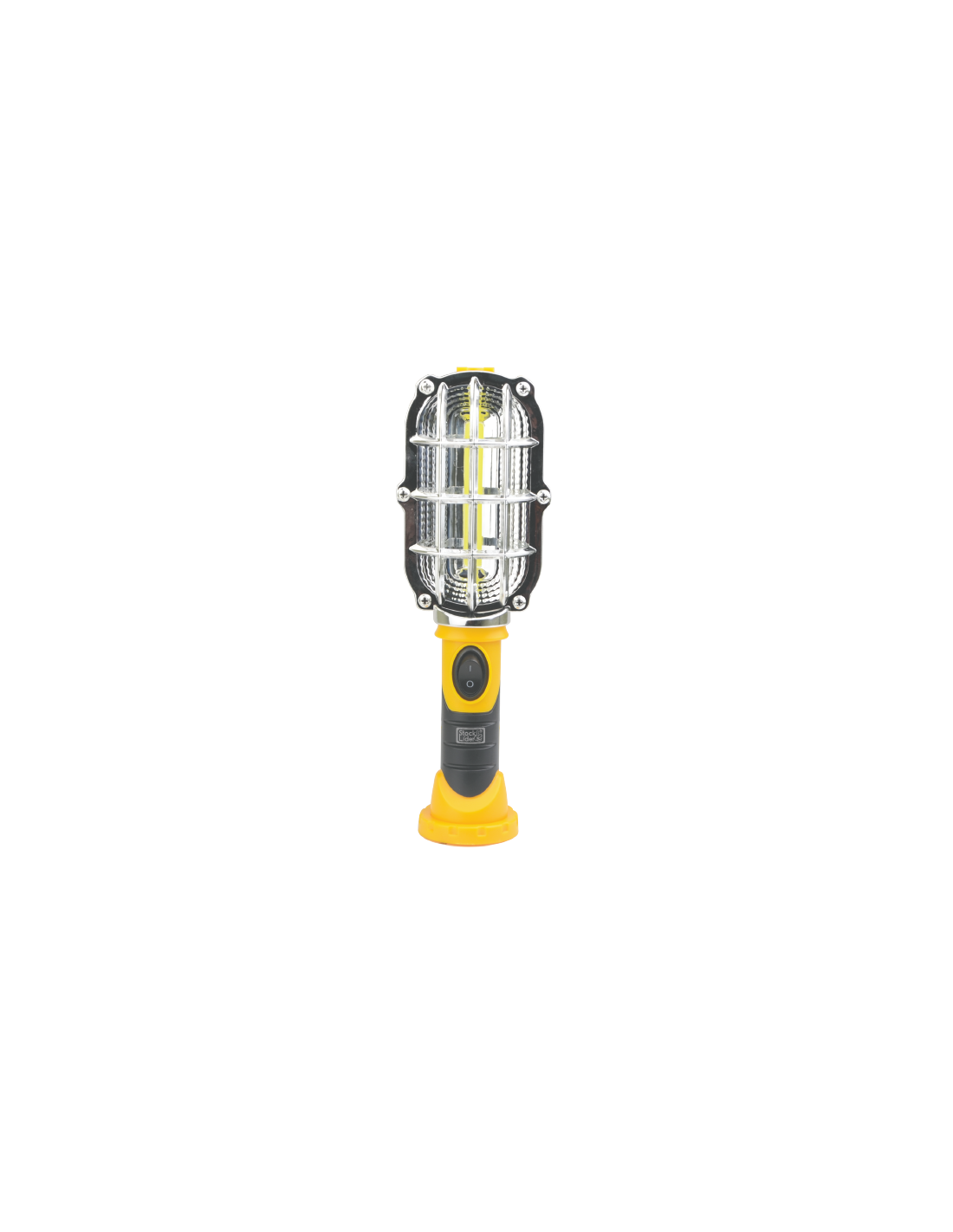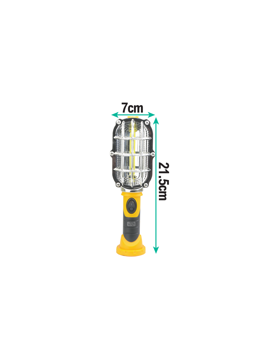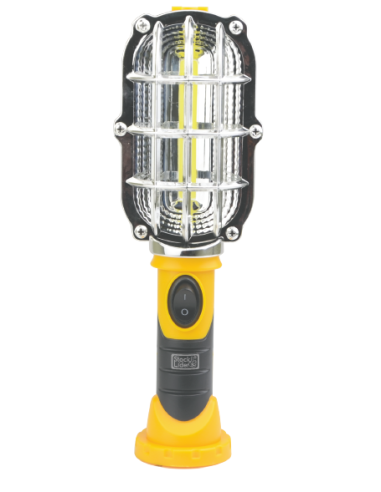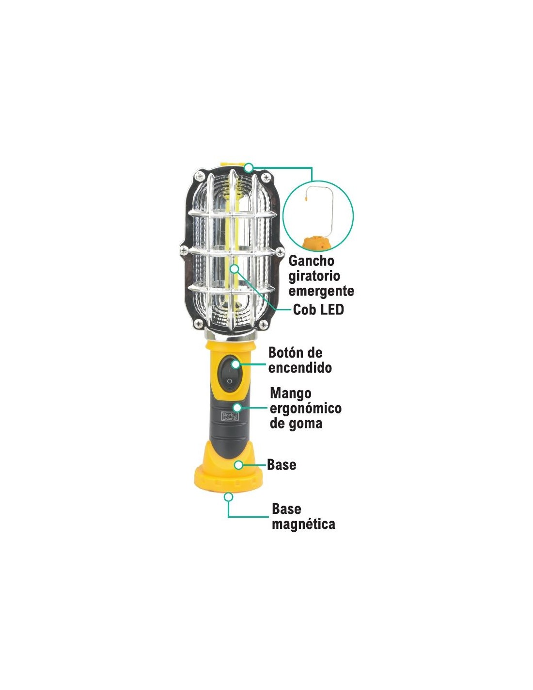 Equipada con protección de pantalla y un mango ergonómico de goma, esta lámpara combina resistencia y comodidad. Su gancho giratorio emergente permite colgarla fácilmente en cualquier lugar, mientras que su base magnética ofrece una sujeción firme en superficies metálicas, liberando tus manos para trabajar con mayor comodidad.