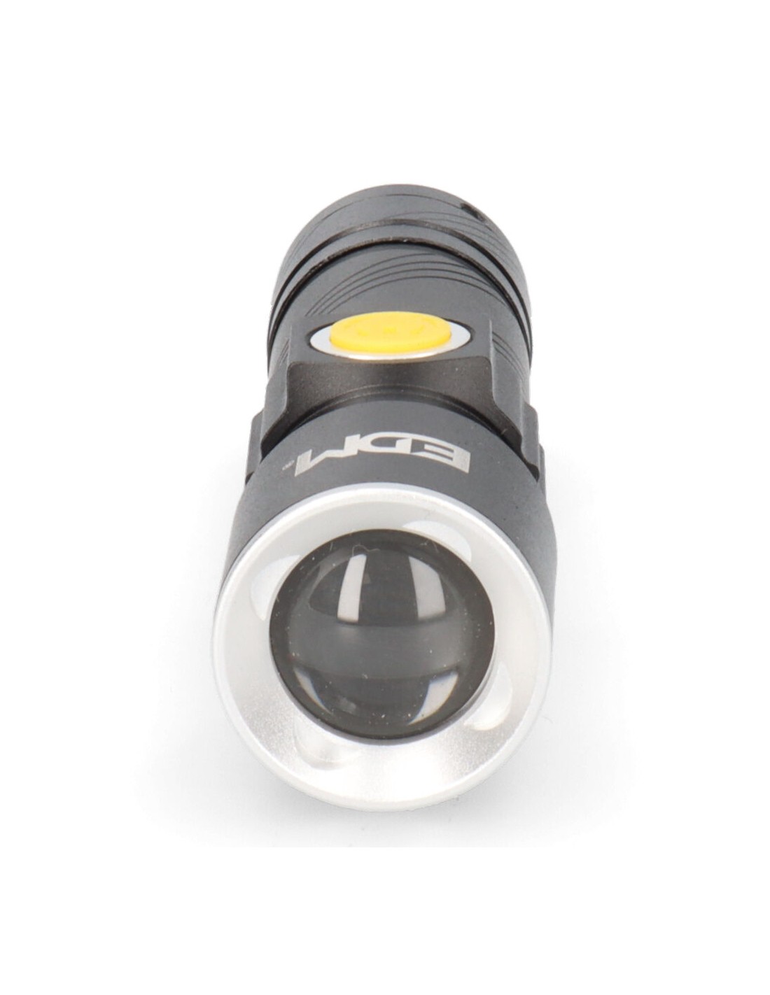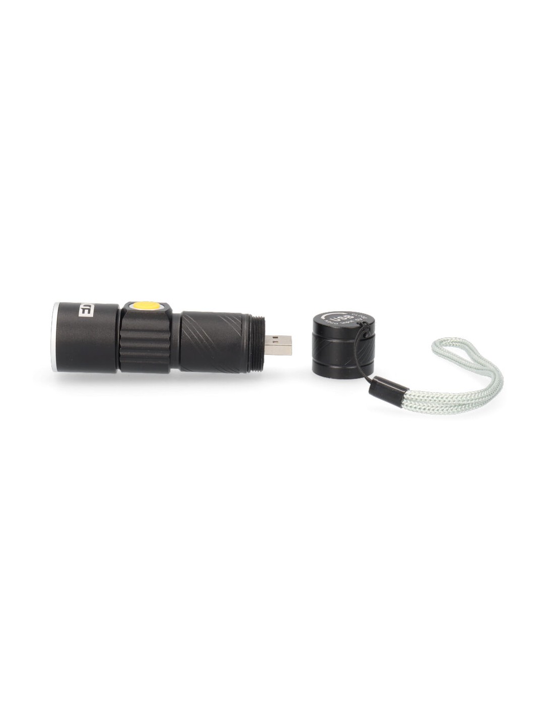 Mini linterna con zoom 1 led 3w 9.000k recargable con usb. bateria 350mah de litio incluida (carga en 2 horas). color negro. luminosidad 3 modos: 120lm/40lm/ flash. material: aluminio. medida: ø2,6x9,5cm . resistencia a salpicaduras. ip44. presentado en expositor de 12 unidades