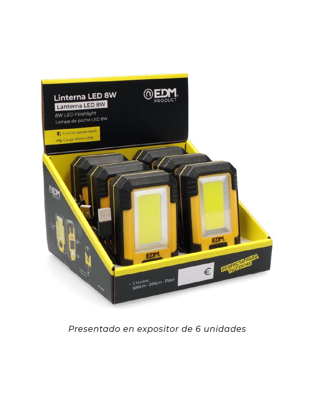 Linterna led cob 8w 6500k 3 modos: 450lm / 130lm / flash.con imán trasero + gancho+ soporte y agujero para colgar. recargable con usb,incluye cable de carga tipo c.función power bank. 8h de carga aprox. hasta 22h de autonomia.batería 4000mah de litio incluida. medida: 6,5 x 3,4 x 11cm. ip44. presentacion en expositor de 6 unidades