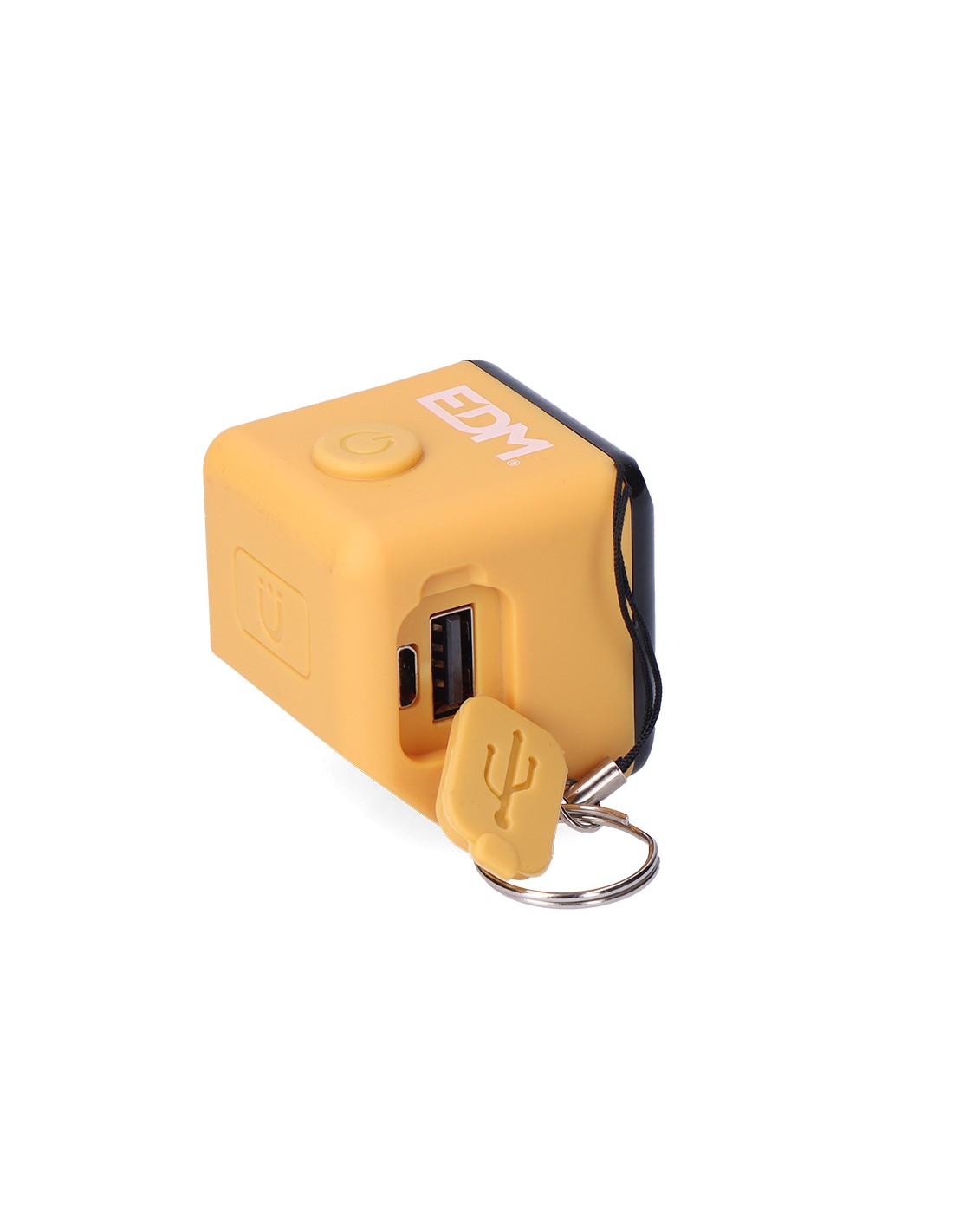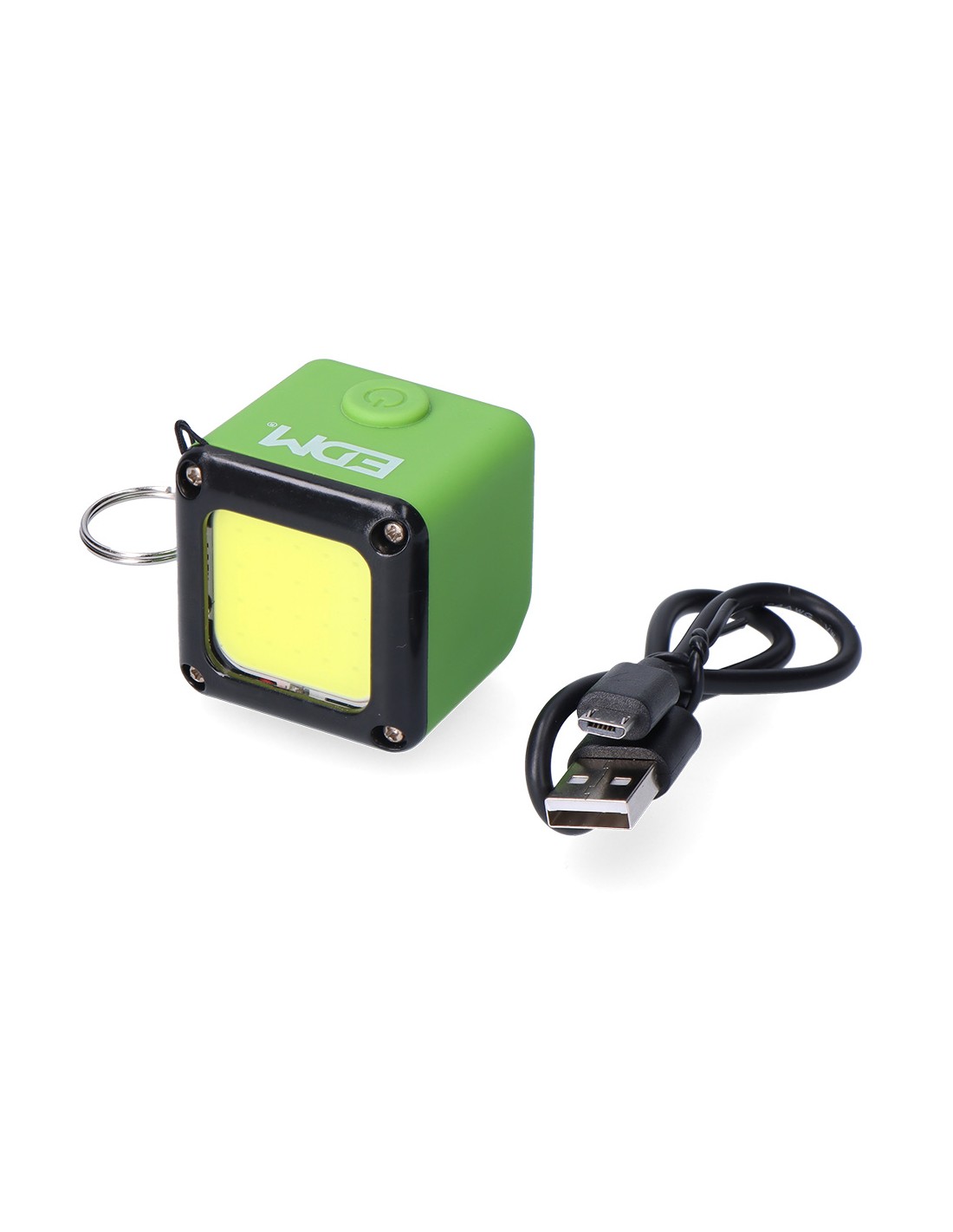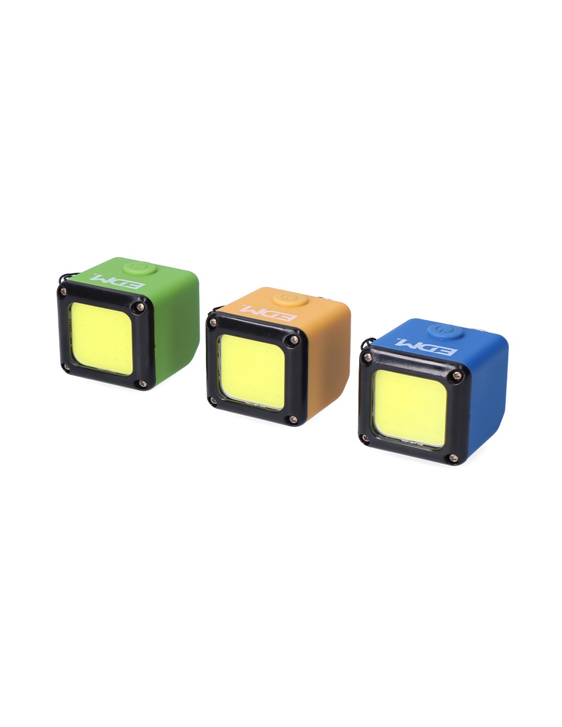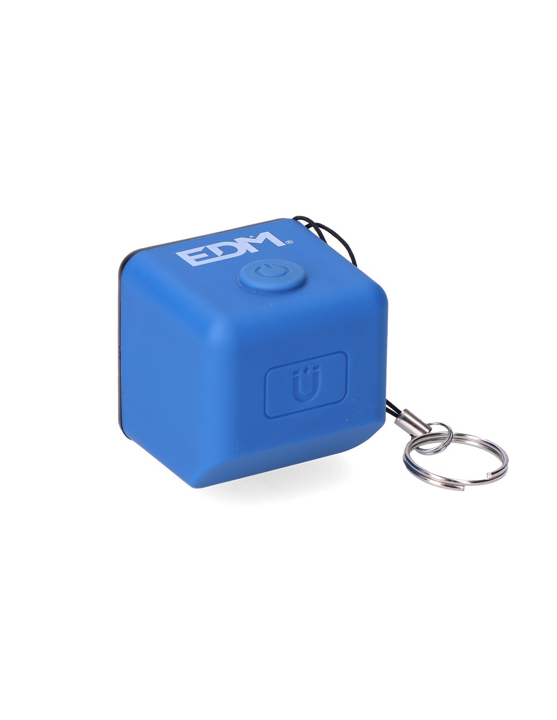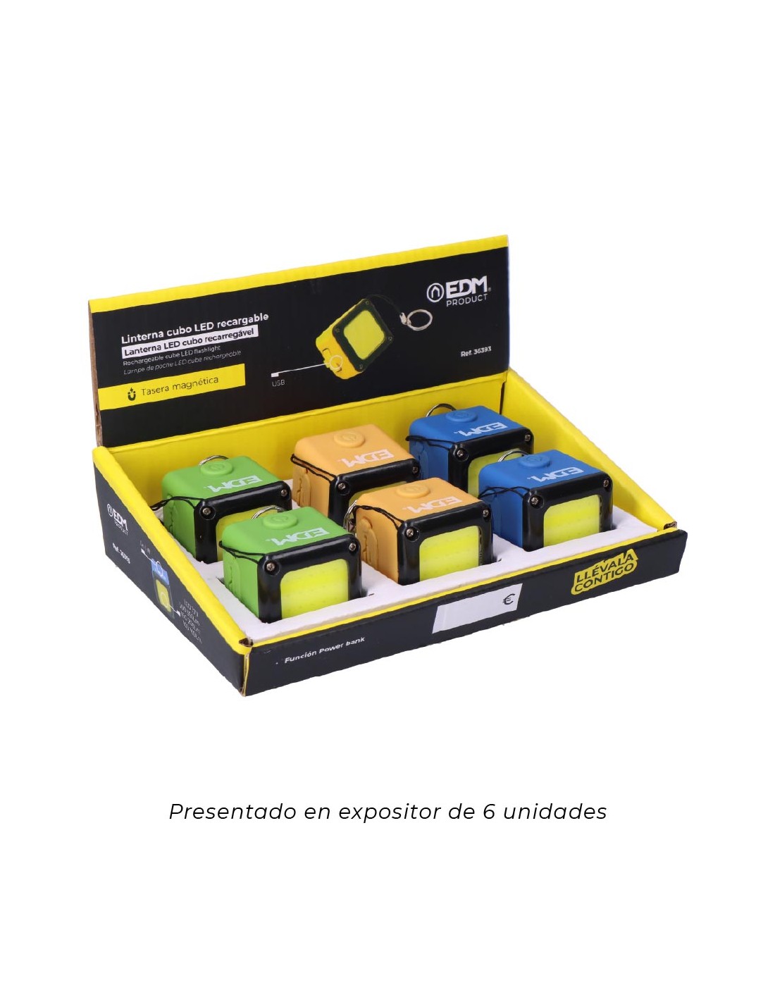 Linterna cubo led recargable. cob 3w 300-350lm / 150-200lm / 100-150lm 6500k con usb + iman y argolla. bateria: 1000mah, funcion power bank. cargador usb, cable micro usb incluido. llavero. colores surtidos: verde, azul y amarillo.material: abs/goma. duración aprox 13h con el modo bajo. ip20. medidas:40x40x40mm. presentación en expositor de 6 unidades