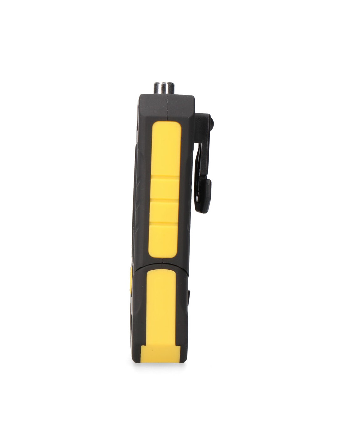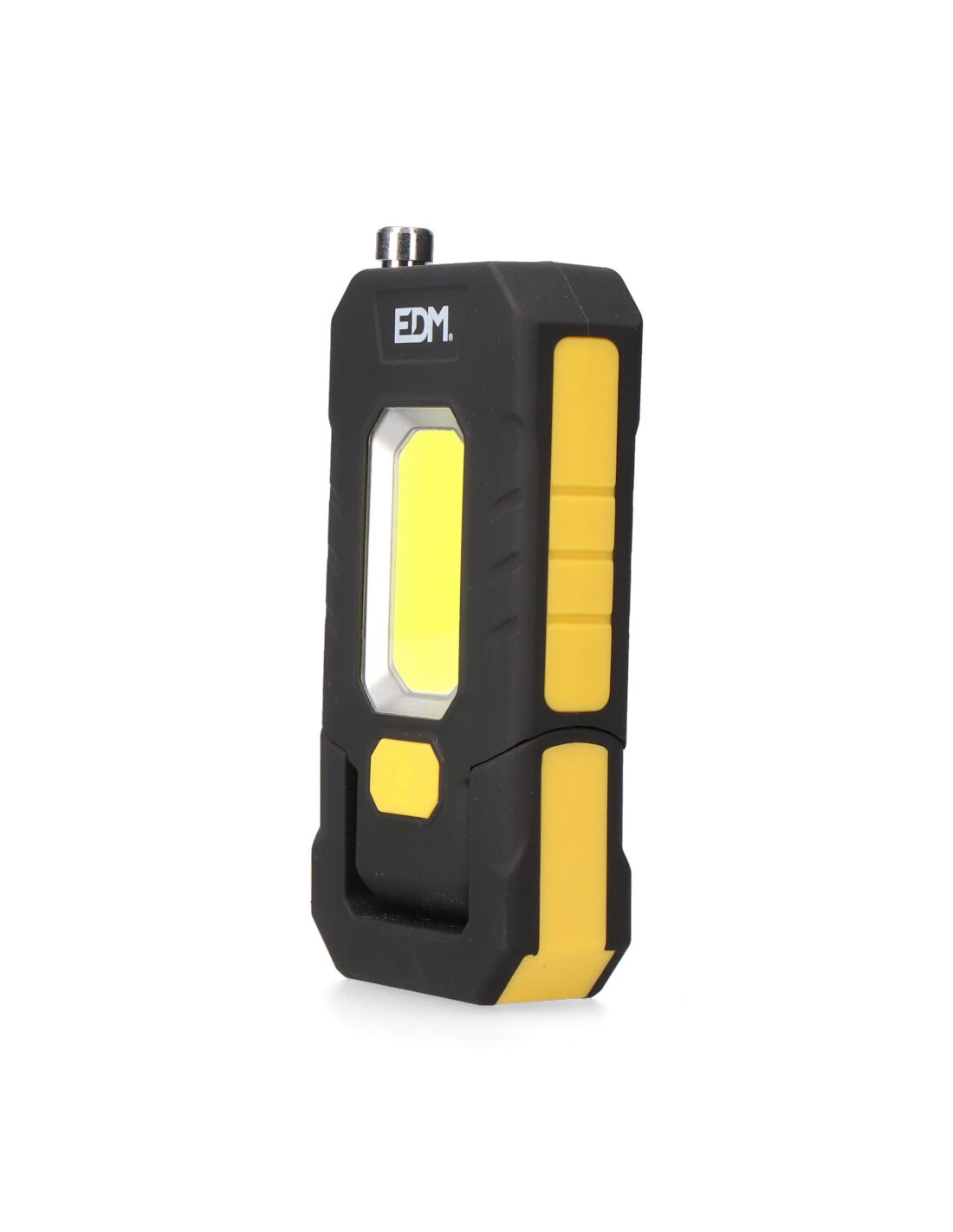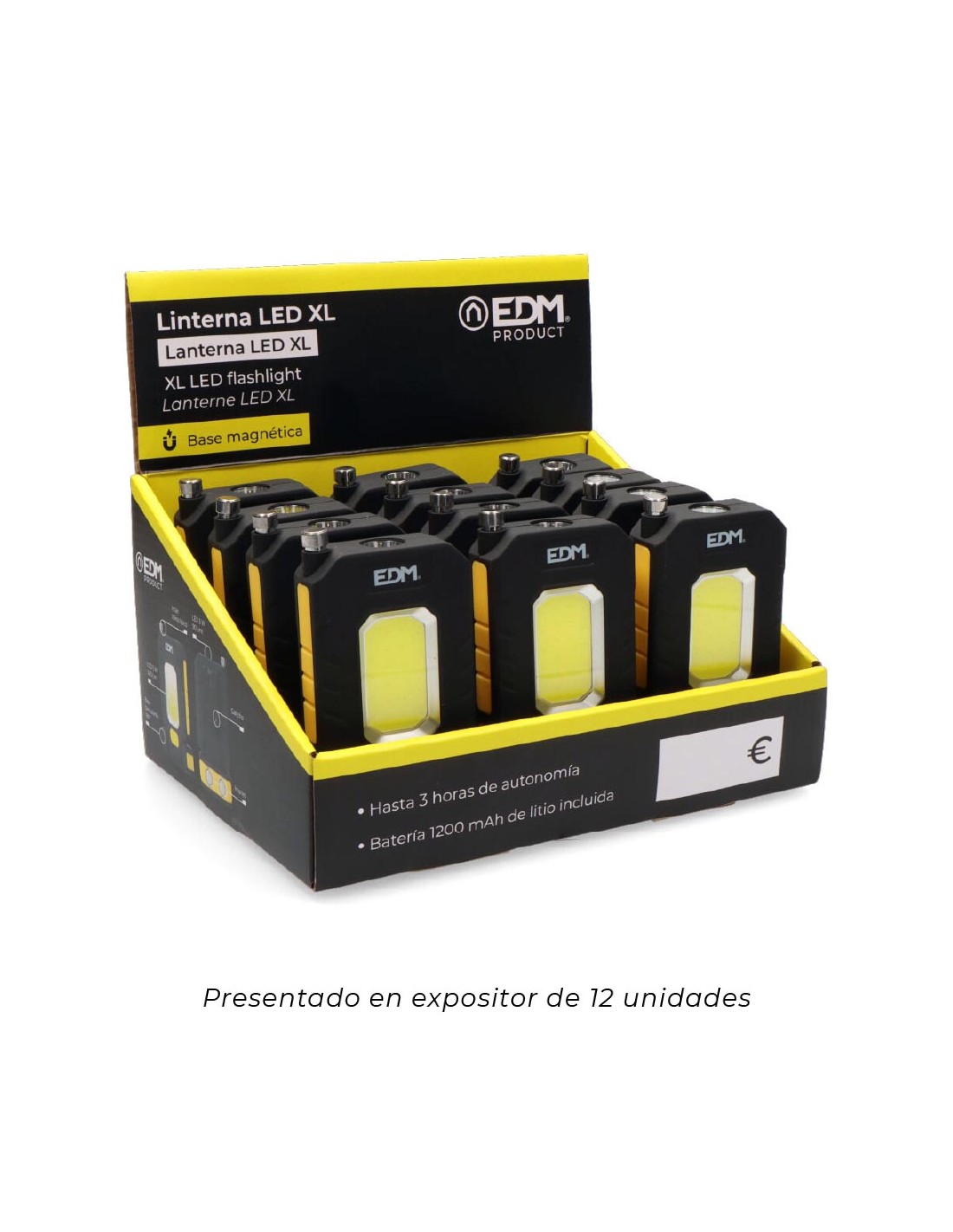 Linterna led xl, led 3w 90lm + led 5w 300lm. linterna con imán telescópico. batería de 1200mah de litio incluida, cable micro usb icluido. tiempo de funcionamiento aprox 3h, tiempo de carga 3,5h, con gancho y base basculate 180° imantada, medidas:6x3,5x12,5cm. presentado en expositor de 12 unidades