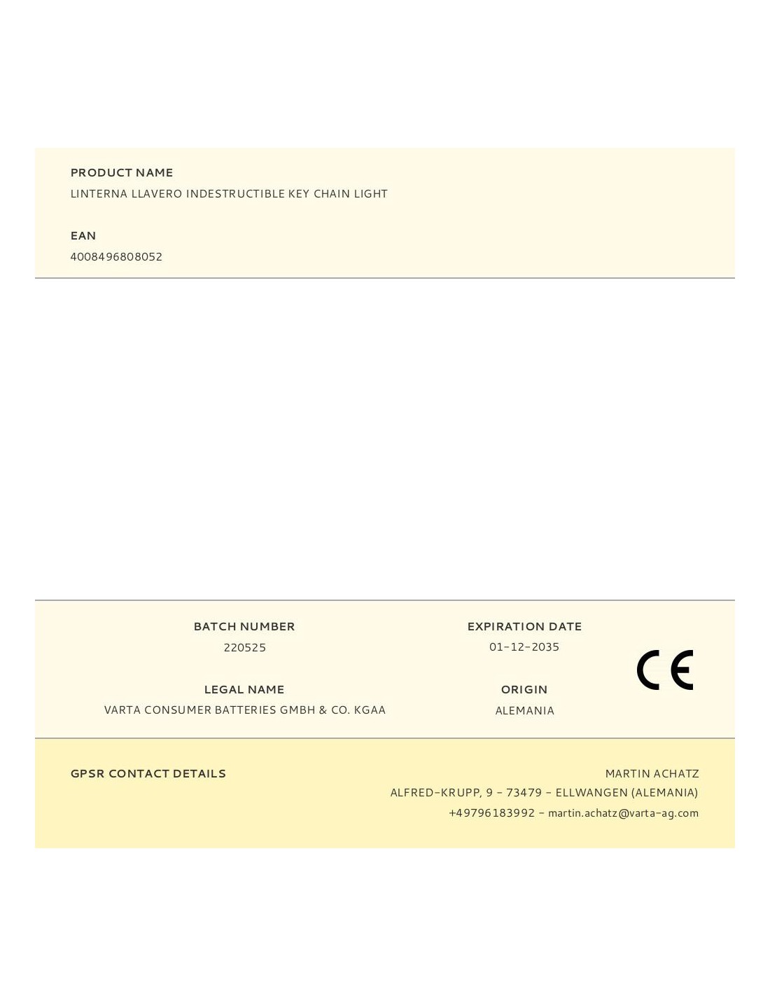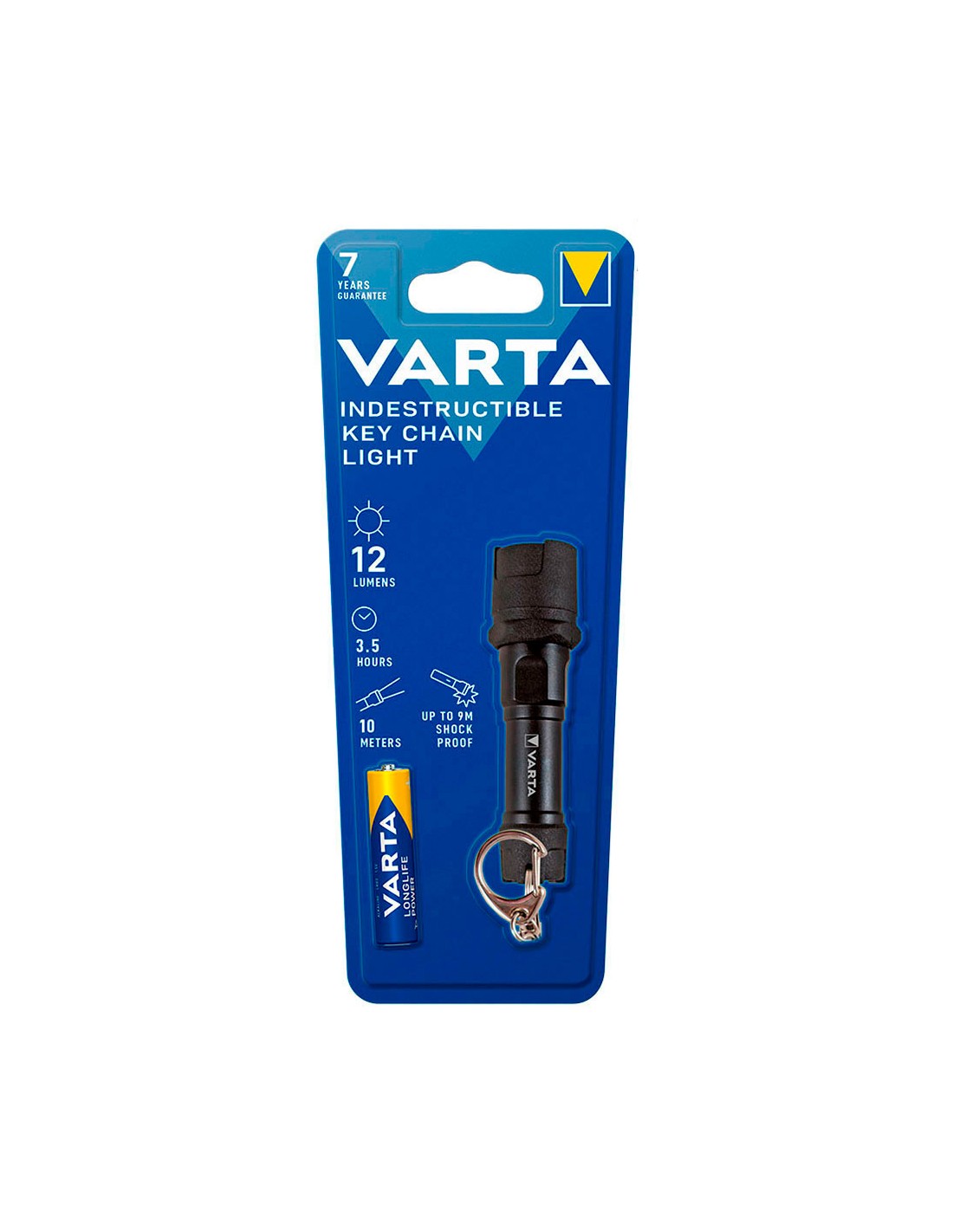 Linterna varta indestructible key chain light. led blanco de 5mm que ofrece un haz de luz mejor. increiblemente robusta (resiste caidas de 9m) y resistente al agua (grado de protección ipx4). cabezal y tapa posterior de goma para conseguir maxima durabilidad. incluye llavero. peso con pilas 30.3g. longitu 83mm. diametro del cabezal. 23mm. rango del foco hasta 10m. duracion hasta 3.5h. potencia total de alumbrado hasta 12 lumenes. fuente de luz: 5mm led. 1 high energy aaa incluida.