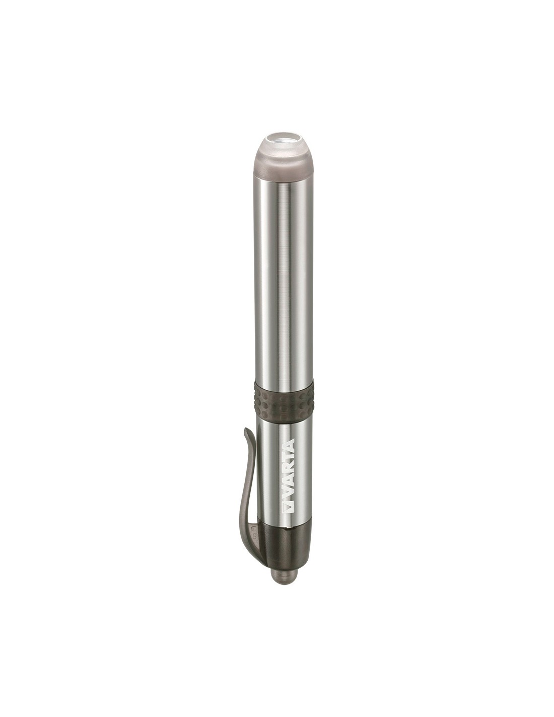 Linterna varta pen light. linterna extremadamente fina y ligera con carcasa de aluminio. led blanco de 5mm que ofrece un haz de luz mejor. practica pinza de sujecion. peso con pilas 27.5g, longitud 117mm, diametro del cabezal 14mm. rango del foco: hasta 11m. duracion hasta 15h. potencia total del alumbrado hasta 3 lumens. 1xhigh energy aaa incluida