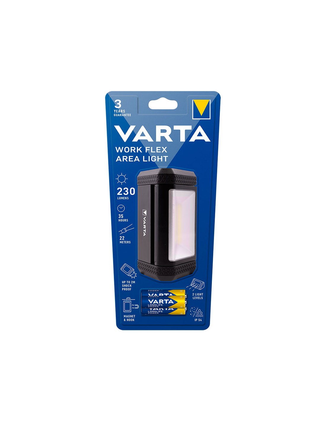 Linterna varta flex area light 230lm alcance 22m duracion hasta 35h funciona con 3xaa incluidas, incluye iman, resistente a caidas de 2m, resistente al agua y polvo ip54, tecnologia led cob para iluminacion optima, lente translucido para una mejor difusión de la luz no deslumbrnate, mango de goma antideslizante, tamaño 11,9cm
