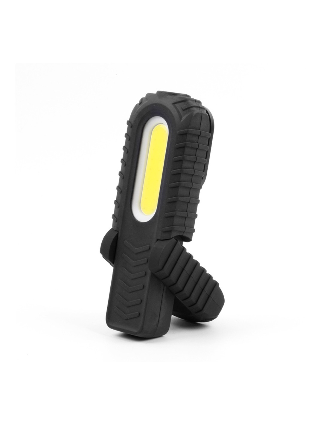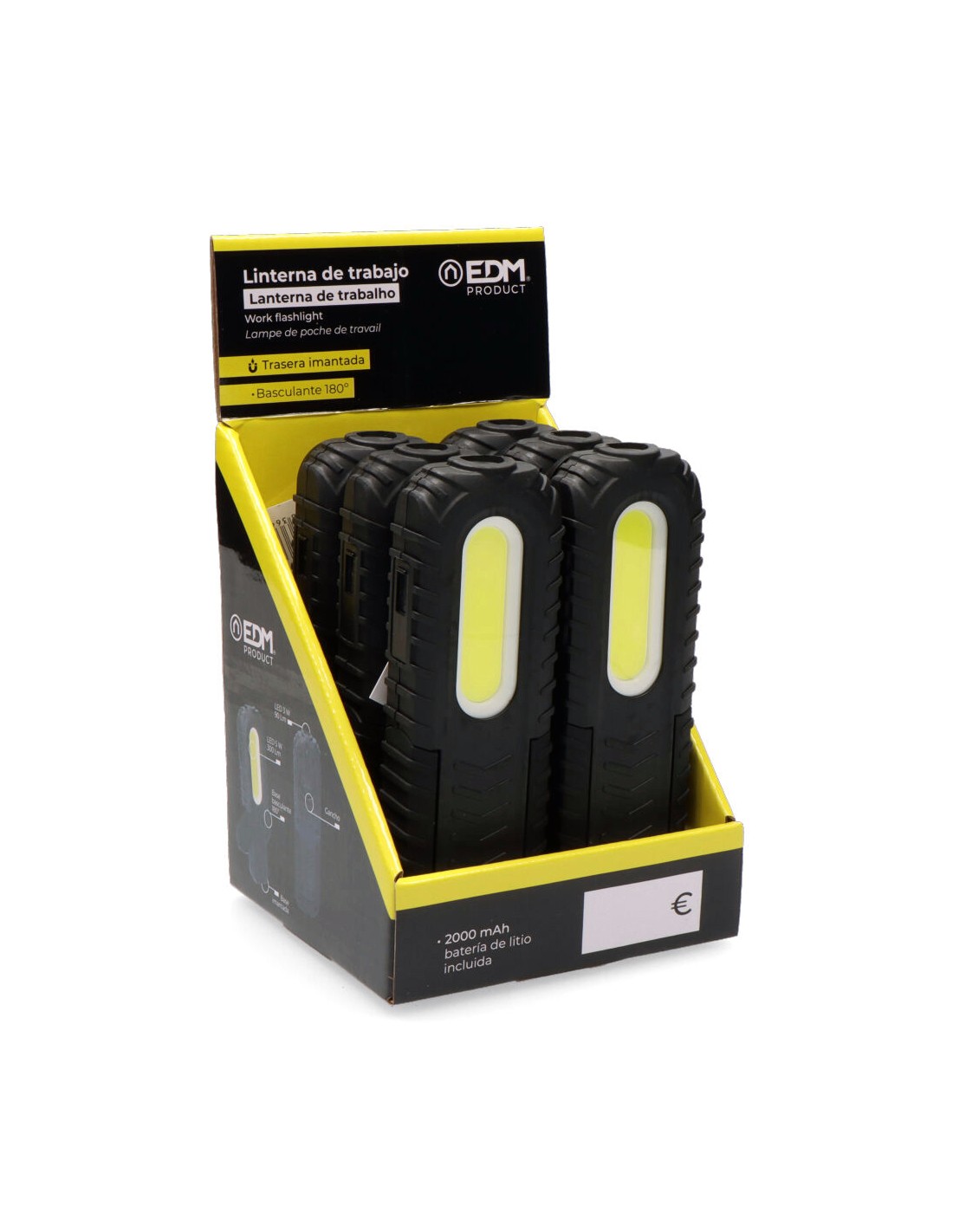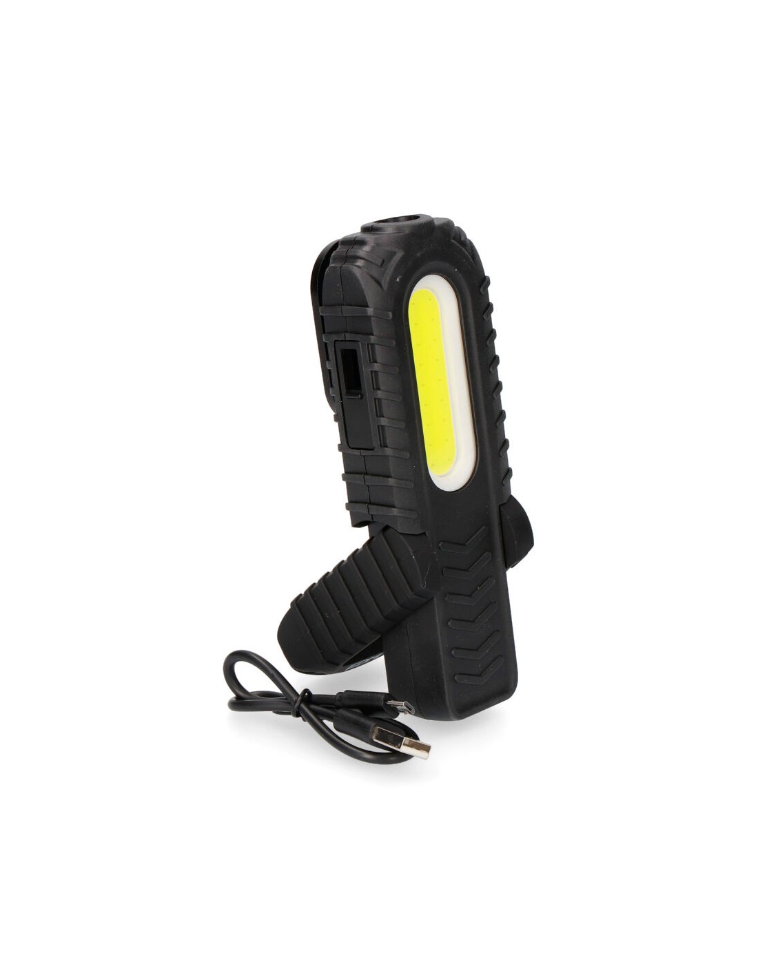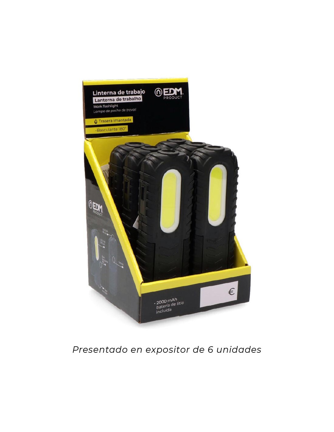 Linterna de trabajo led cob 3w 90lm / 5w 300lm. recargable con cable micro usb incluido.batería de litio incluida de 2000mah. soporte basculante 180° imantado + gancho. linterna antichoque. medida: 5,5x3,5x16,5cm. presentacion en expositor de 6 unidades