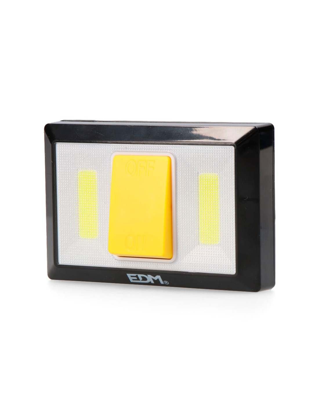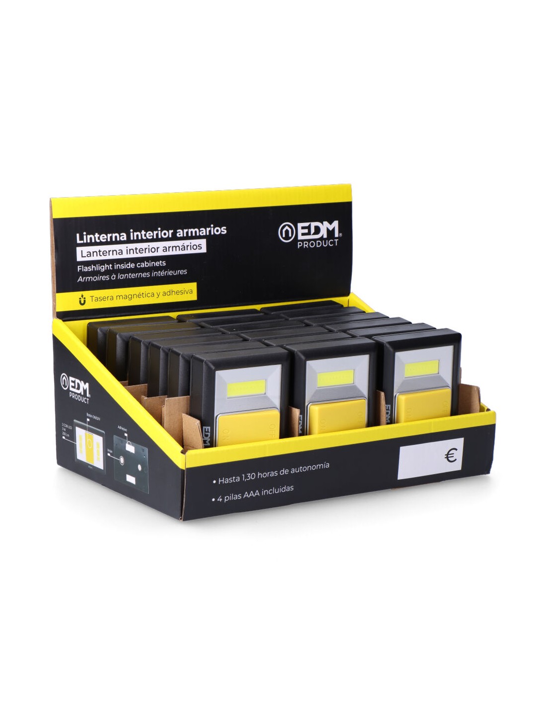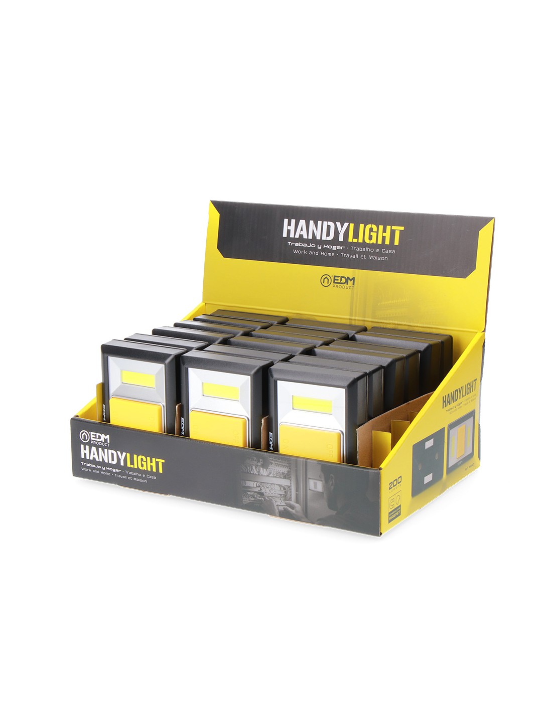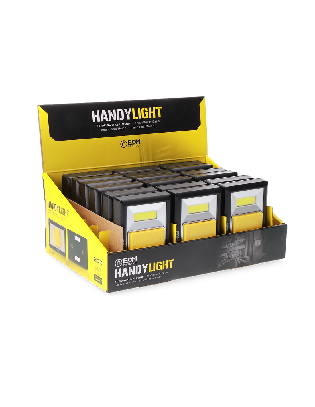 Linterna led handy light, 2 leds 200 lumens con interruptor. con base imantada y adhesiva. 6500k. funciona con 4xaaa (incluidas) medidas: 11,2x7,5x3cm (ancho/fondo/alto) ip20. presentación en expositor de 18 unidades