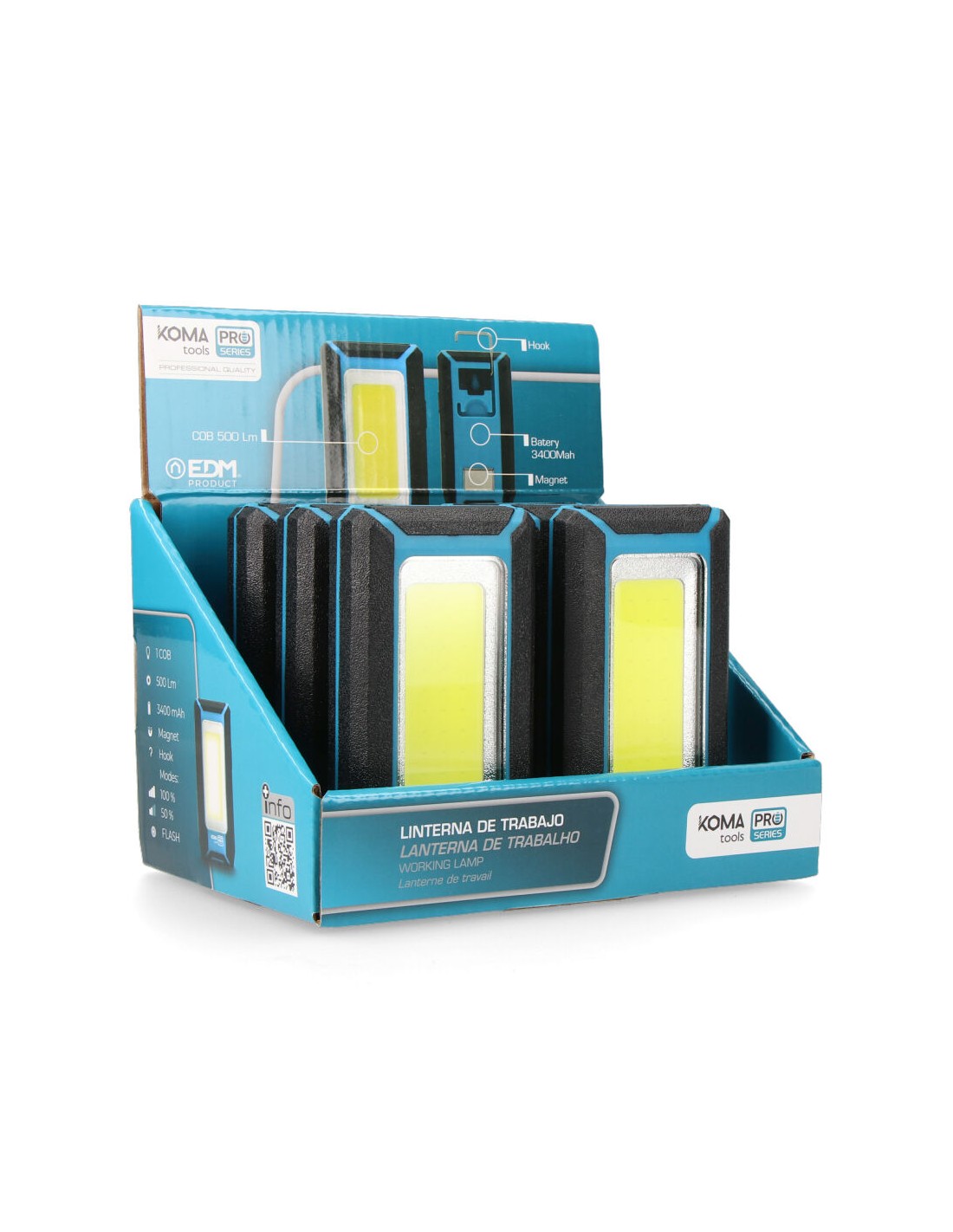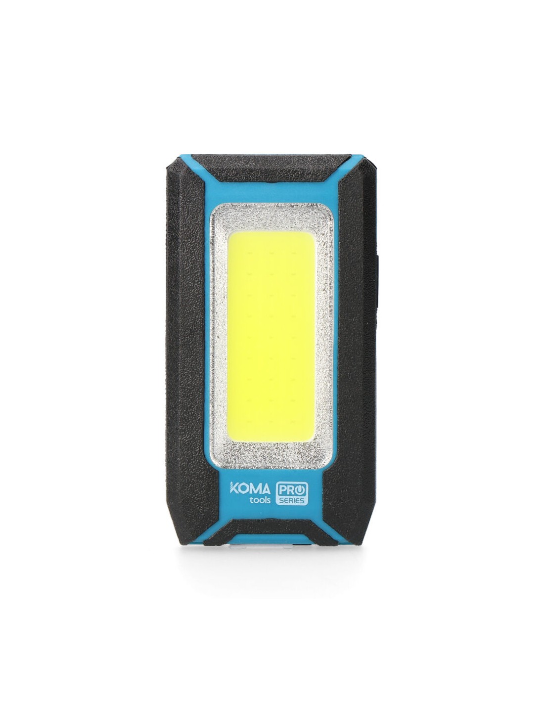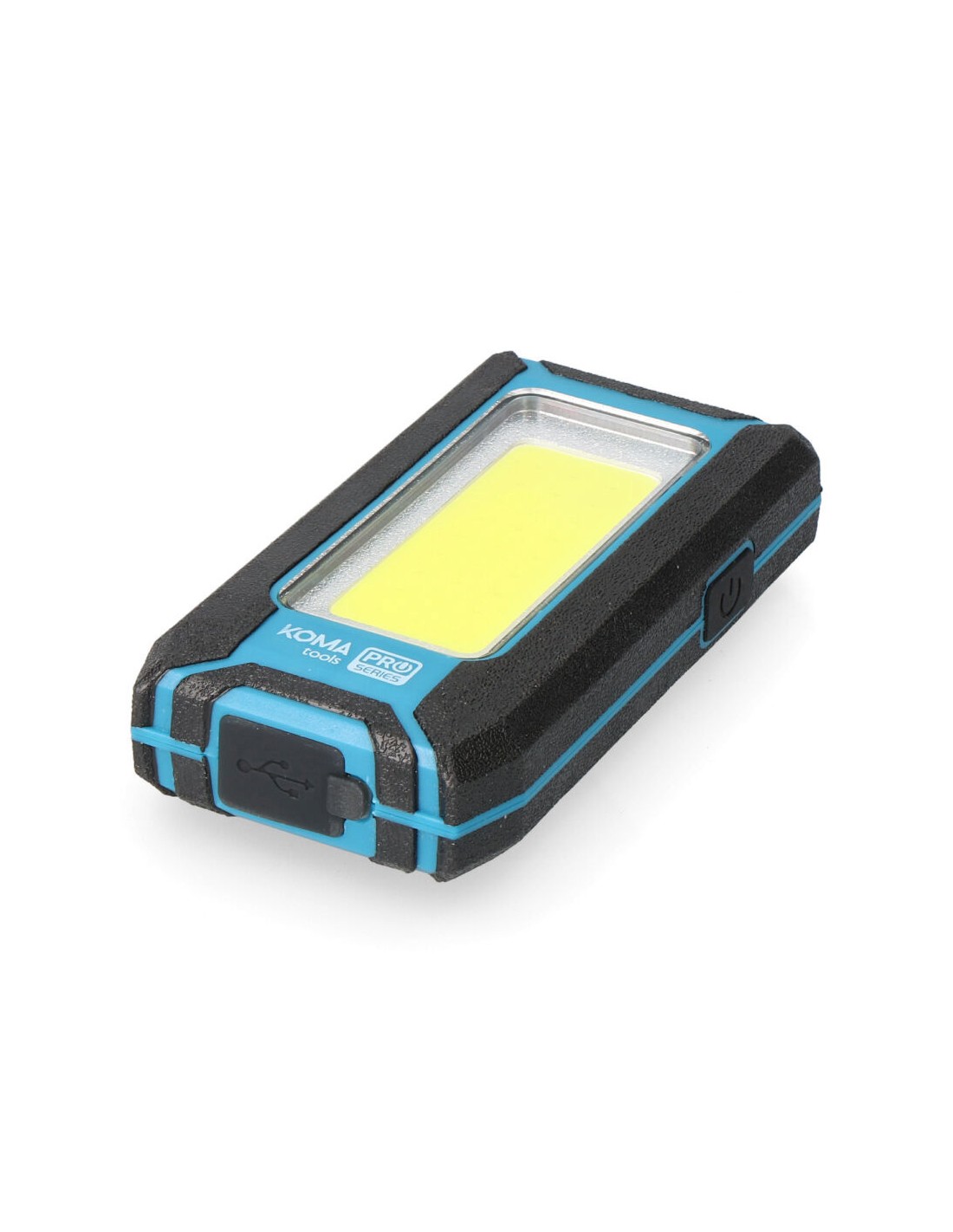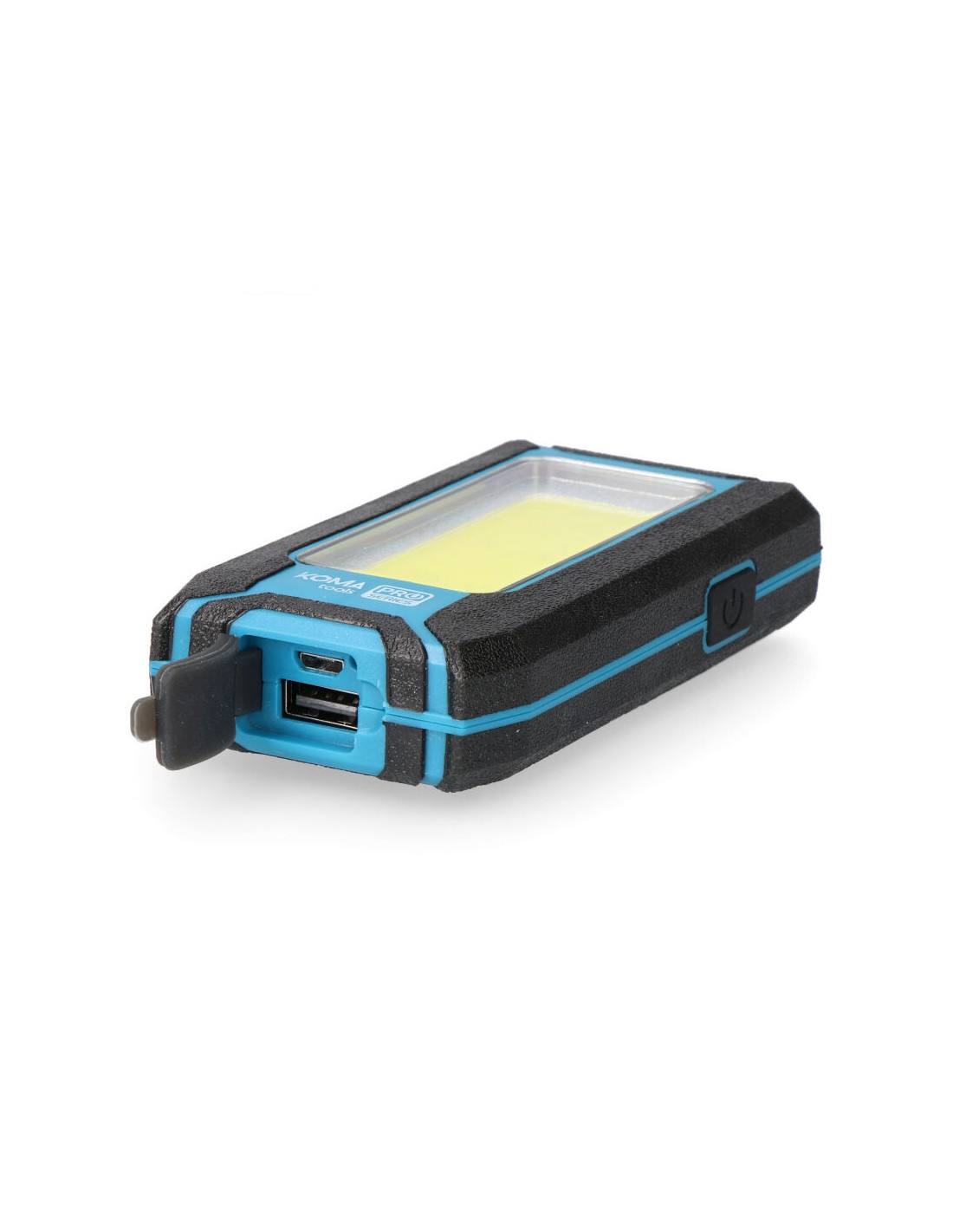 Linterna led de trabajo con gancho + iman. ip44, 8w, 6500k, 3 modos 500lm/250lm/flash. batería 3400mah de litio incluida + cable usb tipo c (incluido). función power bank. carga en 8h, con una autonomía de 8h. medida: 6x2,3x112. koma tools