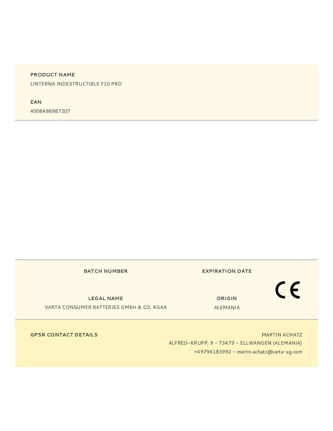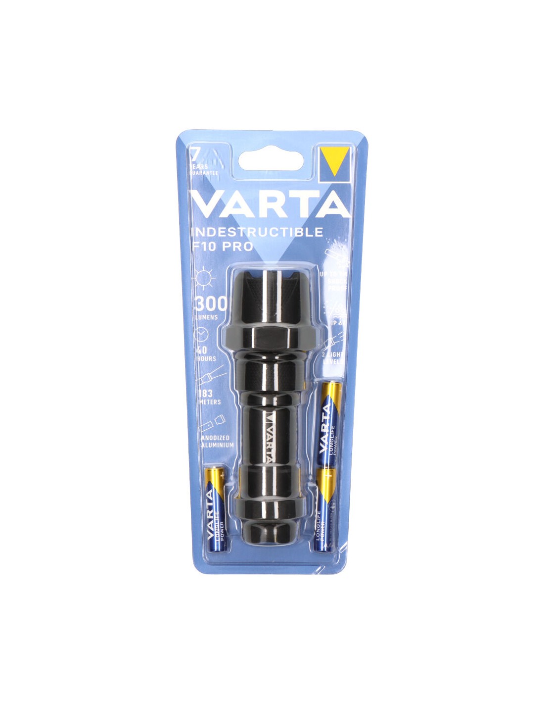 Linterna indestructible f10 pro varta. 6w 300lm, duracion hasta 40h, rango de foco hasta 183m, funciona con 3xaaa incluidas. linterna extremadamente robusta a prueba de caida de 9m, con el cabezal y la parte trasera de goma amortiguadora, calificacion de resistencia impacto ik08 (iec 62262), resistente al agua y polvo ip67, 2 potencias de luz. longitud 13,8cm cabezal ø4,35cm