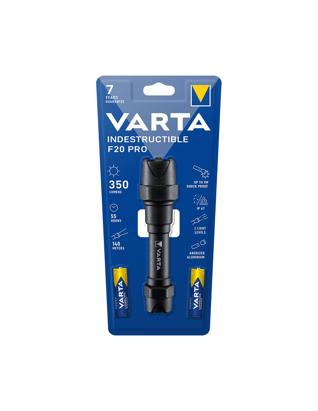 Linterna indestructible f20 pro varta. 6w 350lm, duracion hasta 55h, rango de foco hasta 140m, funciona con 2xaa incluidas. linterna extremadamente robusta a prueba de caida de 9m, con el cabezal y la parte trasera de goma amortiguadora, calificacion de resistencia impacto ik08 (iec 62262), resistente al agua y polvo ip67, 2 potencias de luz. longitud 16,7cm, ø4,2cm