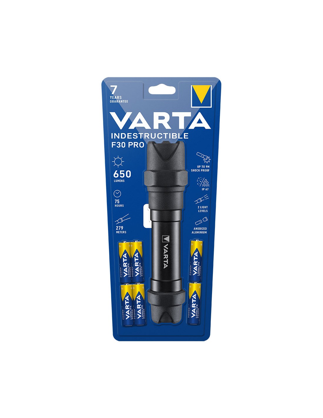 Linterna indestructible f30 pro varta 6w 650lm, duracion hasta 75h, rango de foco hasta 279m, funciona con 6xaa incluidas. linterna extremadamente robusta a prueba de caida de 9m, con el cabezal y la parte trasera de goma amortiguadora, calificacion de resistencia impacto ik08 (iec 62262), resistente al agua y polvo ip67, 2 potencias de luz. longitud 22,8cm, ø5,45cm