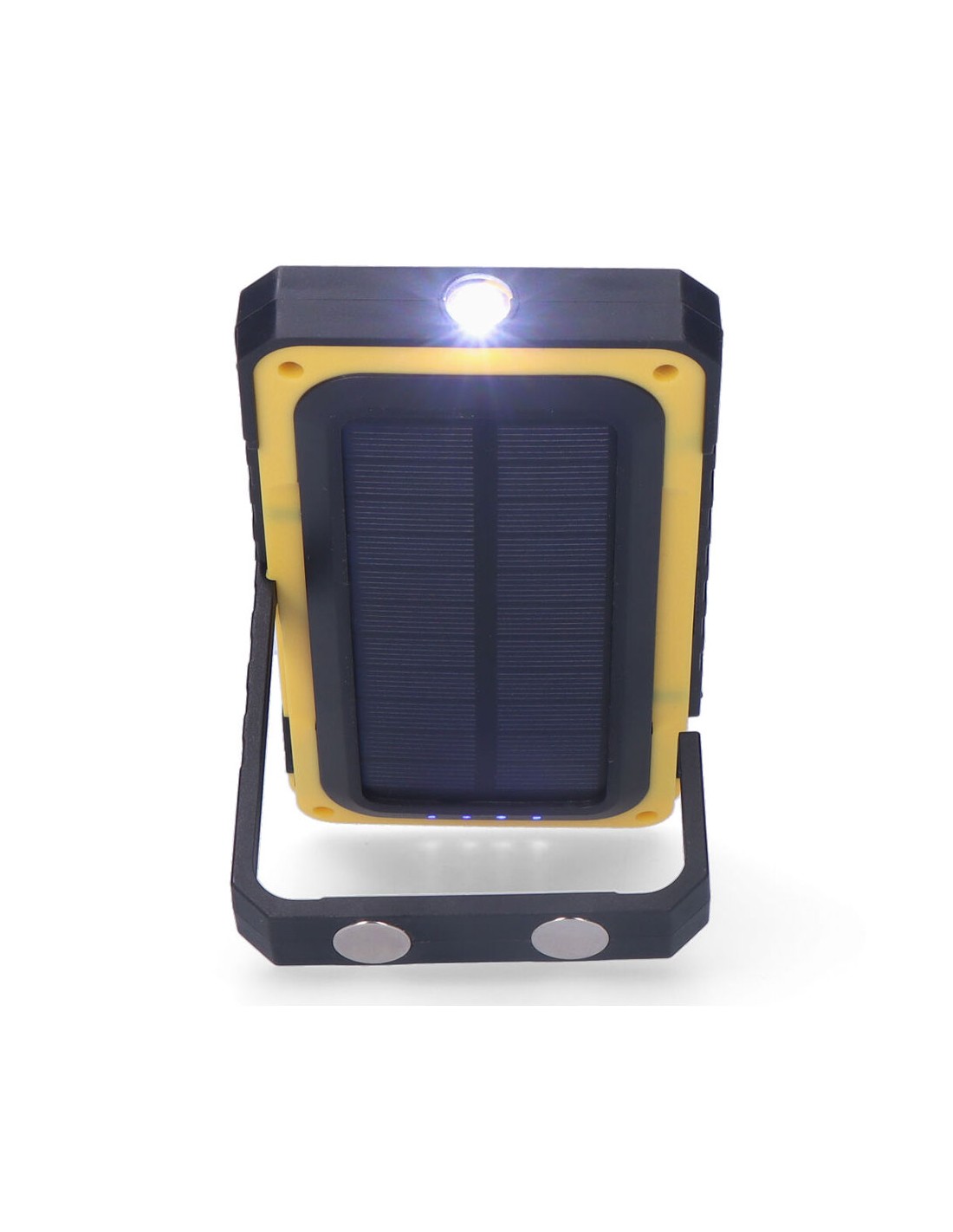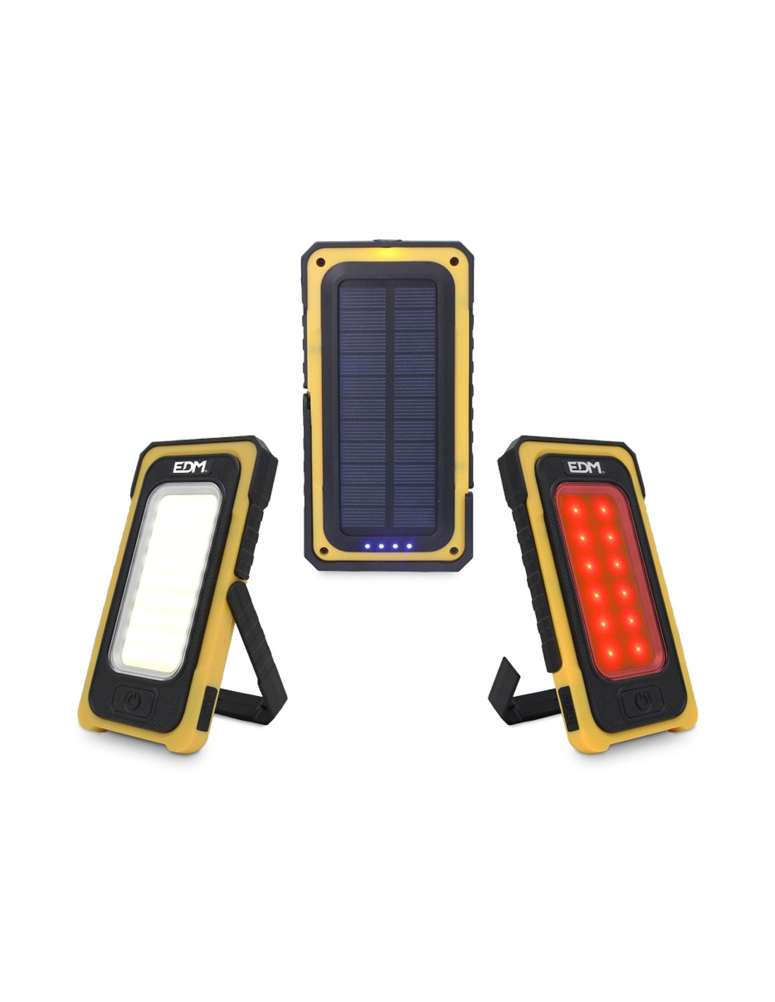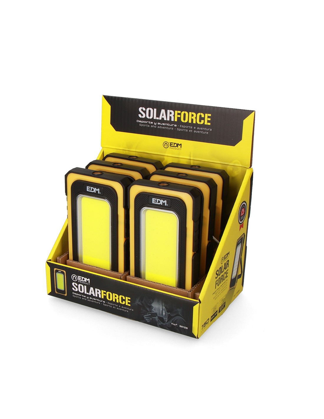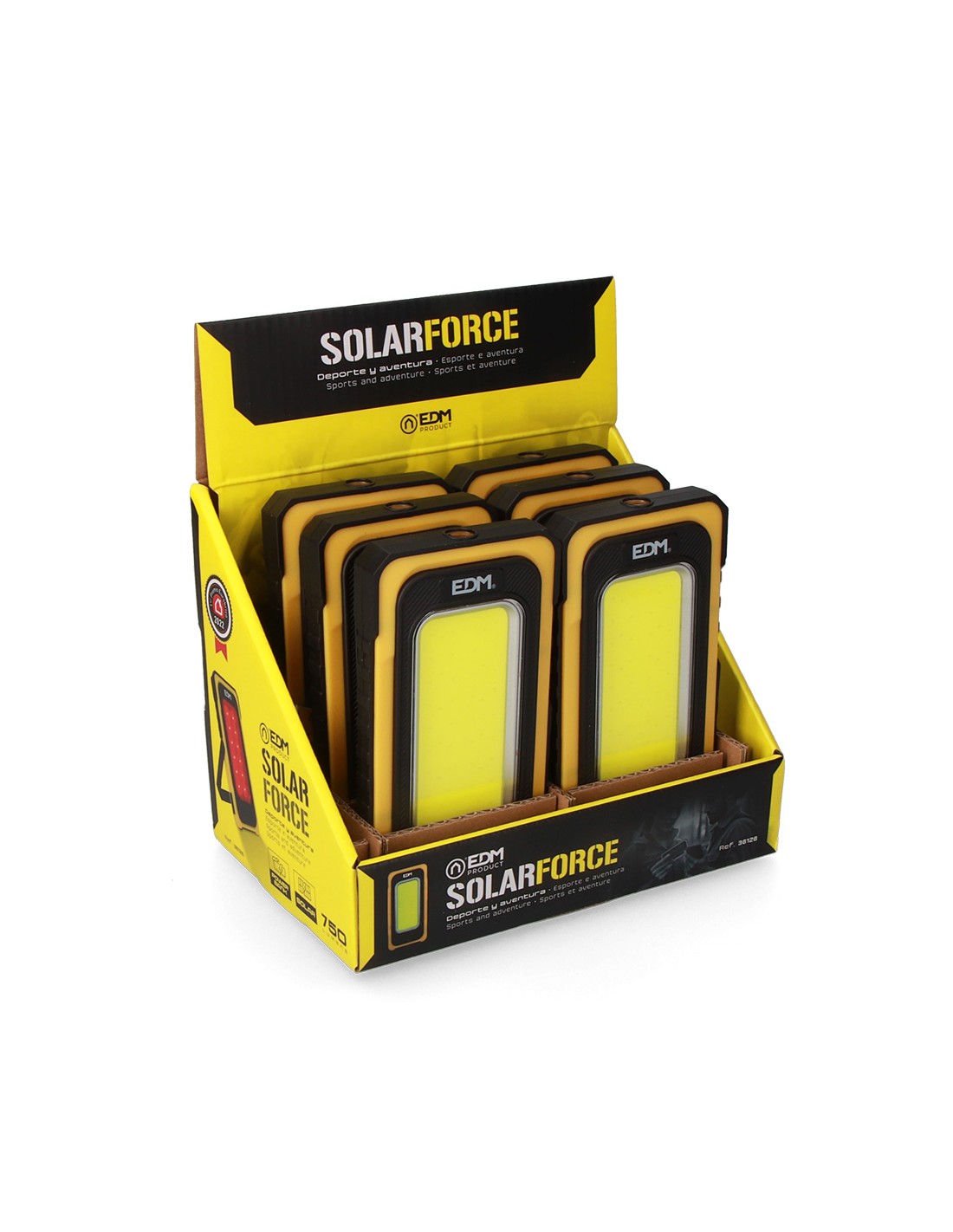 Linterna led solar force recargable por usb o panel solar, con gancho/soporte e imán. led cob 10w 750lm. temperatura color 6.500 k. incluye una luz superior frontal de 3w 70lm, 3 intensidades de luz blanca lumens: 250-450-750. 2 intensidades de luz roja. fija+flash. indicador luminoso de carga. bateria de 4000mah de litio. funcion powerbank.tiempo de carga con cable usb 8.5h.incluye cable de carga tipo c. carga función solar: ideal para situaciones de emergencia, carga aprox 12 horas 20% carga batería aprox. autonomía hasta 14 horas. diseño ultrafino. medidas:72 x 18 x 142 mm. presentacion en expositor de 6 unidades