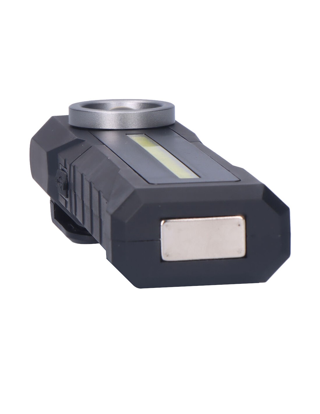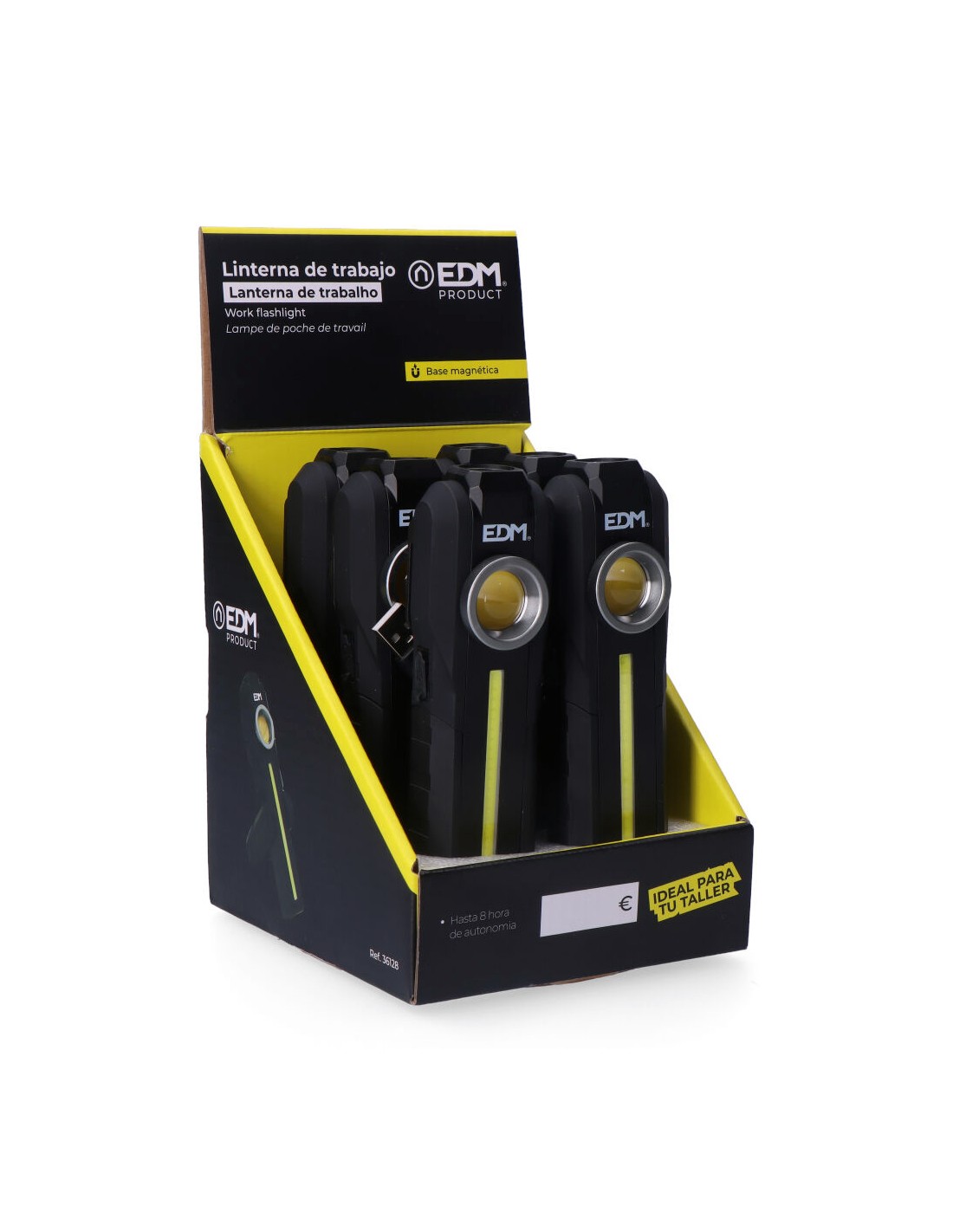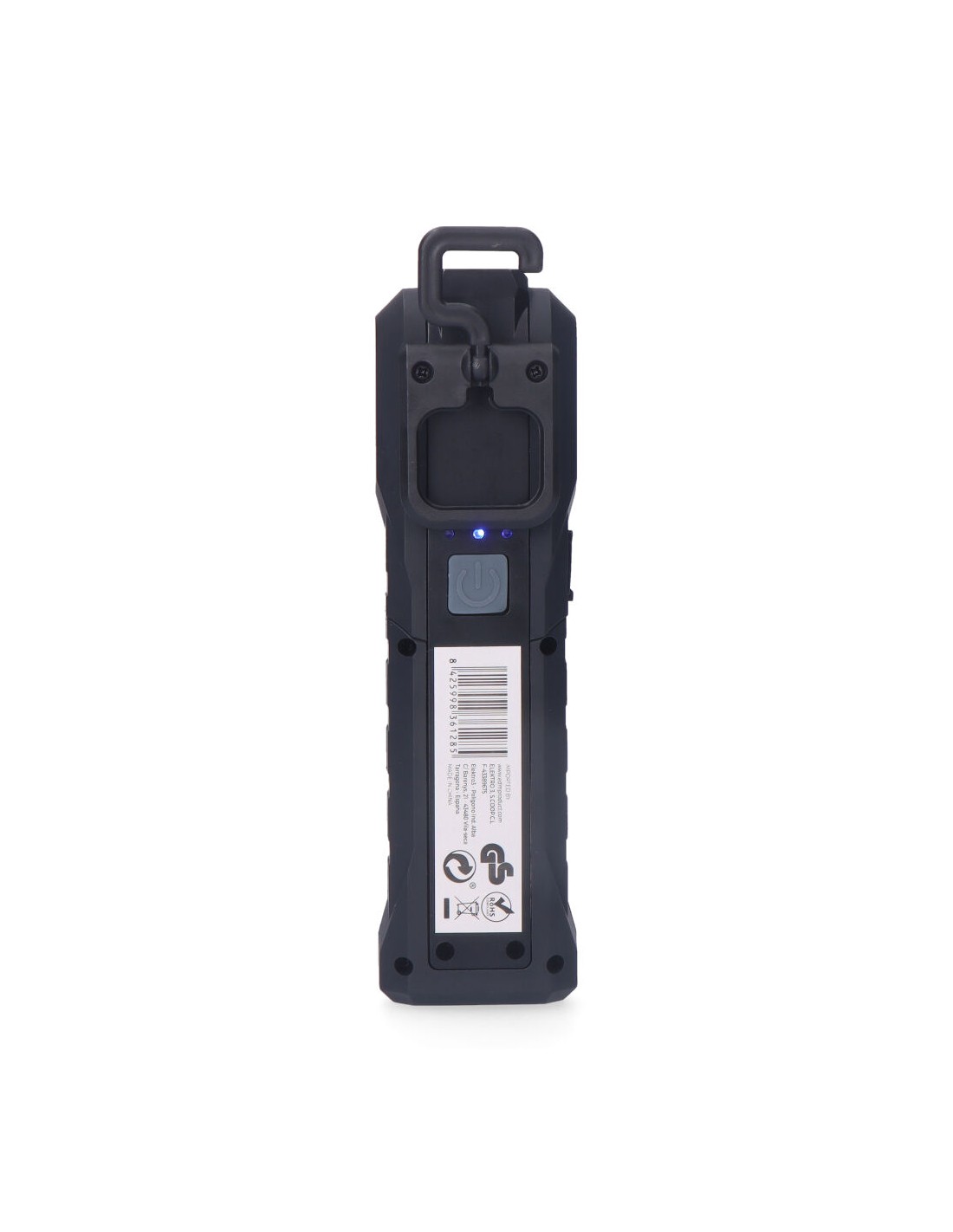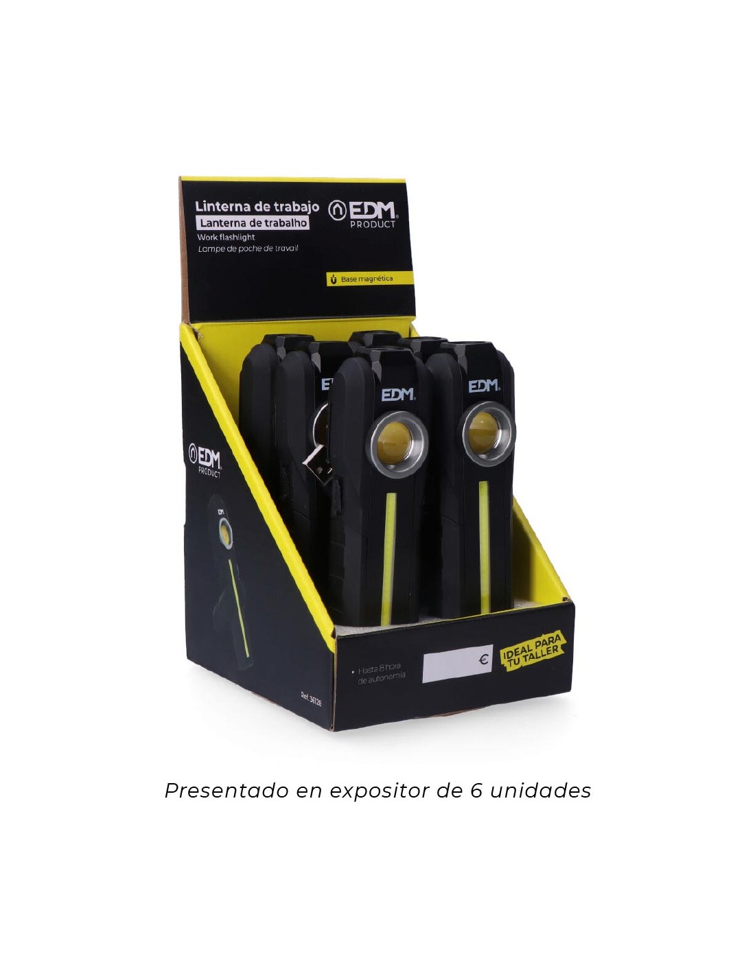 Linterna de trabajo led, cob redonda 200lm 5w 4.200k + cob frontal 200lm 5w 6.500k + spot superior 50lm 3w 6.500k. material: abs + aluminio. bateria 1500mah de litio incluida recargable.carga usb tipo c , cable incluido. carga de 3,5horas. indicador de bateria. hasta 8 horas de autonomía. incluye base basculante 180, gancho para colgar y base imantada. medidas:40 x 42 x 154 mm. presentado en expositor de 6 unidades