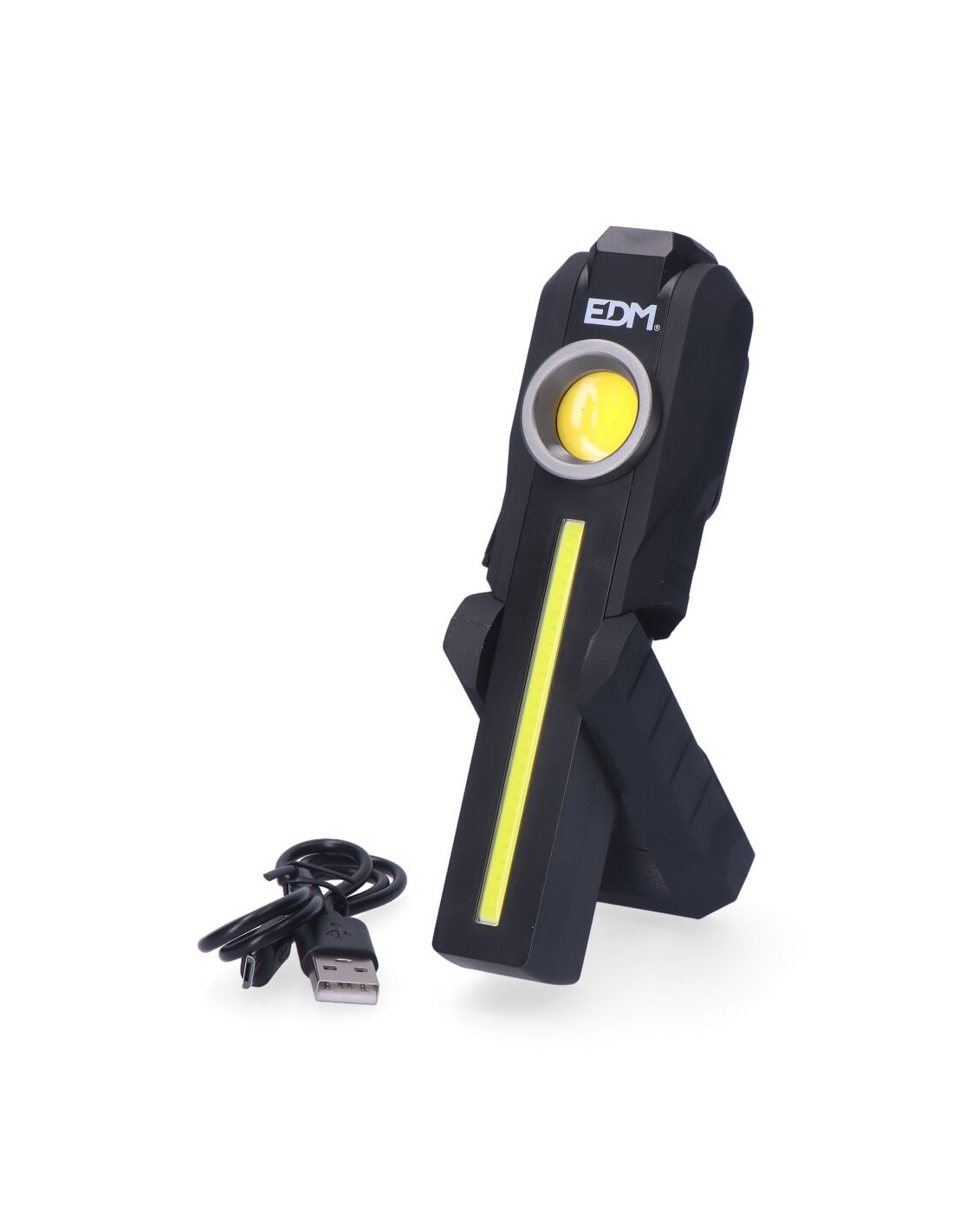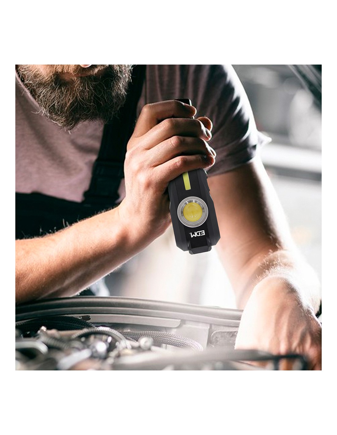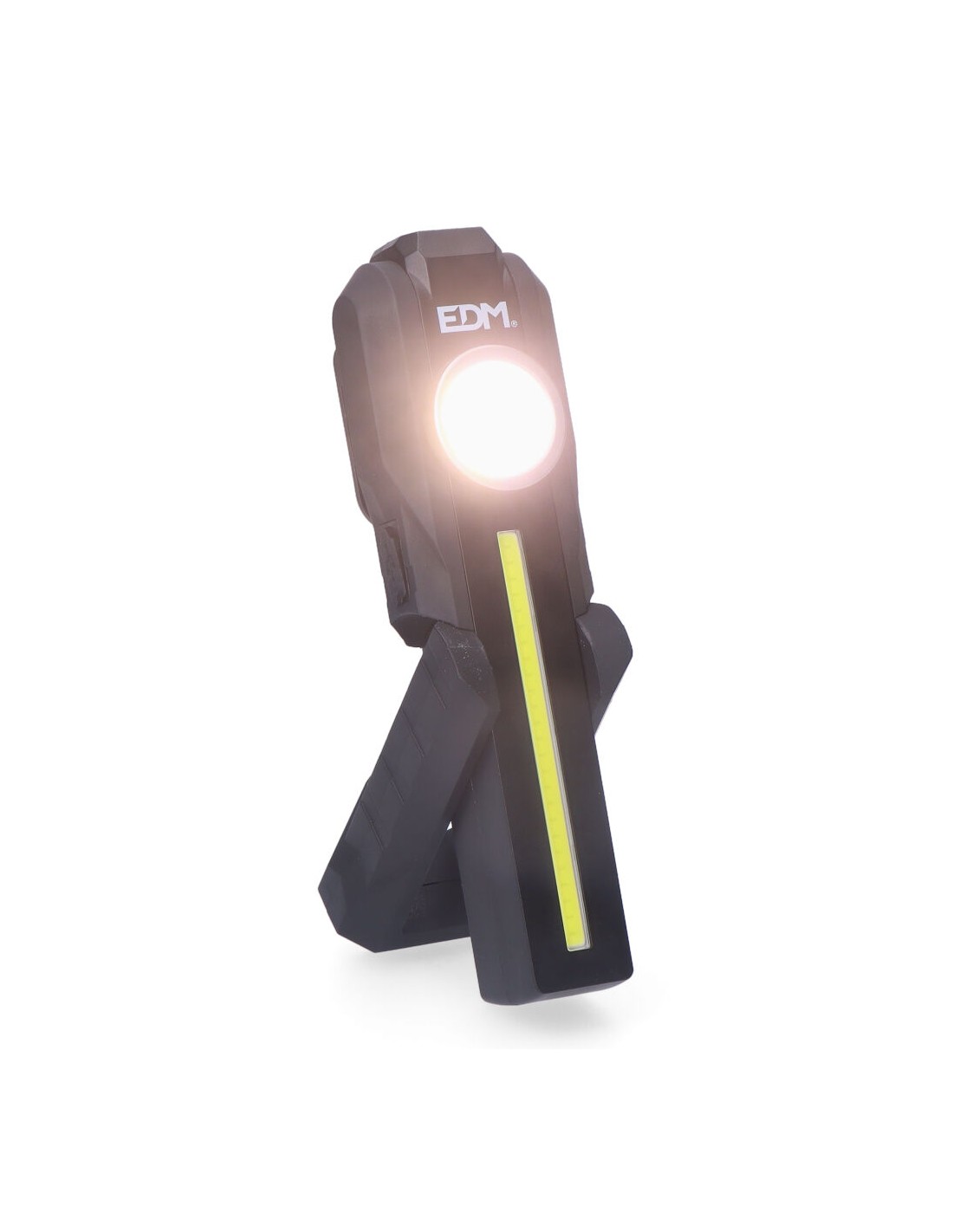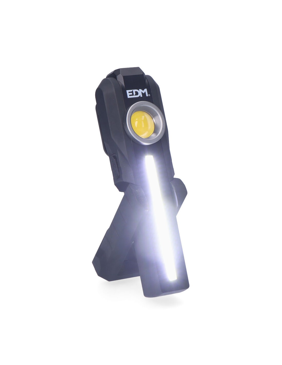 Linterna de trabajo led, cob redonda 200lm 5w 4.200k + cob frontal 200lm 5w 6.500k + spot superior 50lm 3w 6.500k. material: abs + aluminio. bateria 1500mah de litio incluida recargable.carga usb tipo c , cable incluido. carga de 3,5horas. indicador de bateria. hasta 8 horas de autonomía. incluye base basculante 180, gancho para colgar y base imantada. medidas:40 x 42 x 154 mm. presentado en expositor de 6 unidades