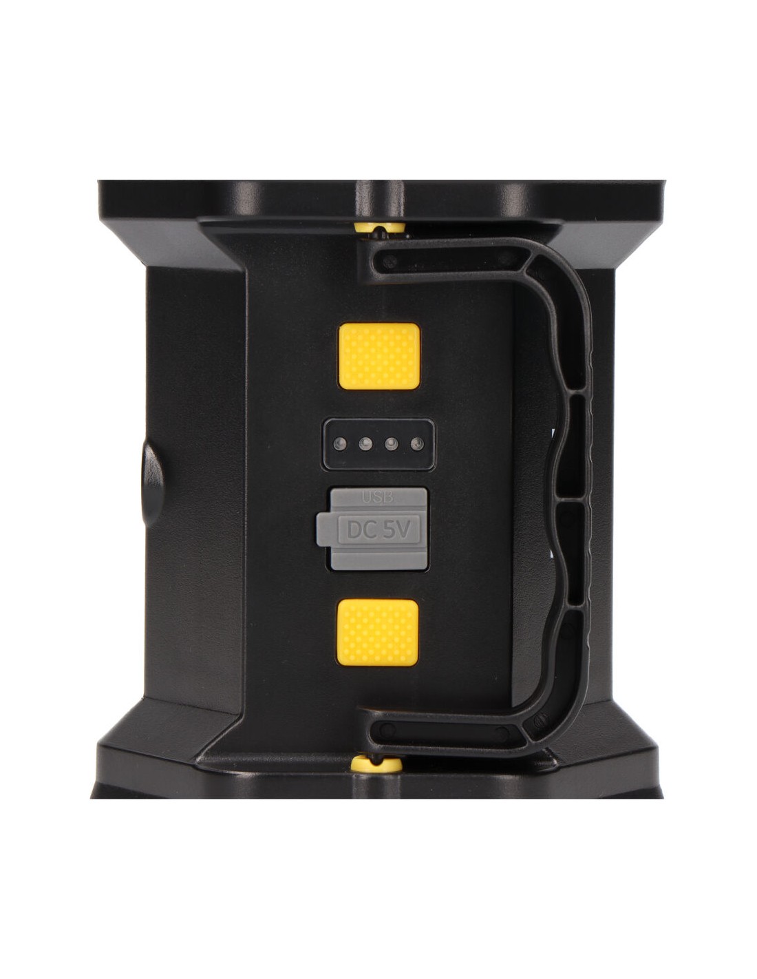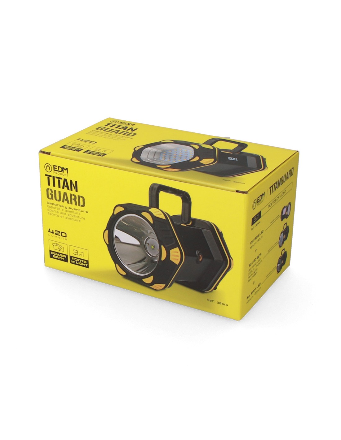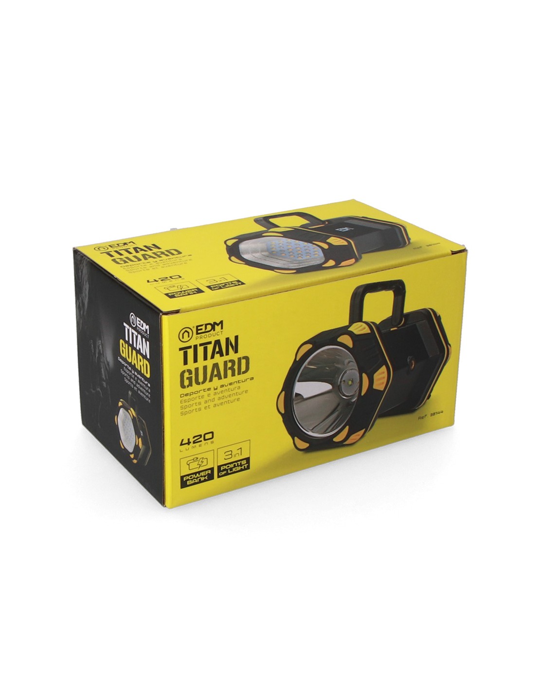 Linterna led de mano titan guard. 5w spot led 10000k 2 modos: 420lm/200lm. 2w side led 7500k 2modos: 160lm/90lm. 3w smd led 6500k 4 modos:270lm/140lm/luz roja/flash rojo 200lm (10 leds rojos + 20 leds blancos). cuerpo de goma para protección de caídas, con rosca universal para tripode ø8mm , asa rotativa 180°, cable micro usb incluido, funciona con batería de 4x4800mah de litio. con indicador de batería de 4 leds. hasta 17h autonomía, carga de 10h dimensiones: 117x108x182mm