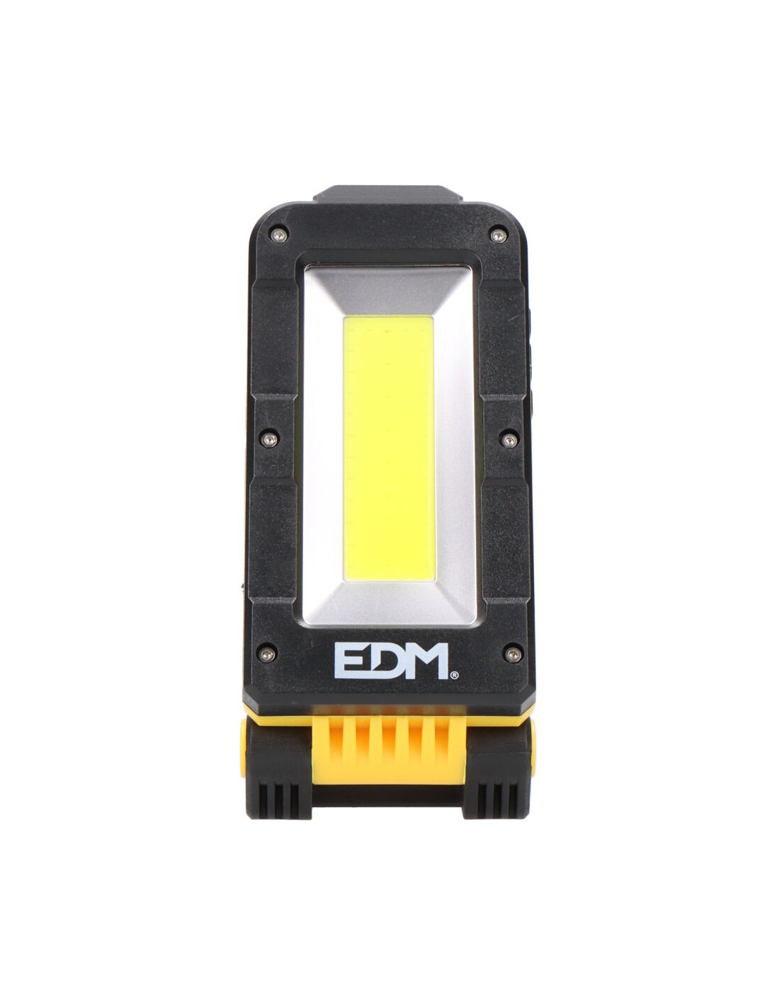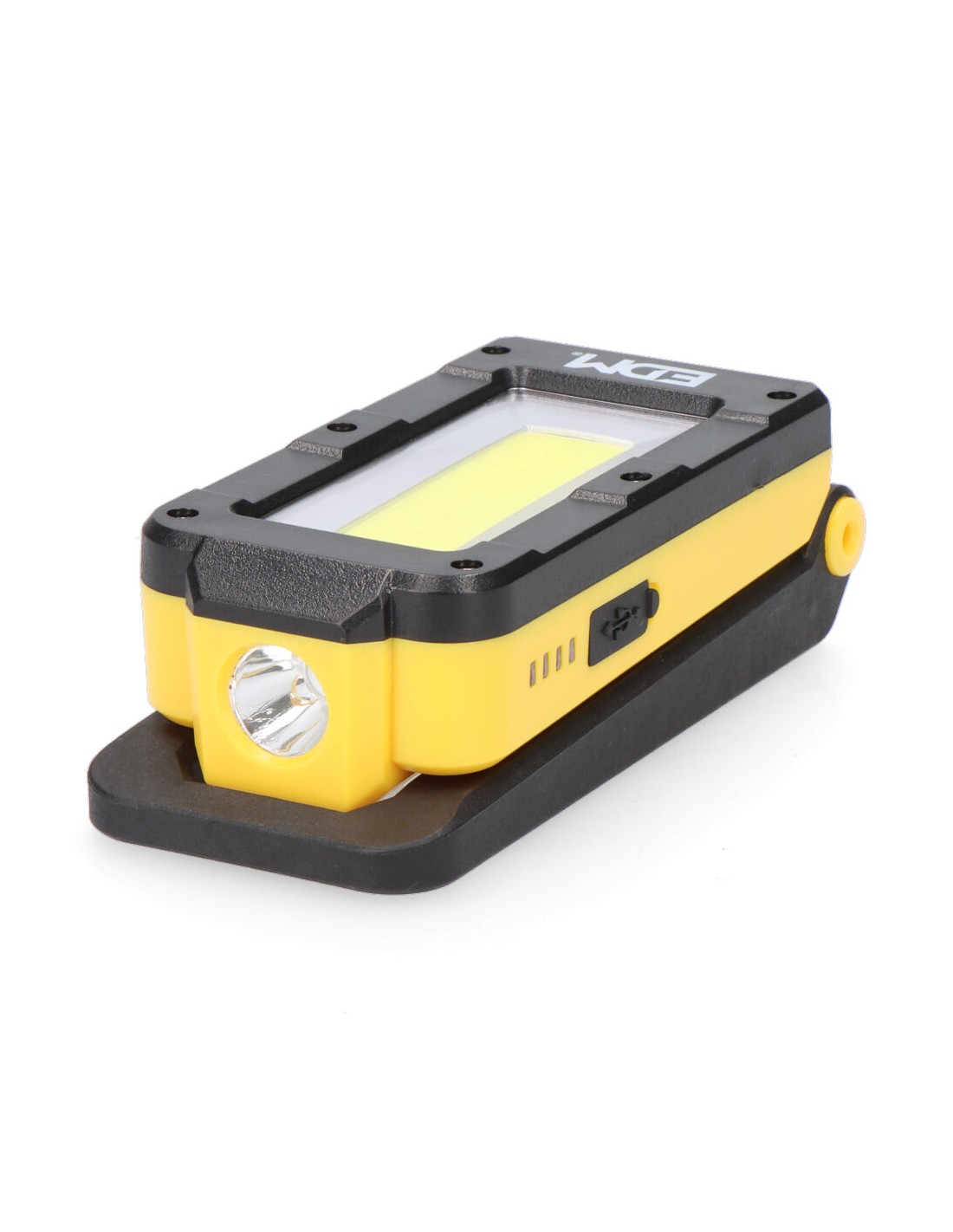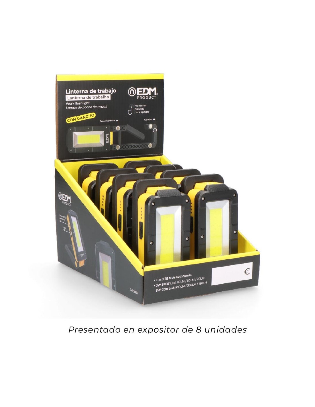 Linterna de trabajo led con base basculante 180°, 5w cob led: 500lm/350lm/150lm/luz roja/flash rojo. 3w spot led: 80lm/50lm/20lm. 7000k, con gancho e imán, batería 2000mah de litio incluida, carga 7h, cable usb incluido, con indicador de batería, impermeable ip44, hasta 18h de autonomía, dimensiones: 6x4x12,5cm. presentado en expositor de 8 unidades