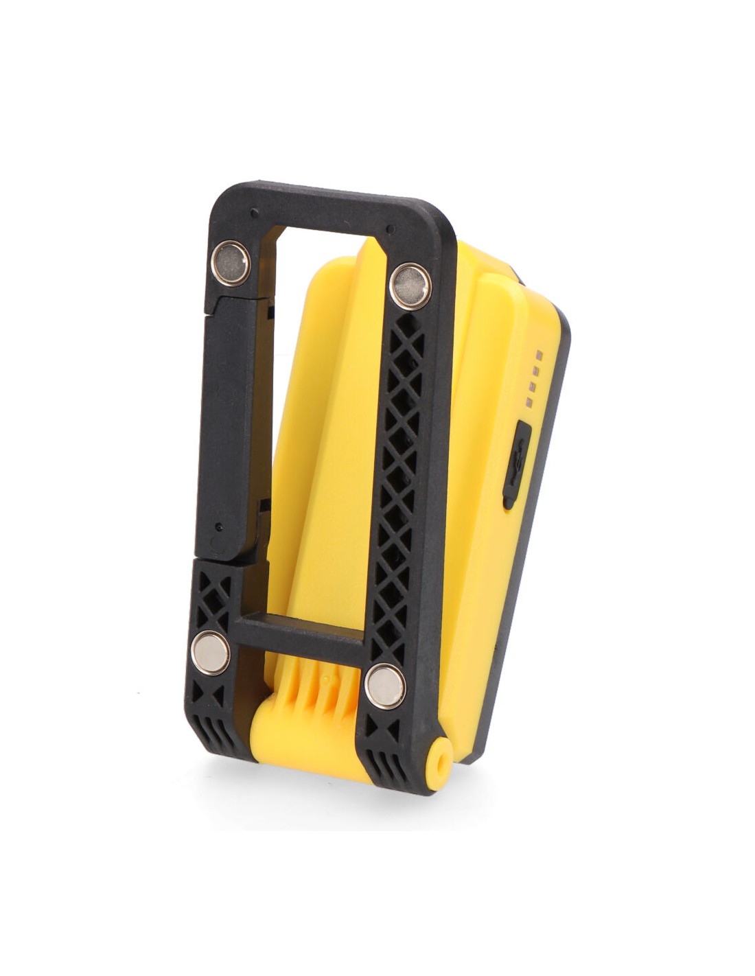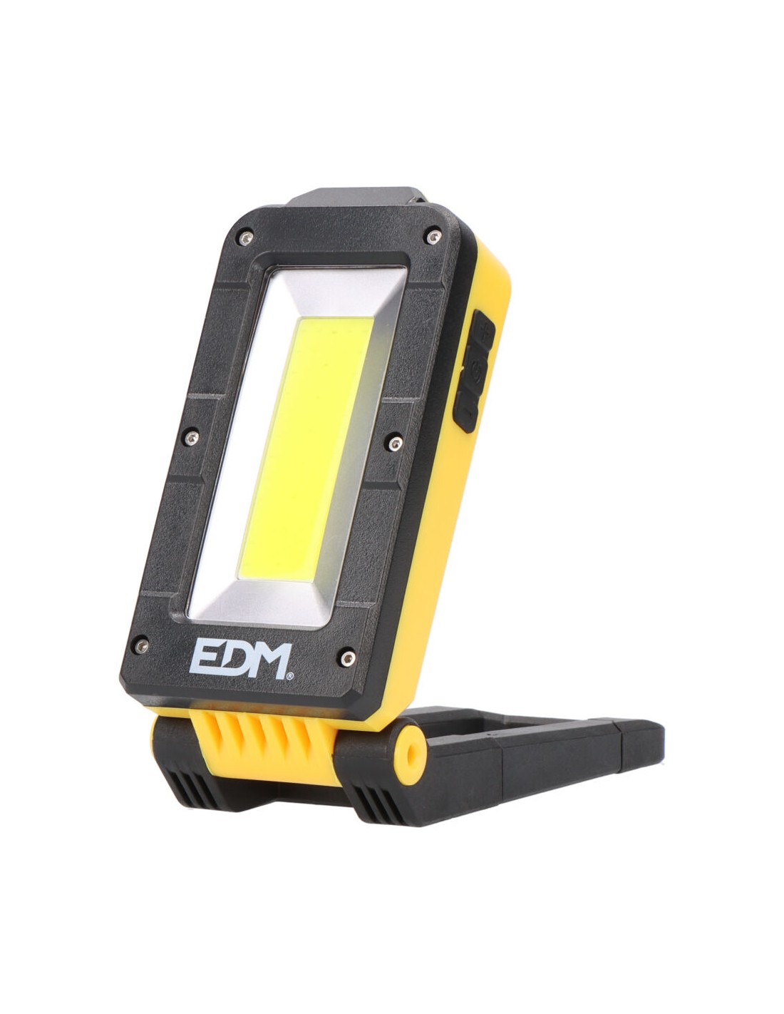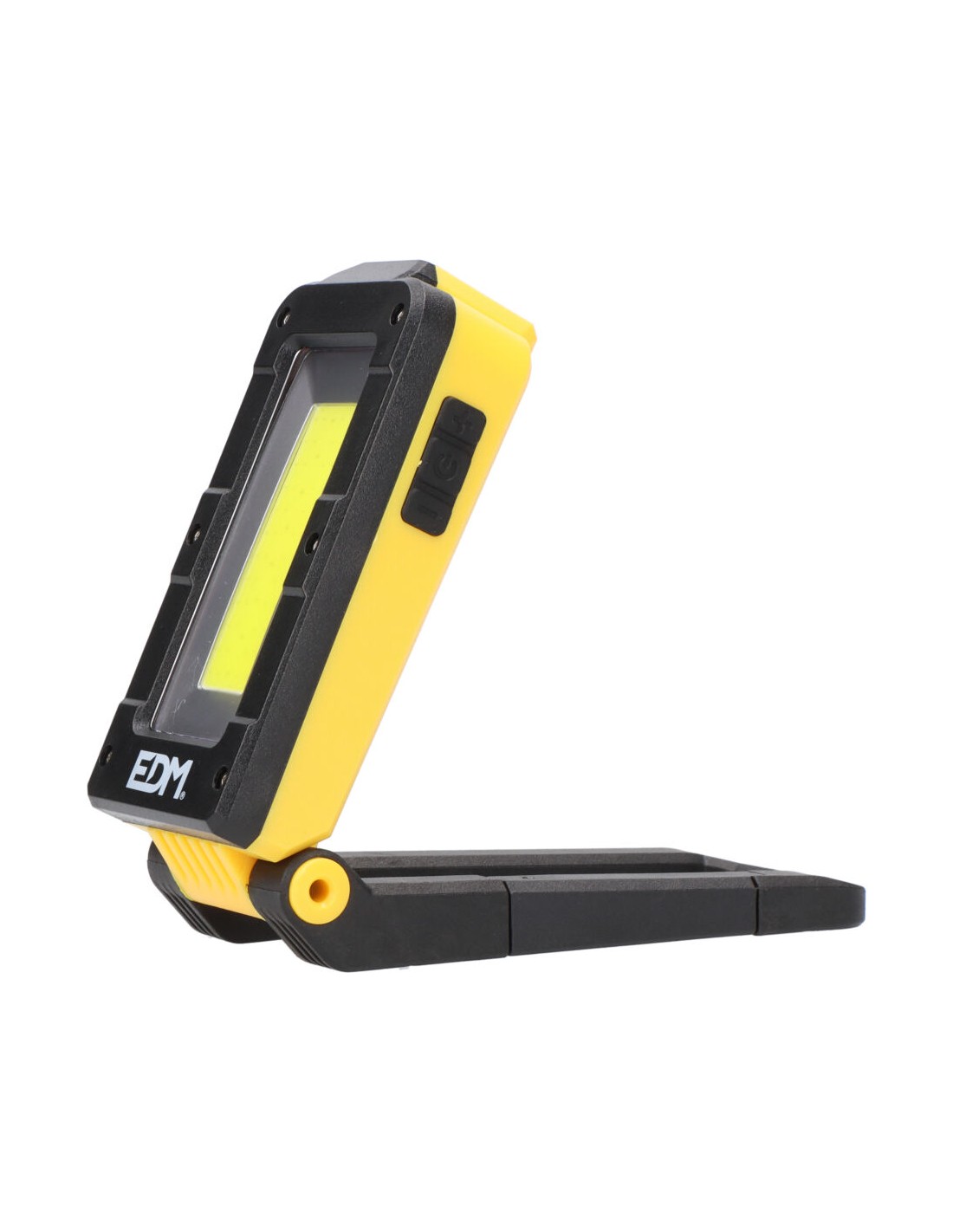 Linterna de trabajo led con base basculante 180°, 5w cob led: 500lm/350lm/150lm/luz roja/flash rojo. 3w spot led: 80lm/50lm/20lm. 7000k, con gancho e imán, batería 2000mah de litio incluida, carga 7h, cable usb incluido, con indicador de batería, impermeable ip44, hasta 18h de autonomía, dimensiones: 6x4x12,5cm. presentado en expositor de 8 unidades