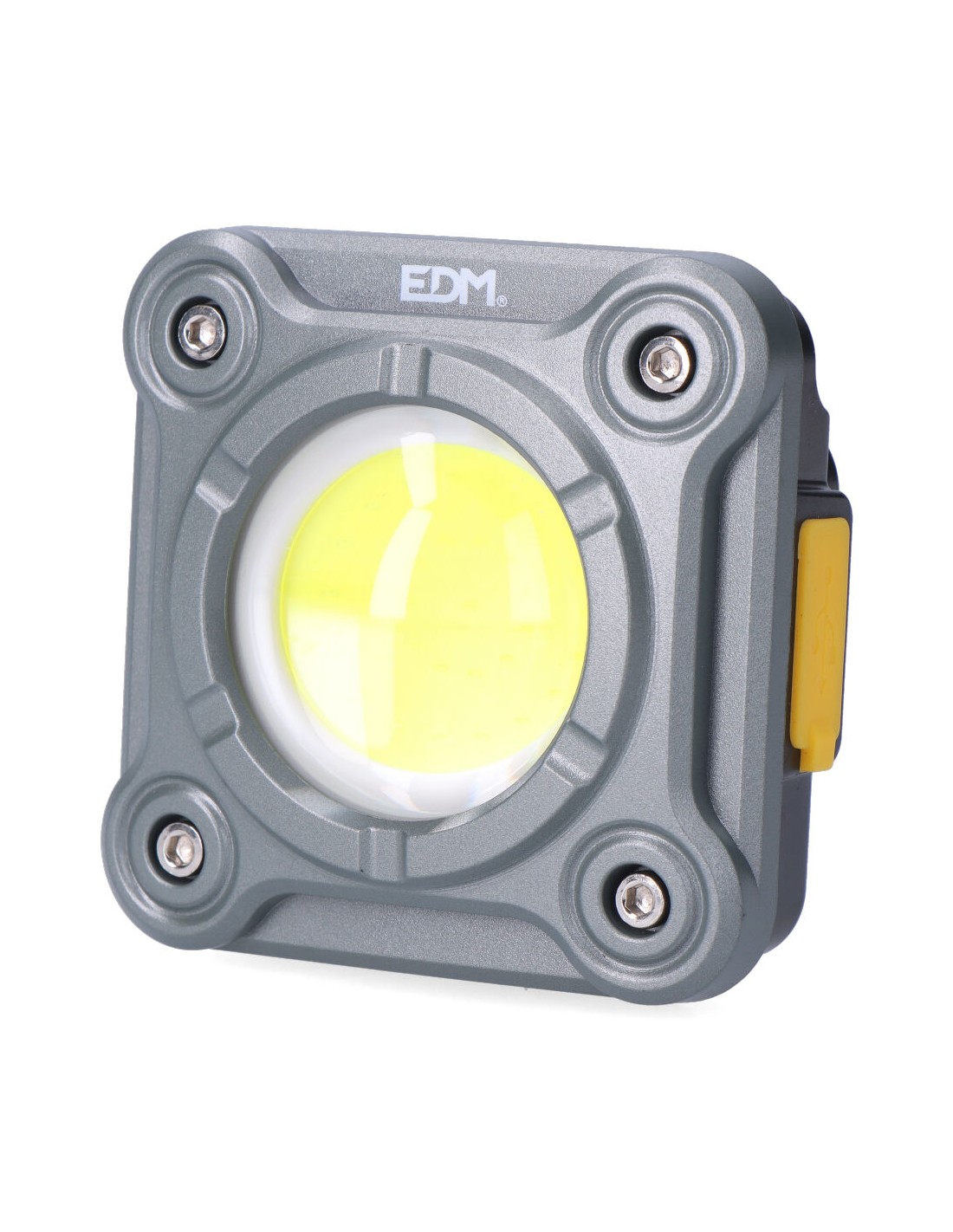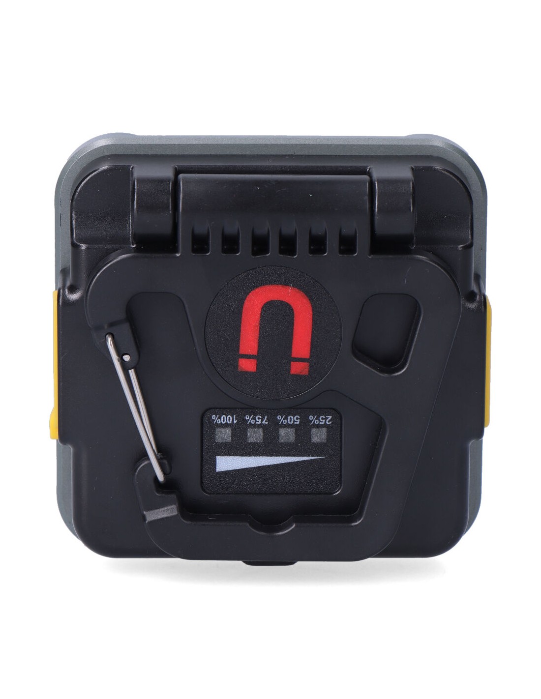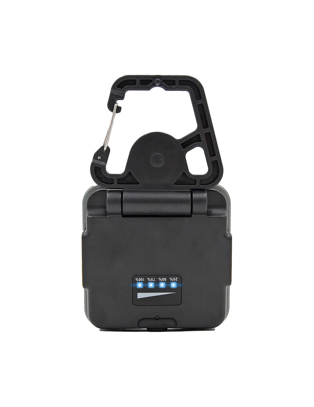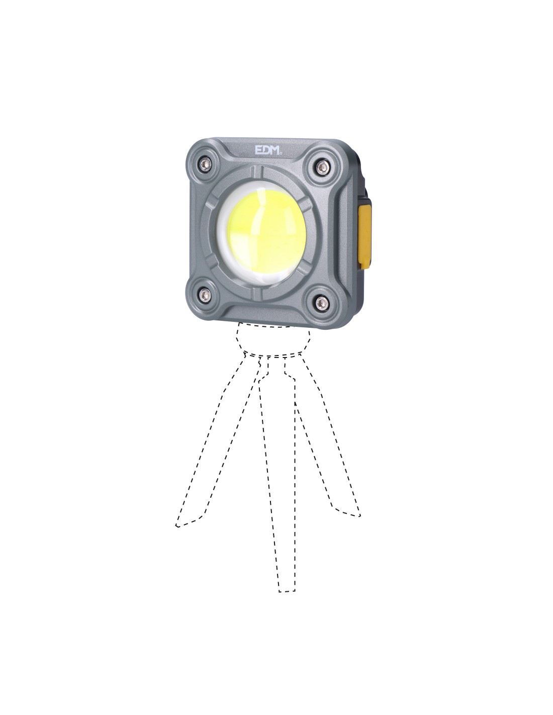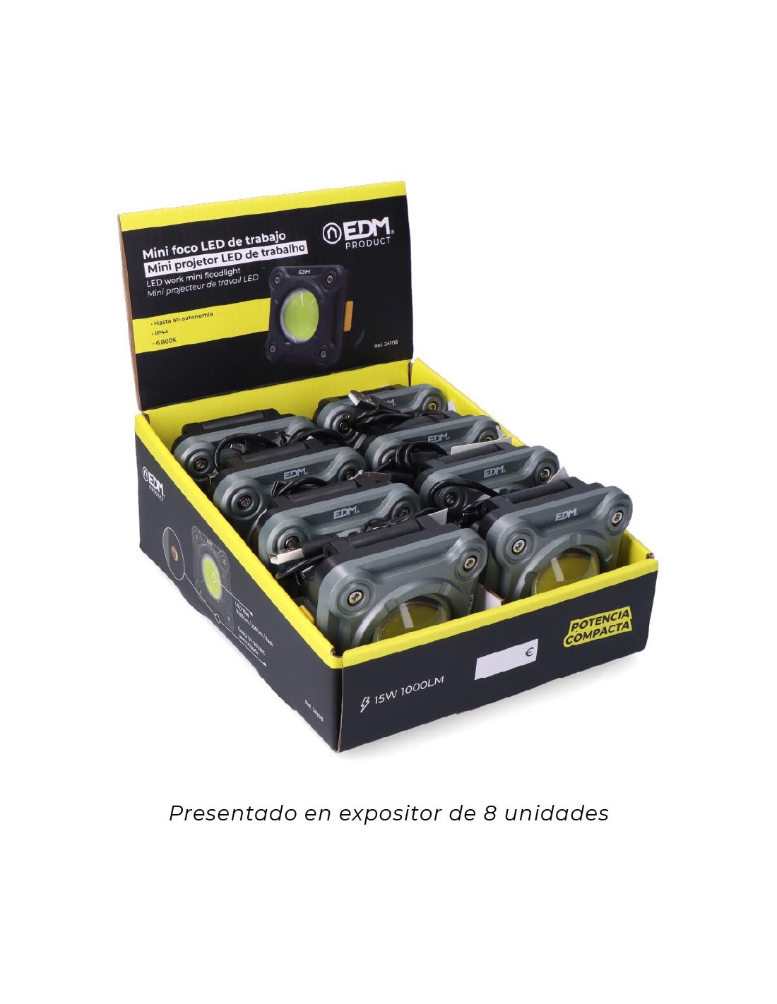 Mini foco led de trabajo 1000 lm 15 w cob. 3 modos: 1000 lm/350 lm/flash, 6800k, batería 2.000 mah de litio incluida, indicador de carga, cable usb tipo c incluido, con imán, gancho y asa, con base basculante 180°, dispone de rosca 1/4-20 unc para trípode. hasta 6 h de autonomía, carga de 4 h, ip44, dimensiones del producto: 8,1 x 8,1 x 4,6 cm. presentación en expositor de 8 unidades