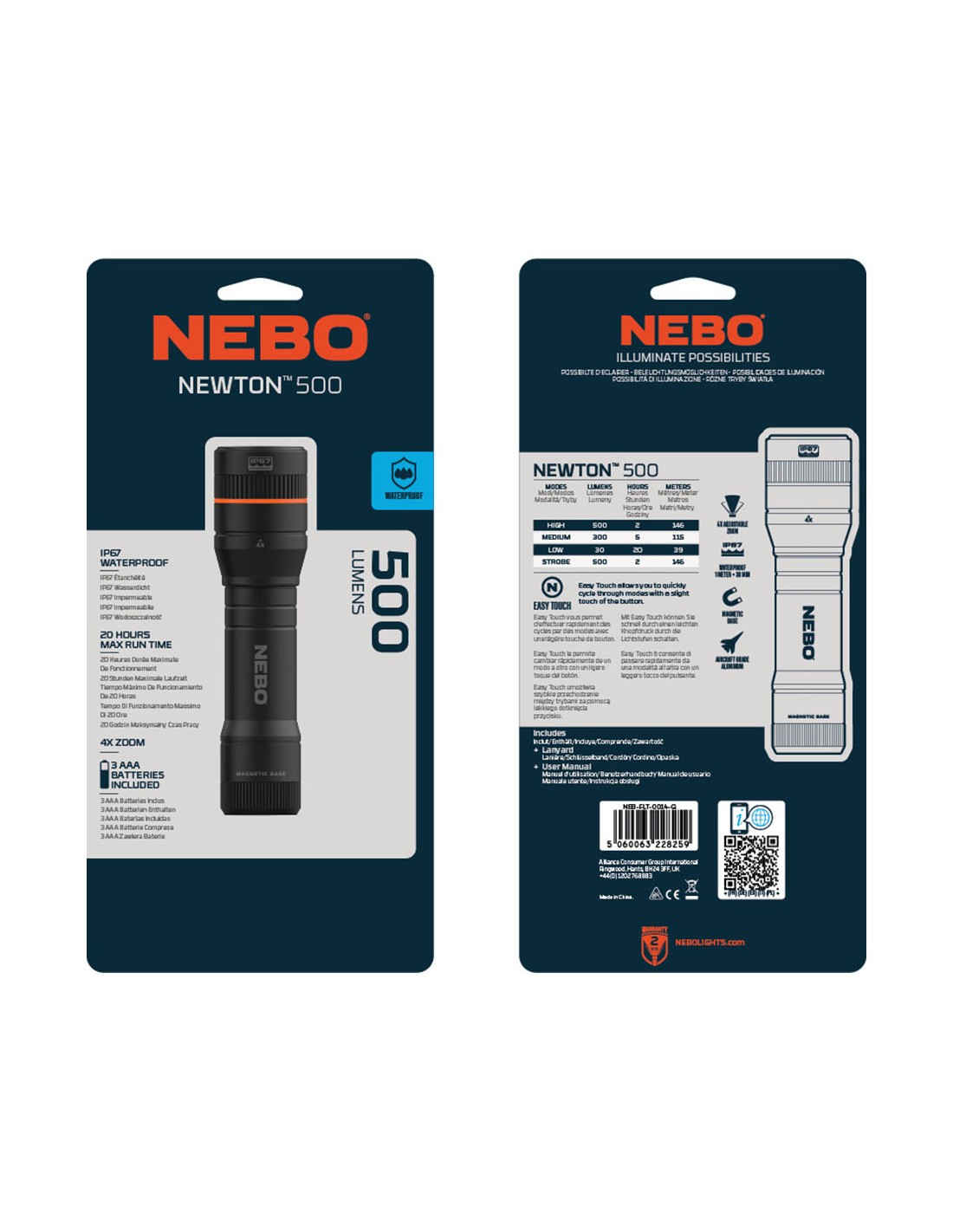 La linterna newton500 de nebo es una potente linterna con 4 modos de iluminación. el interruptor trasero fácil de tocar facilita el cambio entre modos y el potente led de esta linterna puede iluminar hasta 146 metros. modos alto (500): 2 horas / 146 metros medio (300 lúmenes): 5 horas / 37 metros bajo (30 lúmenes): 20 horas / 14 metros estroboscópica (500 lúmenes): 2 horas / 46 metros. diseño y operación aluminio anodizado de grado aeronáutico resistente al agua (ip67) y a los impactos interruptor fácil de tocar zoom ajustable 4x. información de la batería desarrollado por 3 * aaa 4.5v pilas alcalinas. accesorios incluidos cordón desmontable