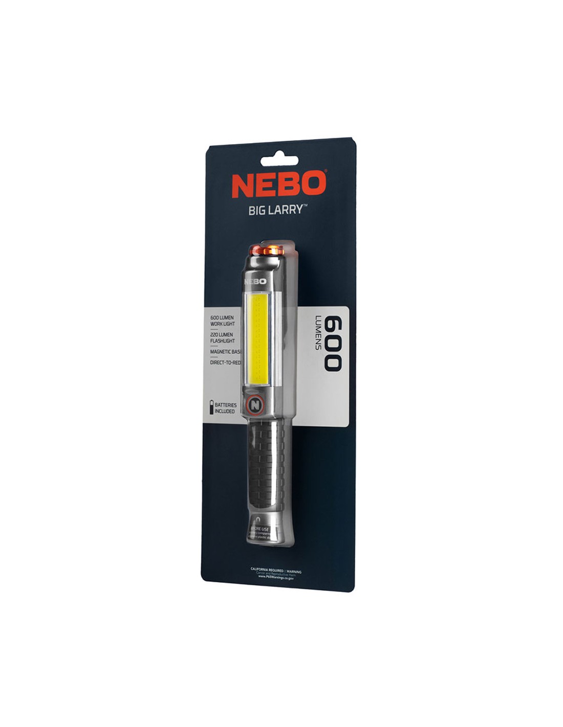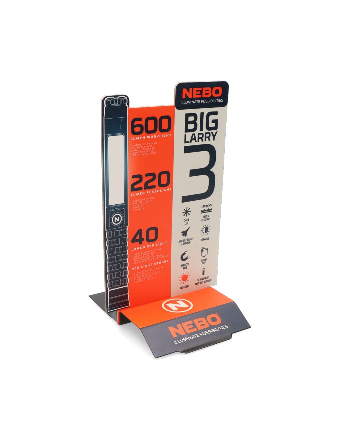 Por la compra de 12 unidades un expositor de regalo big larry produce 600 lúmenes con la luz de trabajo c o b y 220 lúmenes con la luz superior. la luz roja c o b es perfecta para señales de socorro o emergencias en la carretera. el clip de acero y la base magnética brindan opciones convenientes de iluminación manos libres. luz linterna (220 lúmenes): 8 horas / 82 metros. luz de trabajo (600 lúmenes): 2,5 horas / 33 metros. roja (40 lúmenes): 20 horas / 7 metros. luz estroboscópica roja (40 lúmenes): 40 horas / 7 metros diseño atenuación + recuperación de memoria de alimentación. directo a rojo.