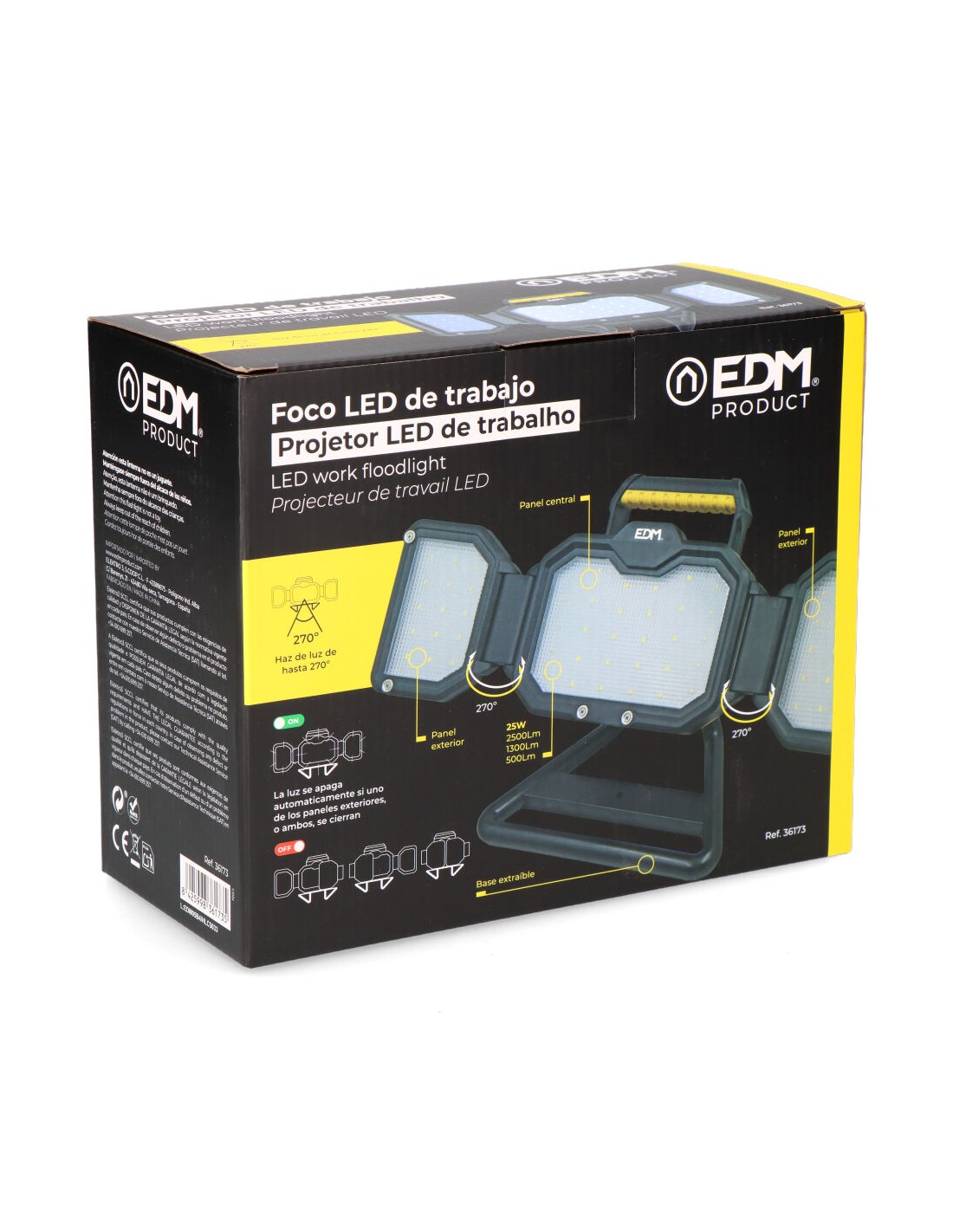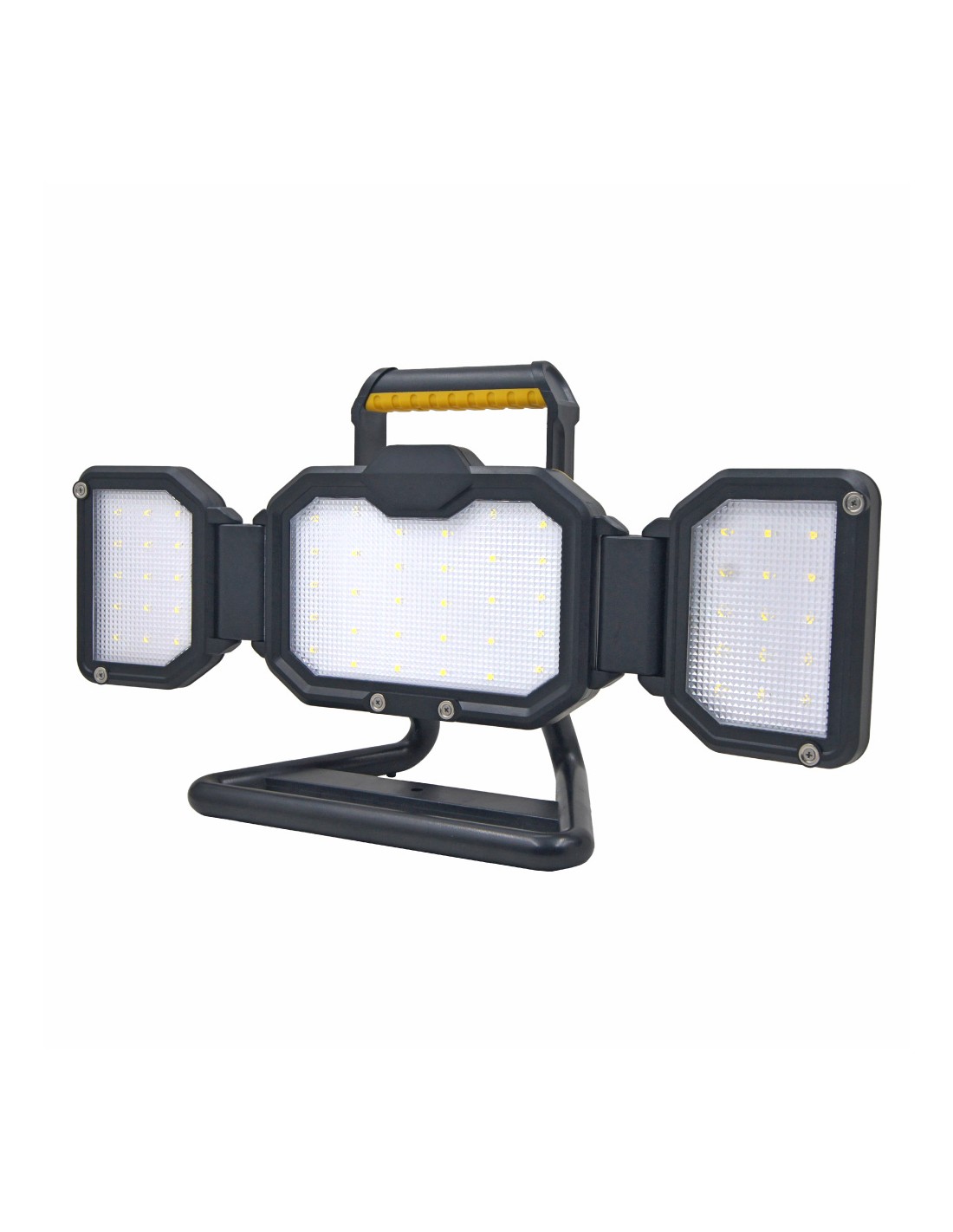 Foco led de trabajo power work am3, con 3 modos de luz, 2500 lm/1300 lm/500 lm, 25 w. haz de luz de hasta 270° la luz se apaga automáticamente si uno de los dos paneles exteriores o ambos, se cierran. con batería de 3 x 1800 mah de litio incluída, cable usb tipo c incluido, carga en 6 horas, hasta 8 h de autonomía, indicador de batería. ip44. material abs+pc, con asa + base extraíble. medidas: 467 x 227 x 155 mm
