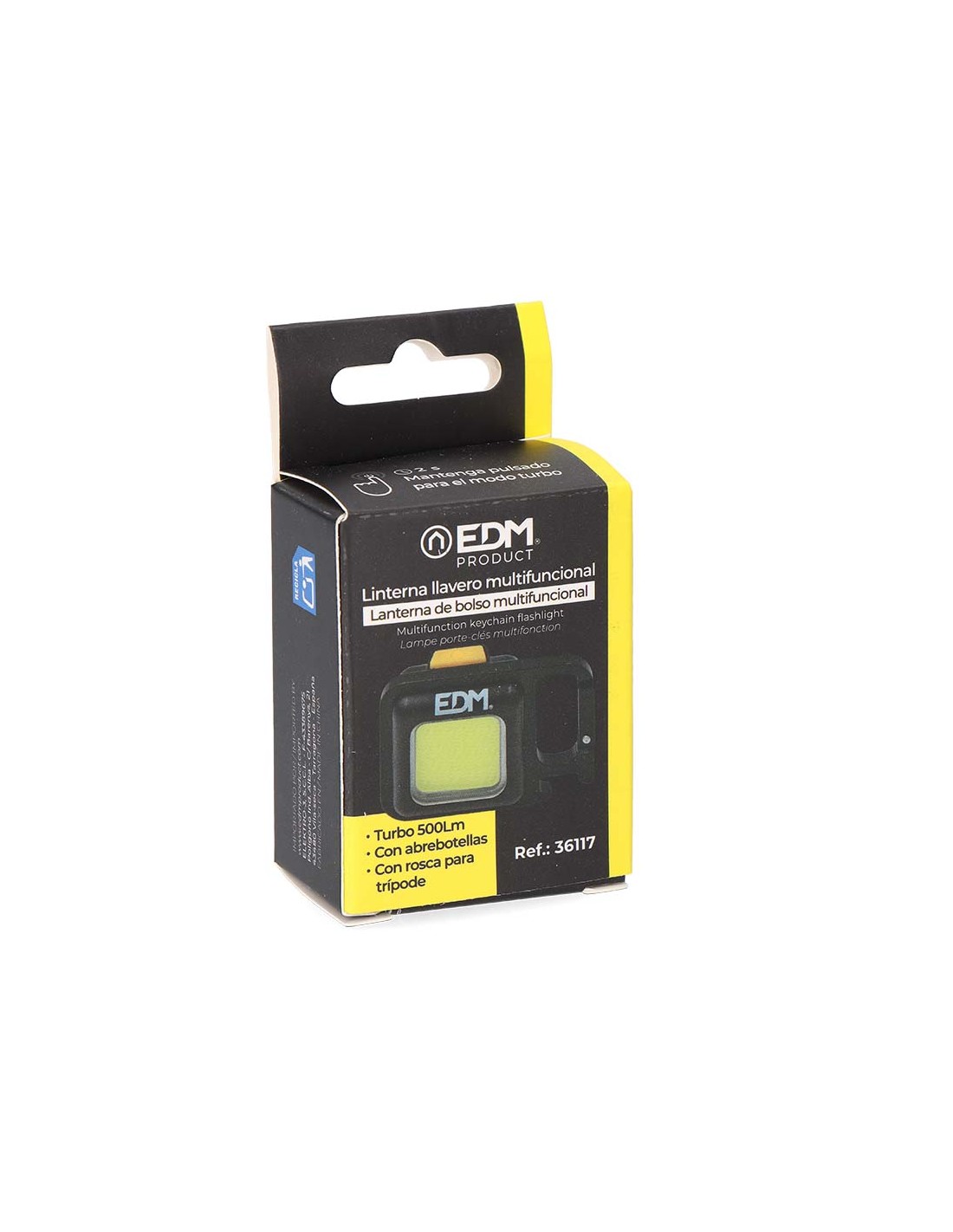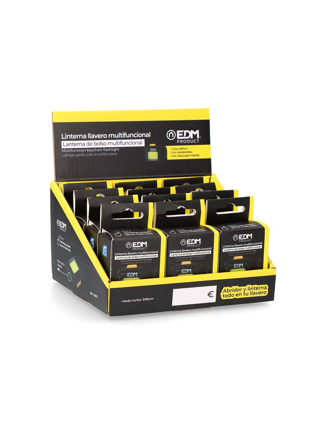 Linterna llavero multifuncional de aluminio, ip44. cob led 6w, 6000k con 4 modos:300 lm / 150l m / flash / turbo 500 lm. bateria 500 mah de litio (incluida), cable usb tipo c (incluido). hasta 12 h de autonomia aprox, carga de 3 h. iman en la base, con mosquetón, rosca para trípode, asa y abrebotellas. presentada en expositor de 12 unidades. medida 45 x 21,5 x 62 mm