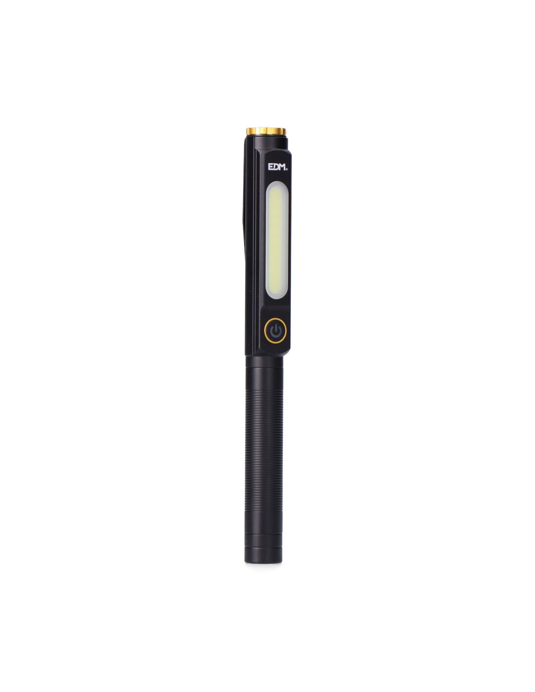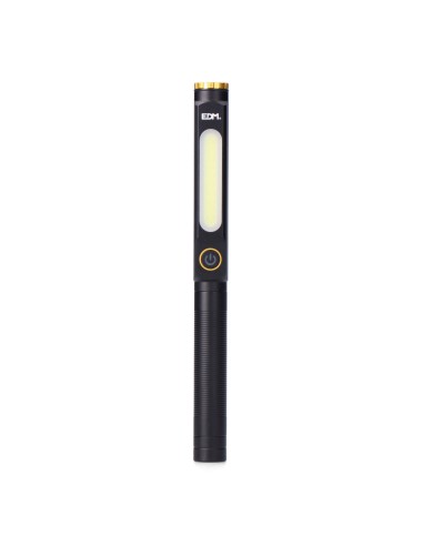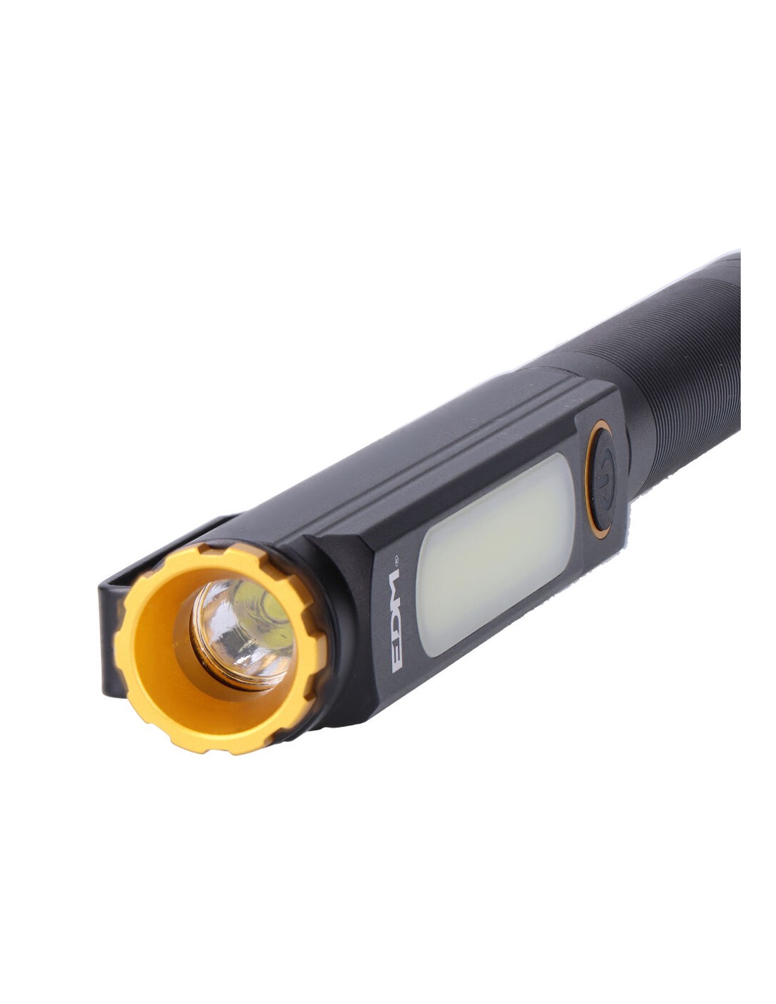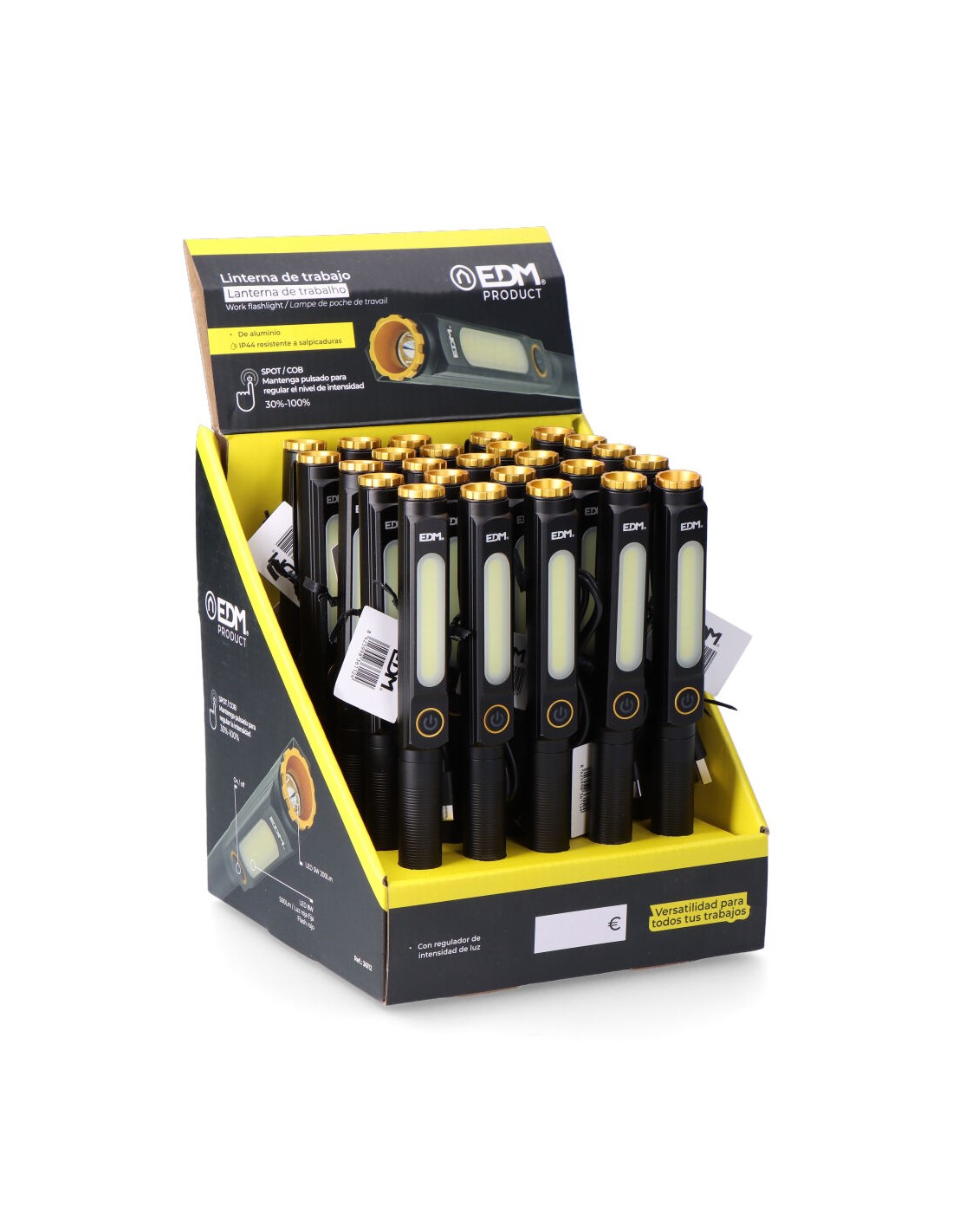 Linterna de trabajo de aluminio, ip44. spot led 5 w, 6500 k, 200 lm. cob led 8 w, 6500 k con 3 modelos: 500 lm / luz roja / flash rojo. regulable la intensidad spot/cob 30% - 100%. bateria 750mah de litio (incluida), cable usb tipo c (incluido). hasta 3 h de autonomia aprox, carga de 3 h. con iman en la base y clip. medida 18,5 x 25 x 204 mm. presentacion en expositor de 25 unidades