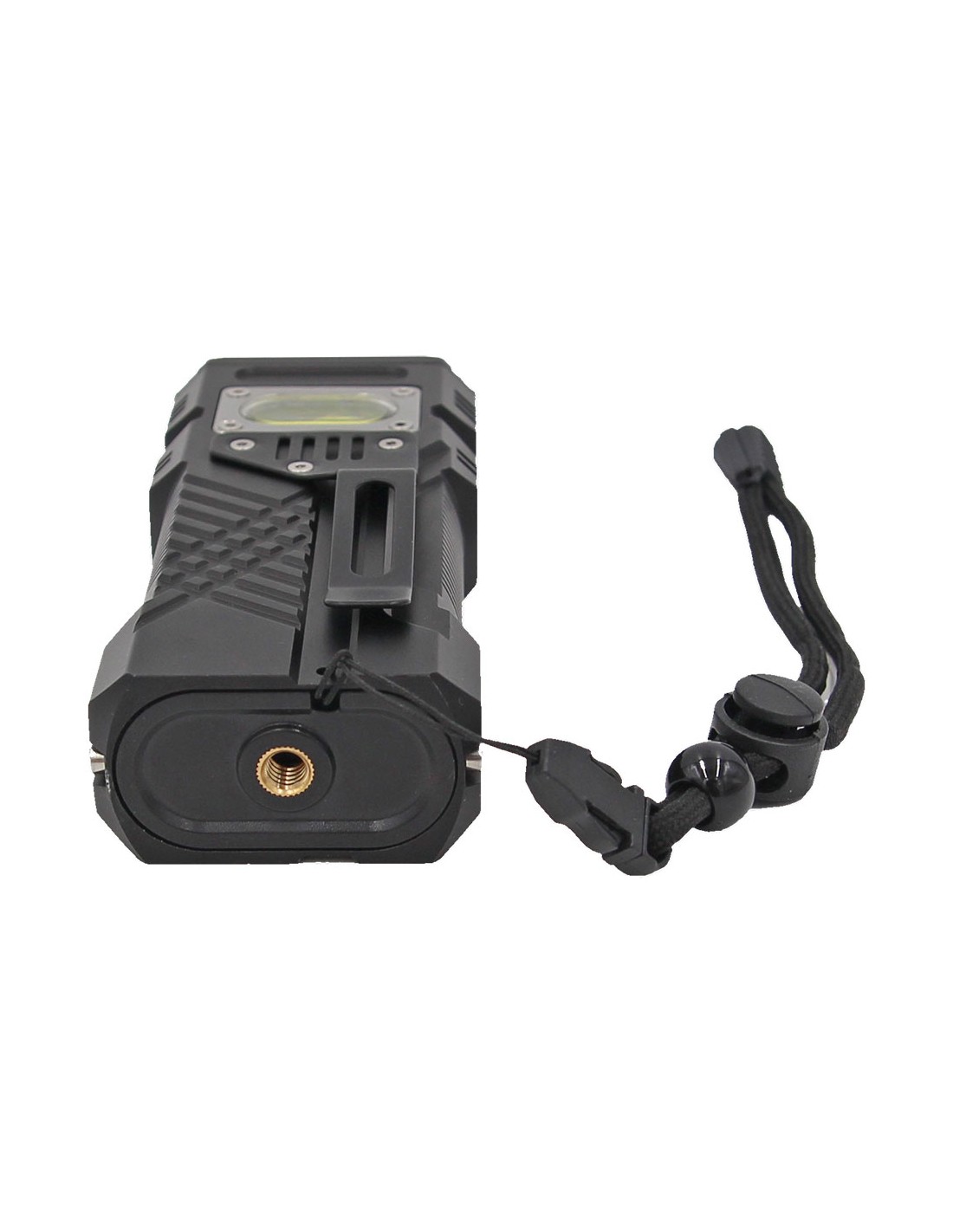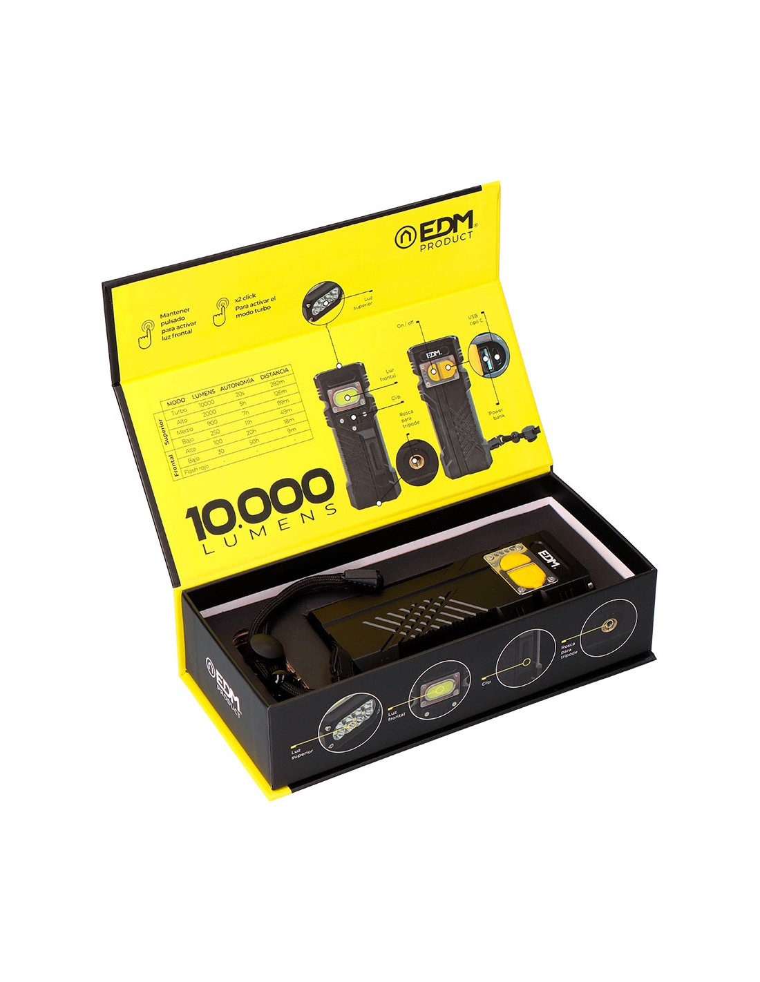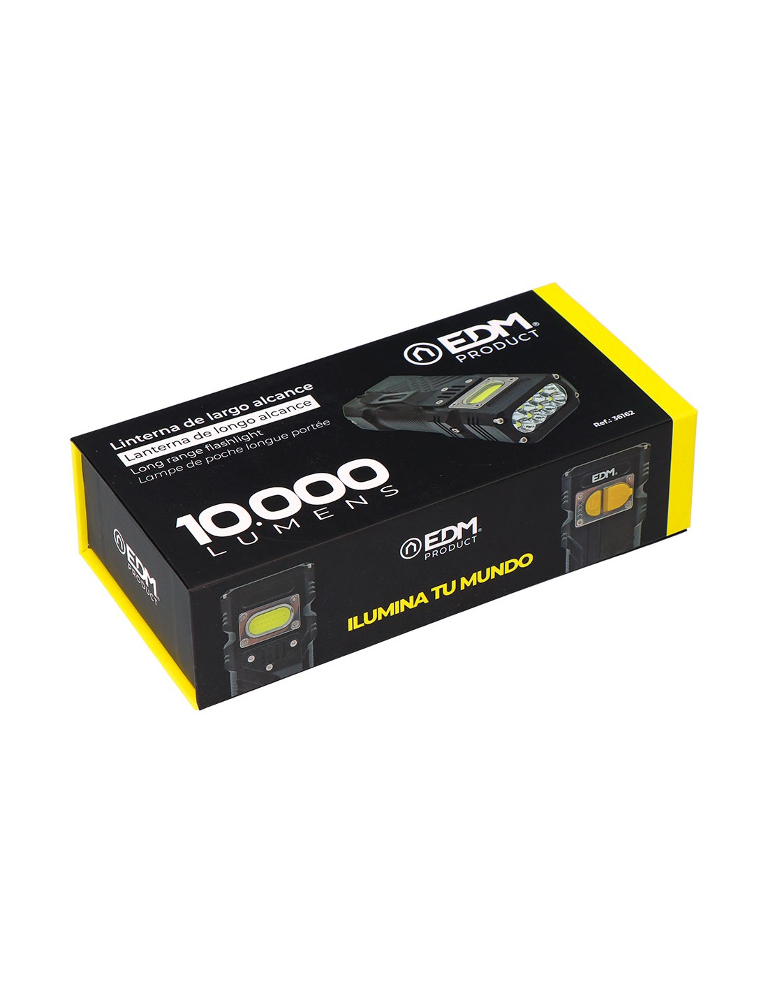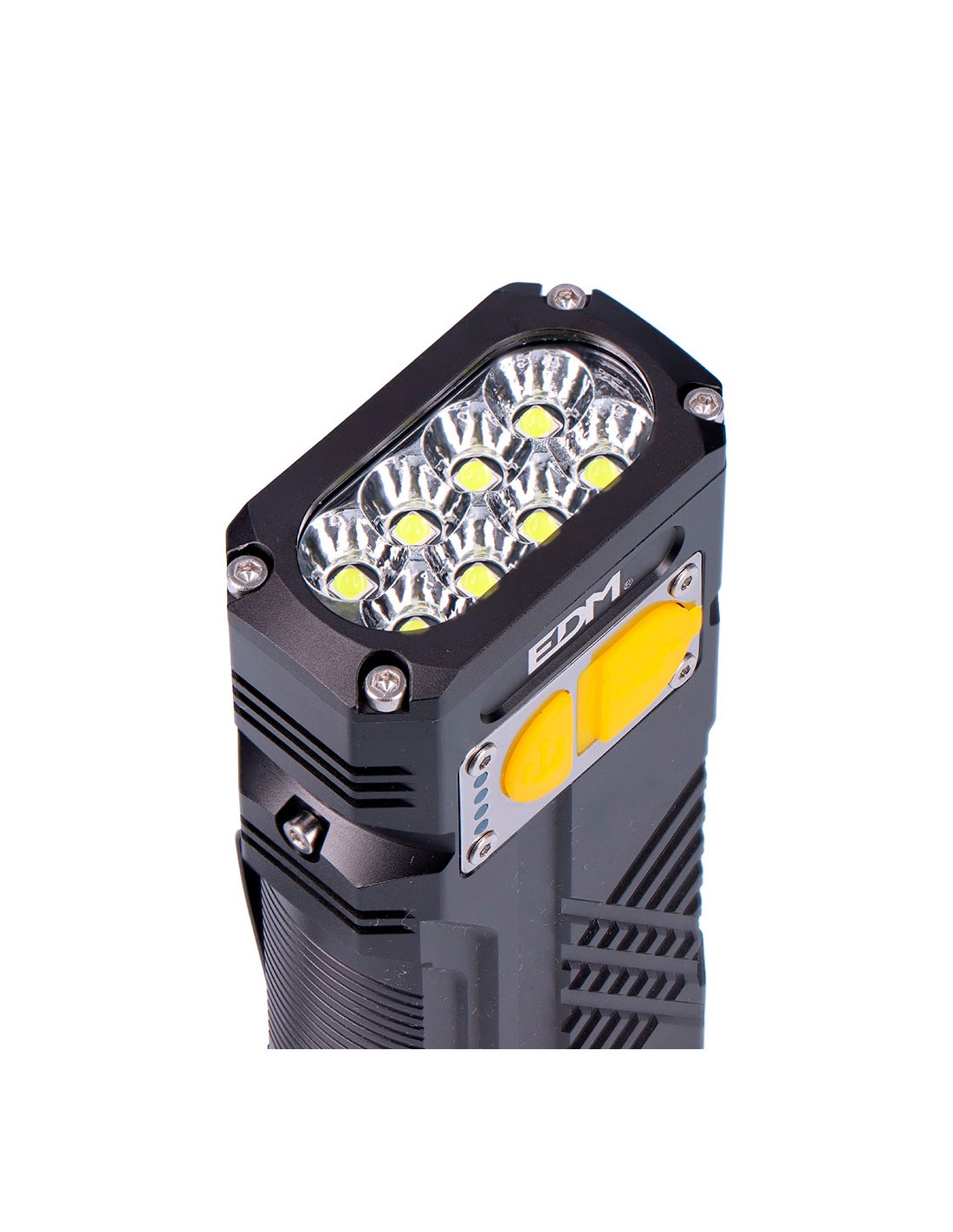 Linterna de largo alcance, aluminio, ip44, led turbo 10000 lm, luz superior 8 x 15 w 6500 k 4 modos: 2000 lm / 900 lm / 250 lm / turbo: 10000 lm luz frontal 3 w 7500 k 3 modos: 100 lm / 30 lm / flash rojo. hasta 50 h de autonomía, bateria 2 x 4000 mah, carga de 6 h. con clip, con correa, cable usb-c incluido. funcón power bank. tiene rosca para tripode estandar de 1/4". medidas 55 x 32 x 132 mm