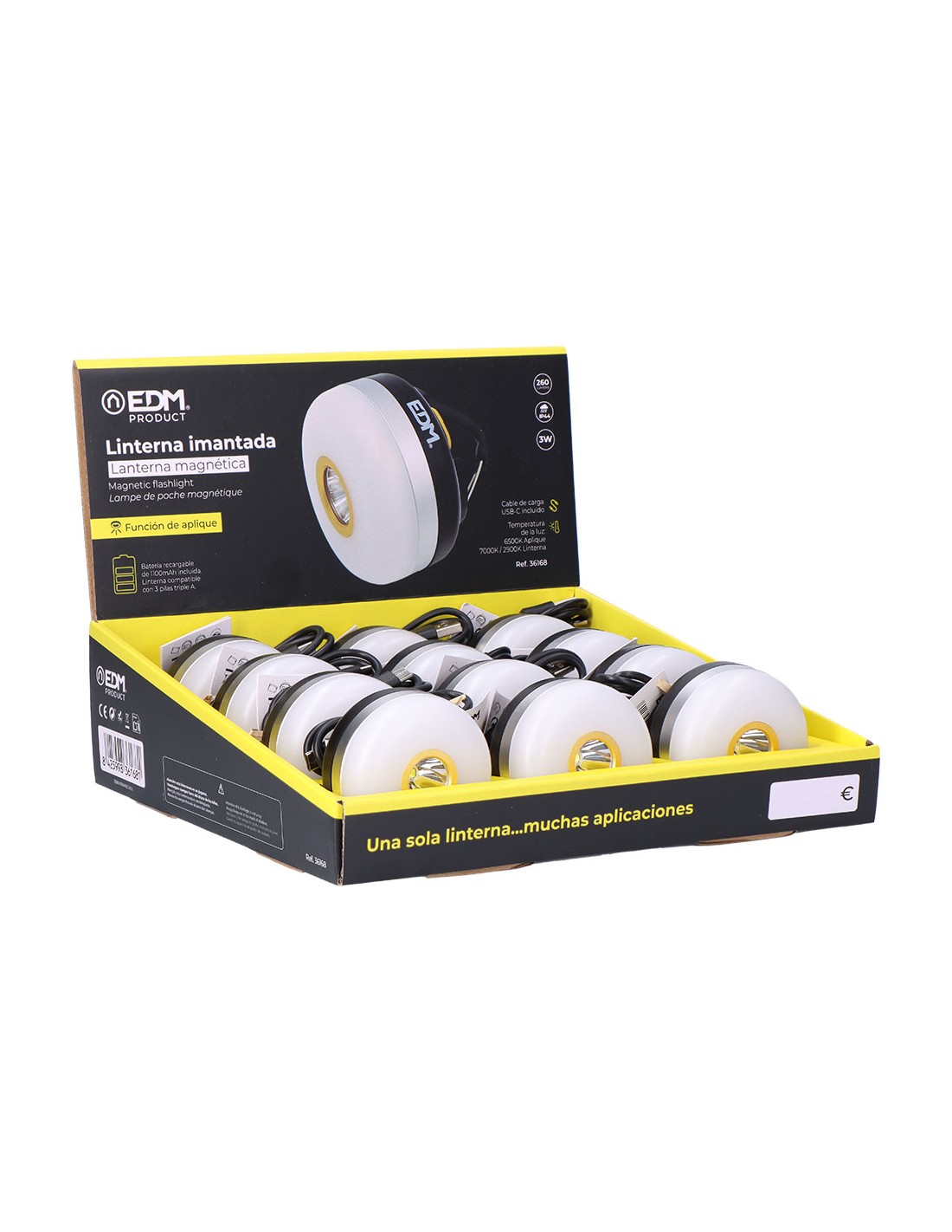 Linterna imantada led 260 lm 3 w. temperatura de la luz 3cct: 6500 / 7000 / 2900 k. protección: ip44. incluye batería recargable 1100 mah y cable de carga usb-c (posibilidad de usar 3 x aaa no incluidas), con función de aplique. 6 modos de luz: aplique "high" 260 lm, linterna luz fría "high" 250 lm, aplique "low" 130 lm, linterna luz cálida "high" 130 lm, linterna luz fría 125 lm y linterna luz cálida "low" 65 lm. medidas: ø 66 x 40 mm. apertura giratoria. presentada en expositor de 12 unidades