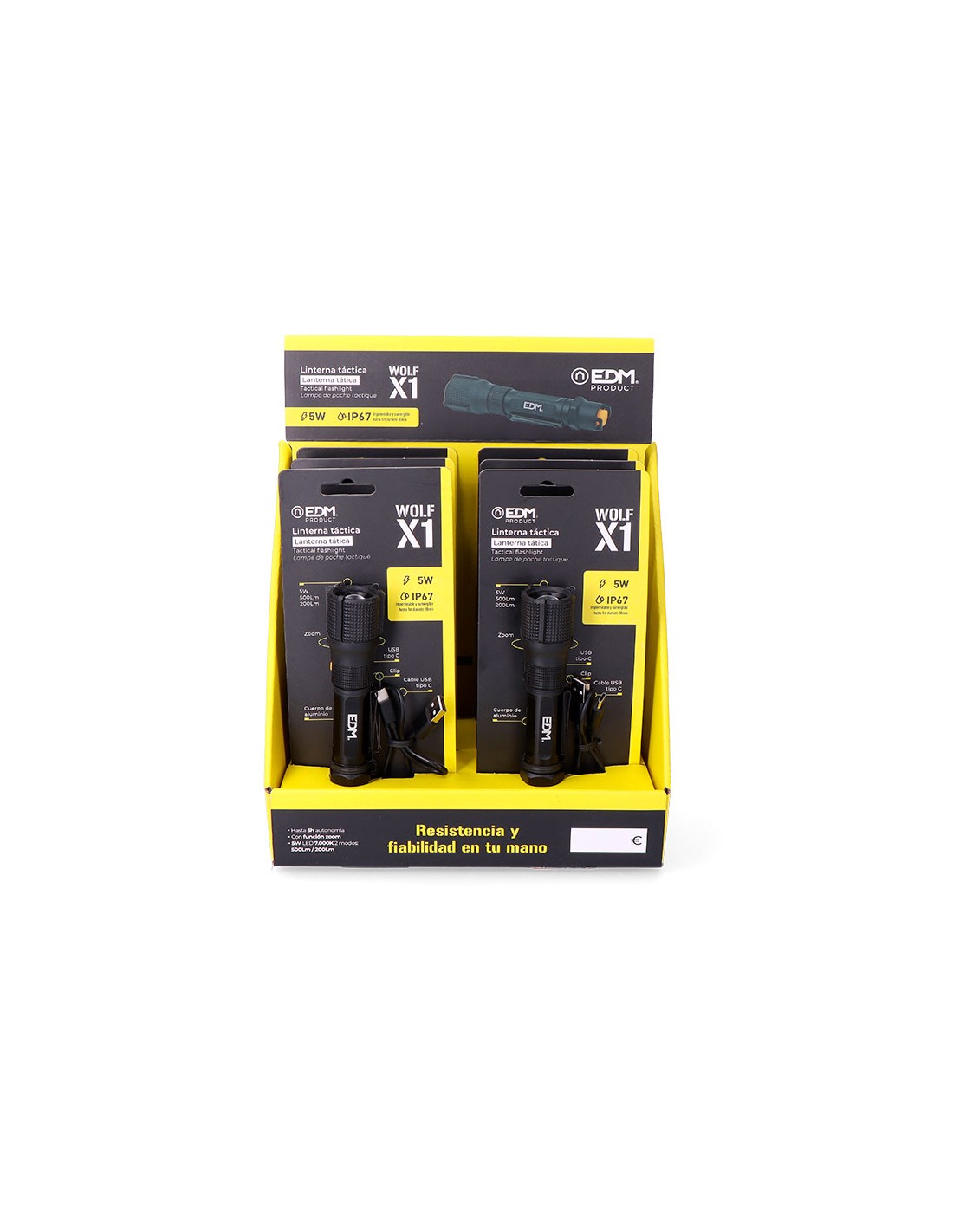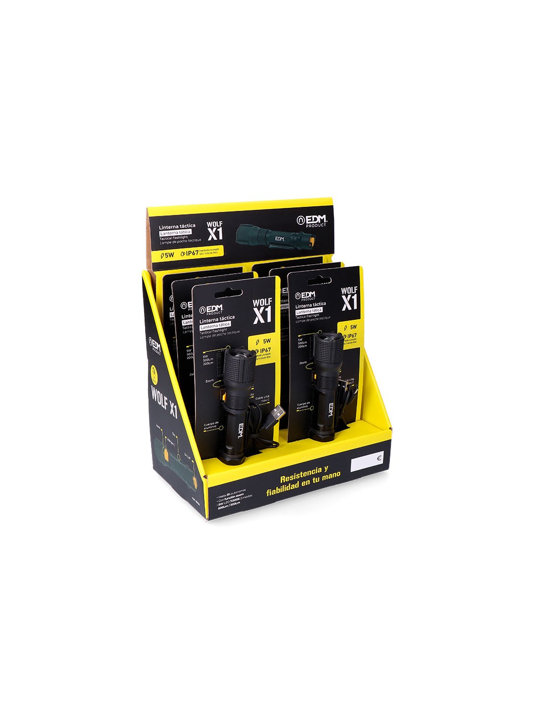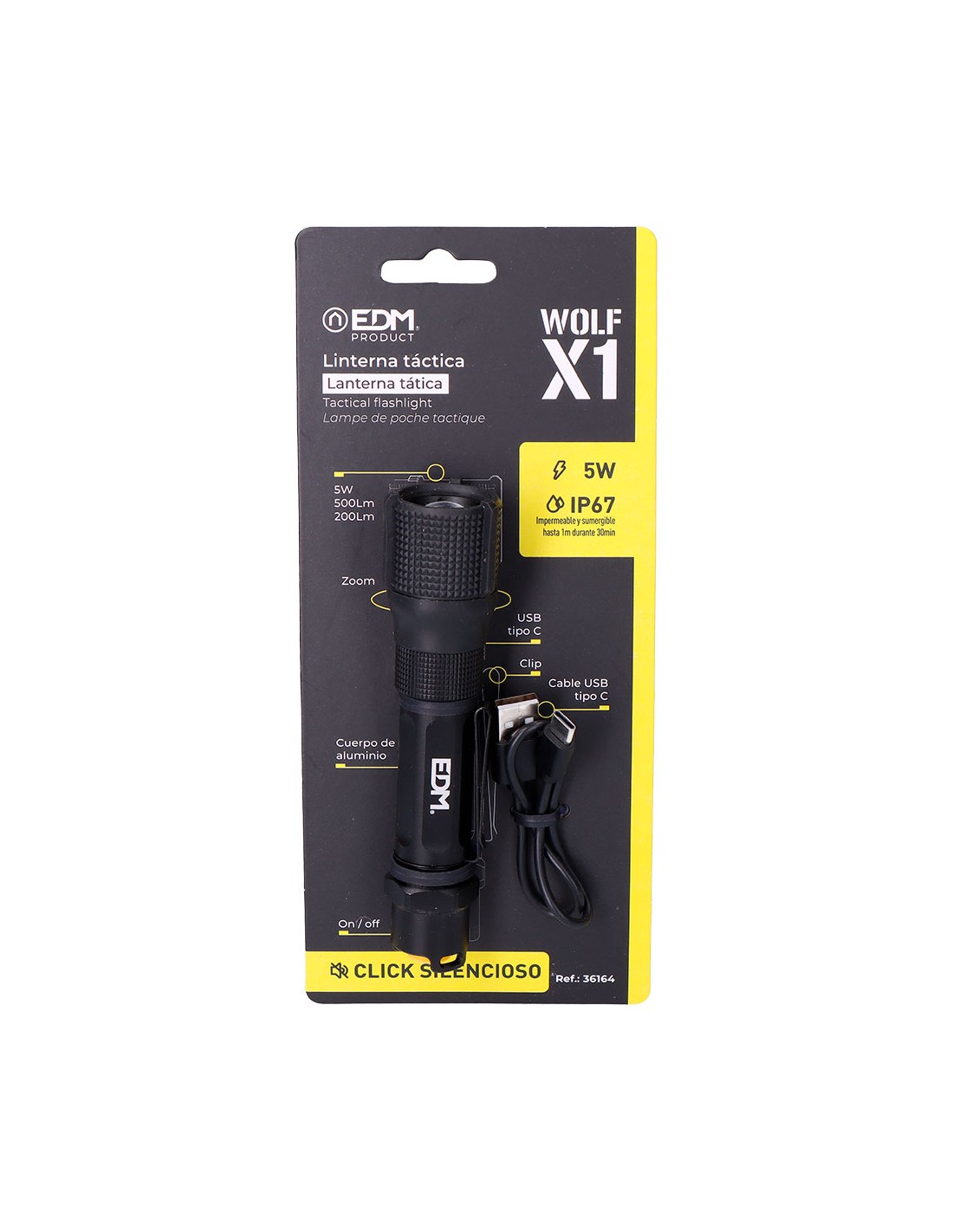 Linterna led táctica mini recargable wolf x1 de 5 w, 7000 k modos brillo: 500 lm / 200 lm / flash con función zoom botón táctico silencioso on / off batería 800 mah de litio incluida cable usb tipo c incluido con clip para colgar hasta 5 h de autonomía carga de 3 h cuerpo de aluminio ip67 sumergible hasta 1 m durante 30 min dimensiones ø32 x 139 mm. se presenta en expositor de 6 uds