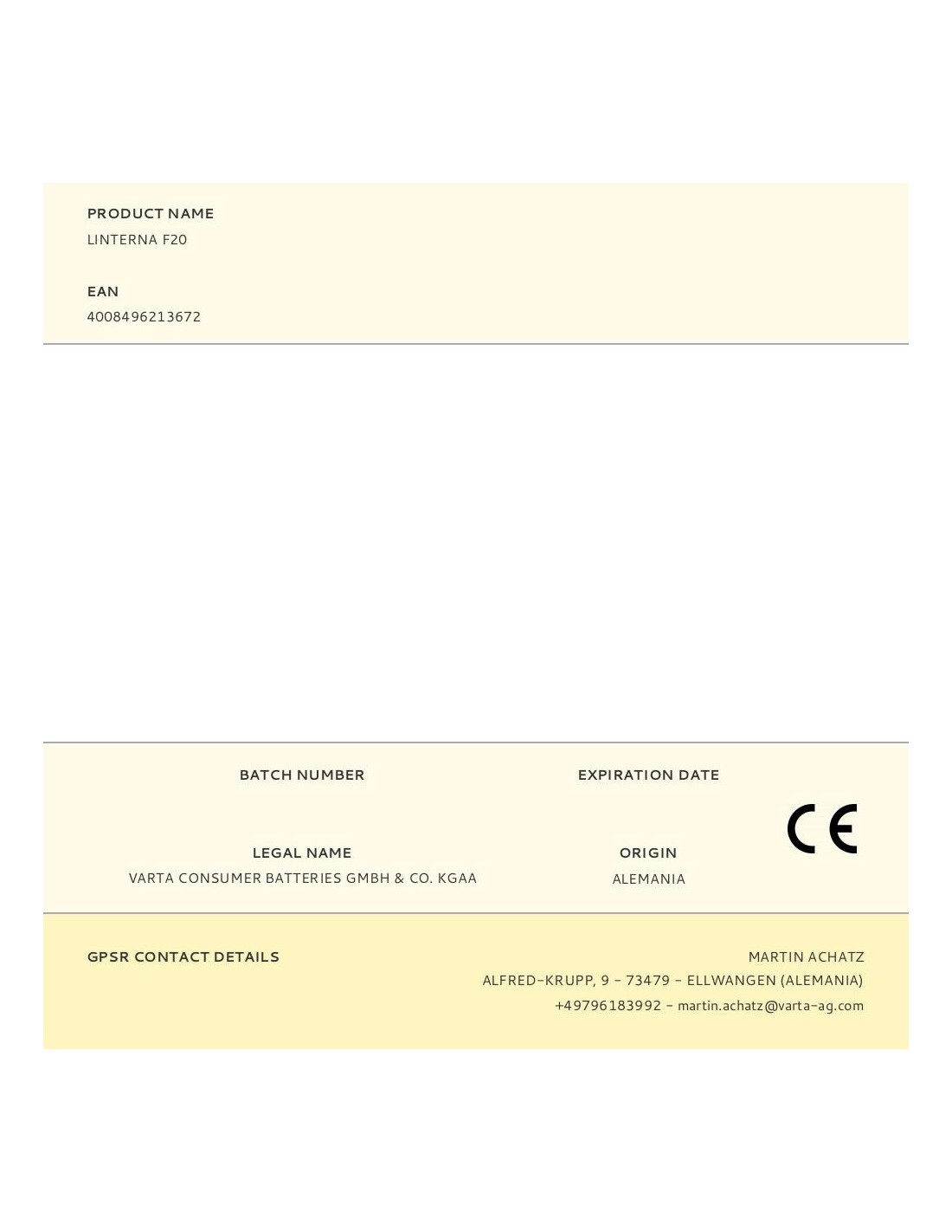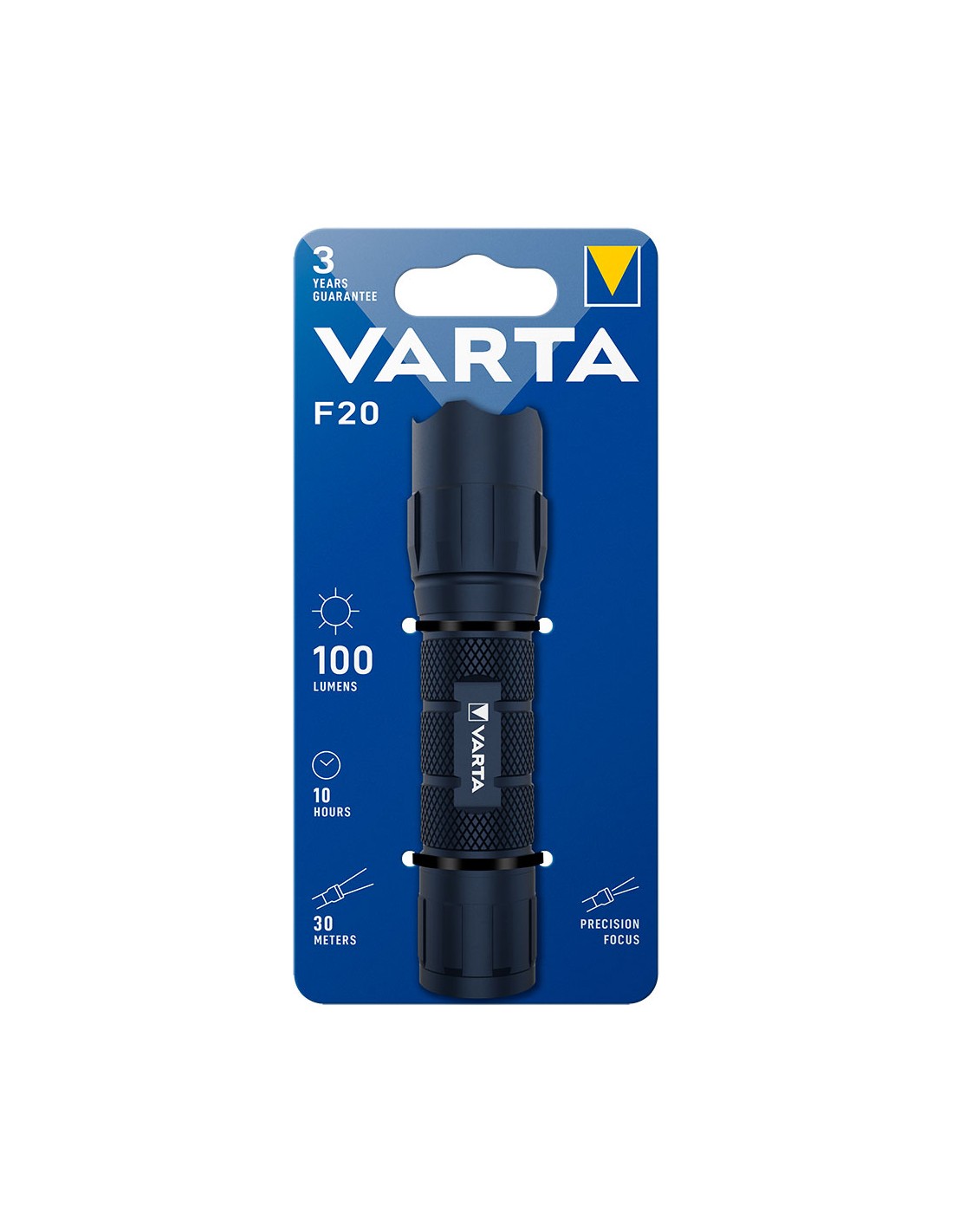 Linterna f20, led brillante de alto rendimiento, 100 lm, con 2 modos de luz: alta, baja. rango del foco: 30 m, autonomía: 10 horas. material: aluminio, pc, tpr. batería 3 x longlife power aaa no incluidas. dimensiones: ø30 mm cabezal, longitud 140 mm