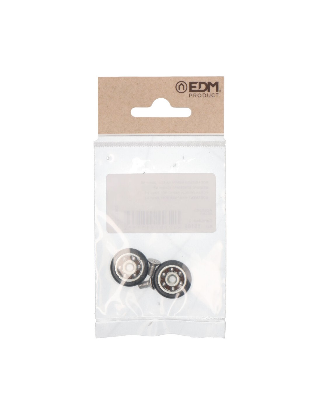 Blister con 2 rodamientos para mampara en nylon. dimensiones: ø20x6mm (diametro/ancho). incluye tornillo de metrica 4. acabado negro. edm