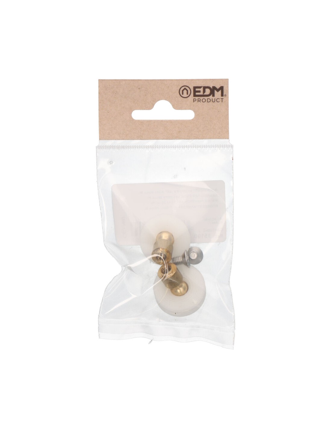 Blister con 2 rodamientos para mampara articulado en nylon. dimensiones: ø26x9mm (diametro/ancho). incluye tornillo de metrica 5. acabado blanco. edm