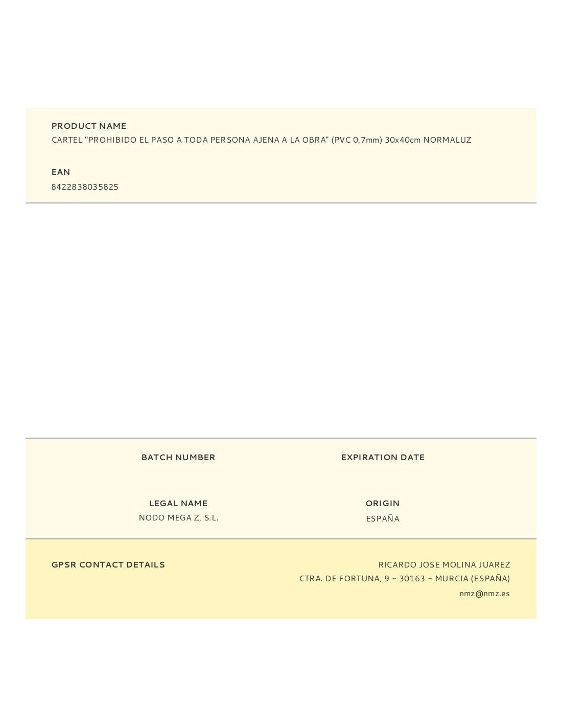 Cartel "prohibido el paso a toda persona ajena a la obra" (pvc 0,7mm) 30x40cm normaluz
