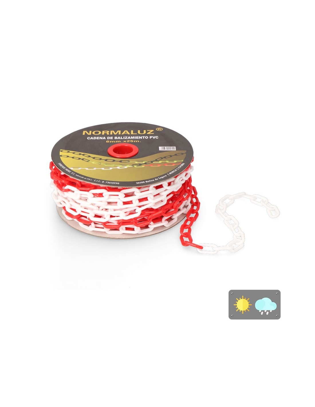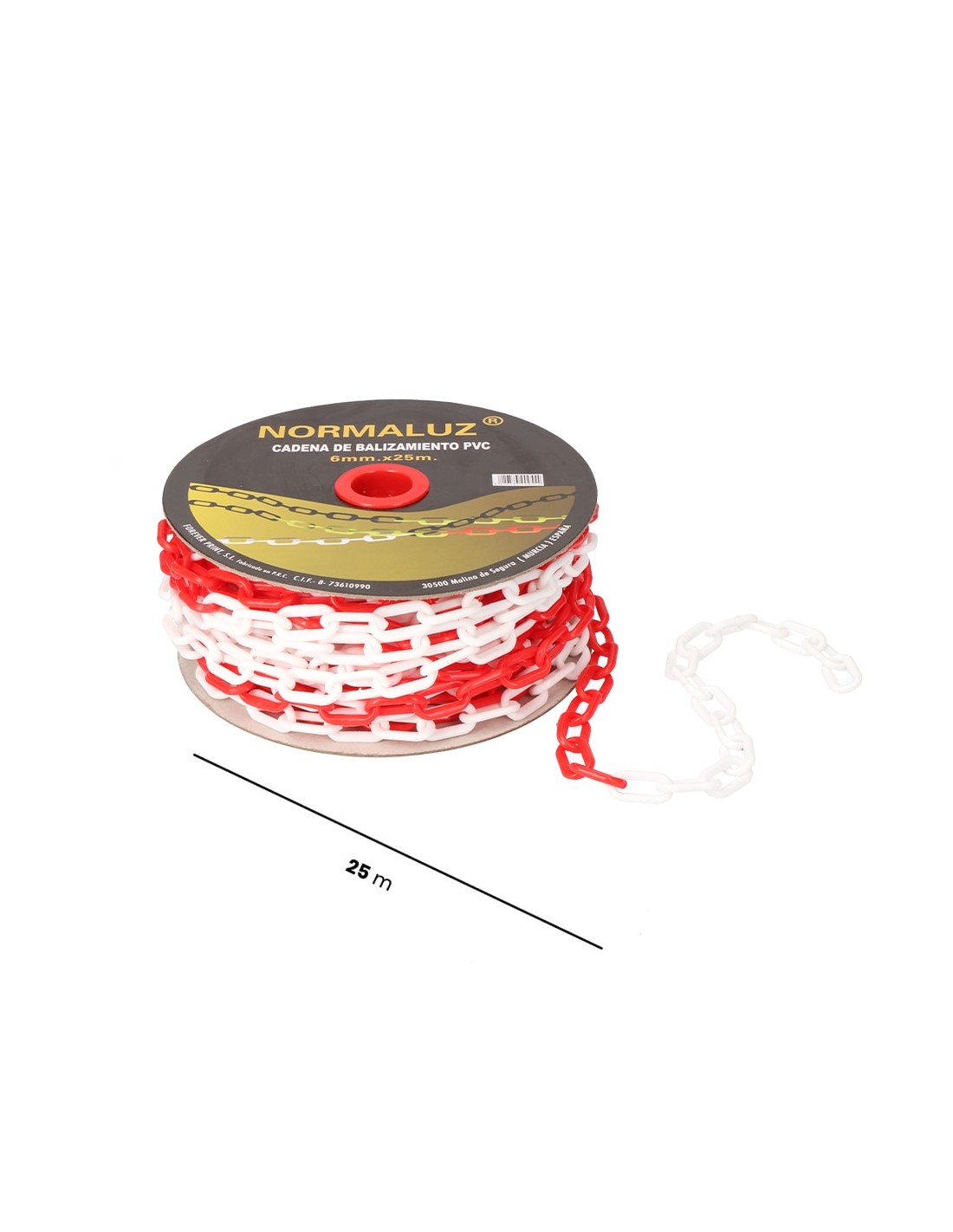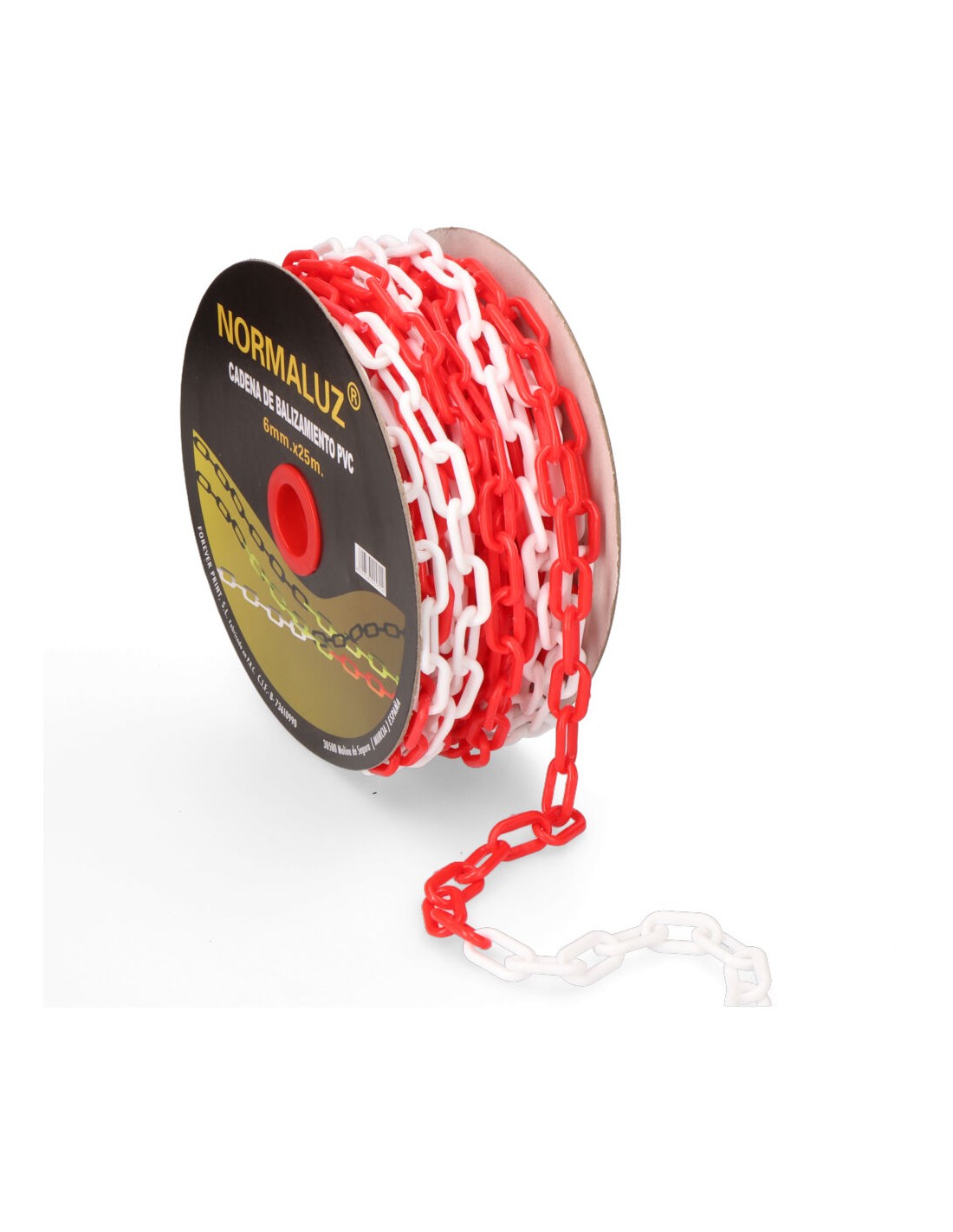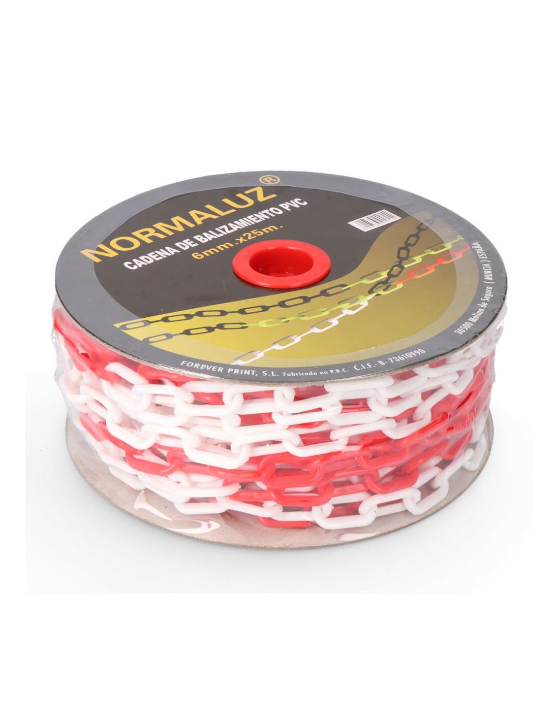 Cadena plástica eslabonada de color rojo y blanco, grosor 6mm. rollo de 25m. se puede utilizar para delimitar y señalizar zonas