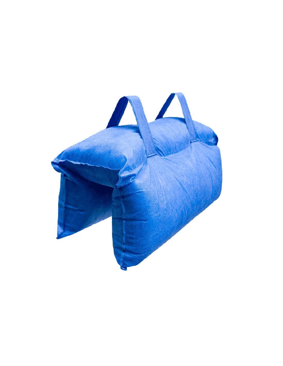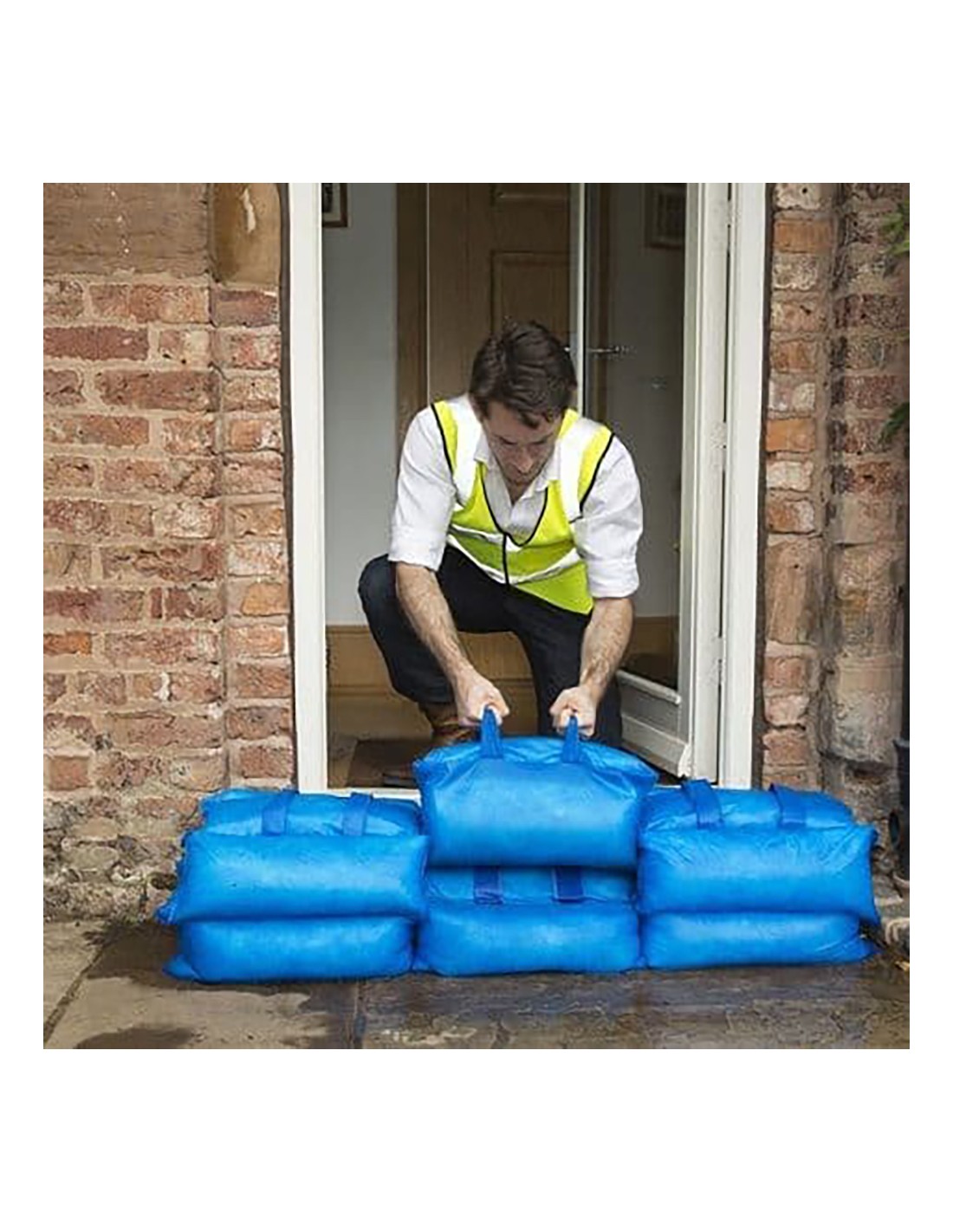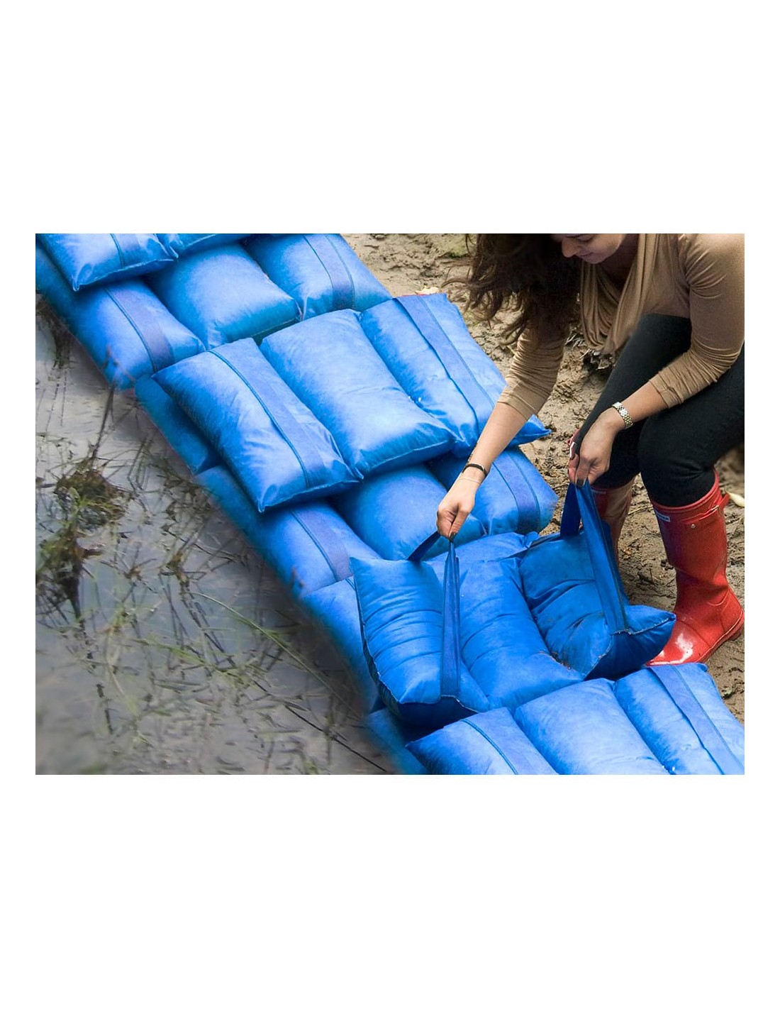 Saco/barrera de emergencia para la formación de barrera anti-inundaciones destinada a la absorción y a la redirección del agua. rellenos con un polímero súper absorbente inocuo en seco son ligeros (0,25 kg), fabricado con materiales 100% respetuosos con el medio ambiente color azul, 60 x 48 cm