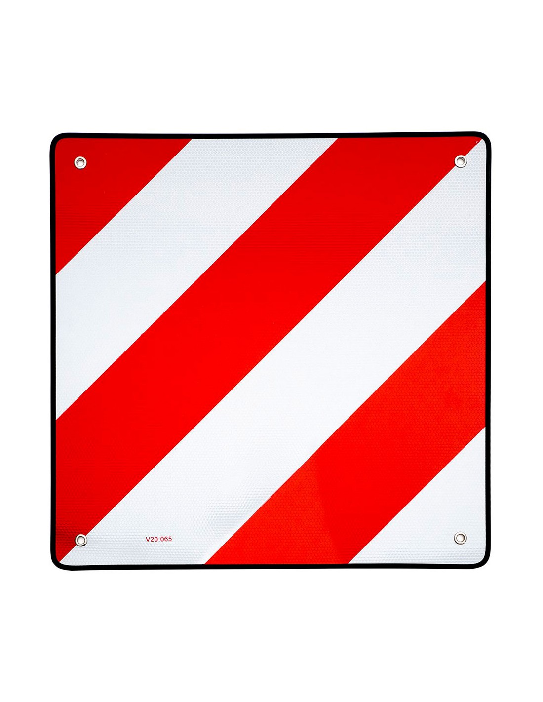 Panel v20 destinado a la señalización de la cara que sobresale por la parte trasera de cualquier vehículo o cualquier extensión aclopada al vehículo. esta señal de advertencia se usa para garantizar un transporte seguro. el material con el que está fabricado es flexible y cuenta con unas perforaciones en las puntas diseñadas para facilitar y agilizar mucho más la sujeción. medidas 500 x 500 mm