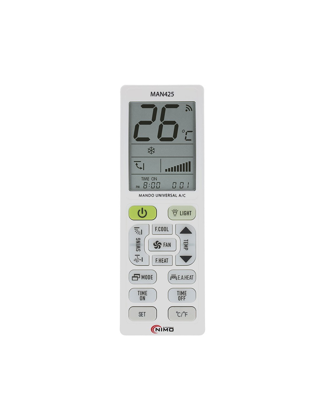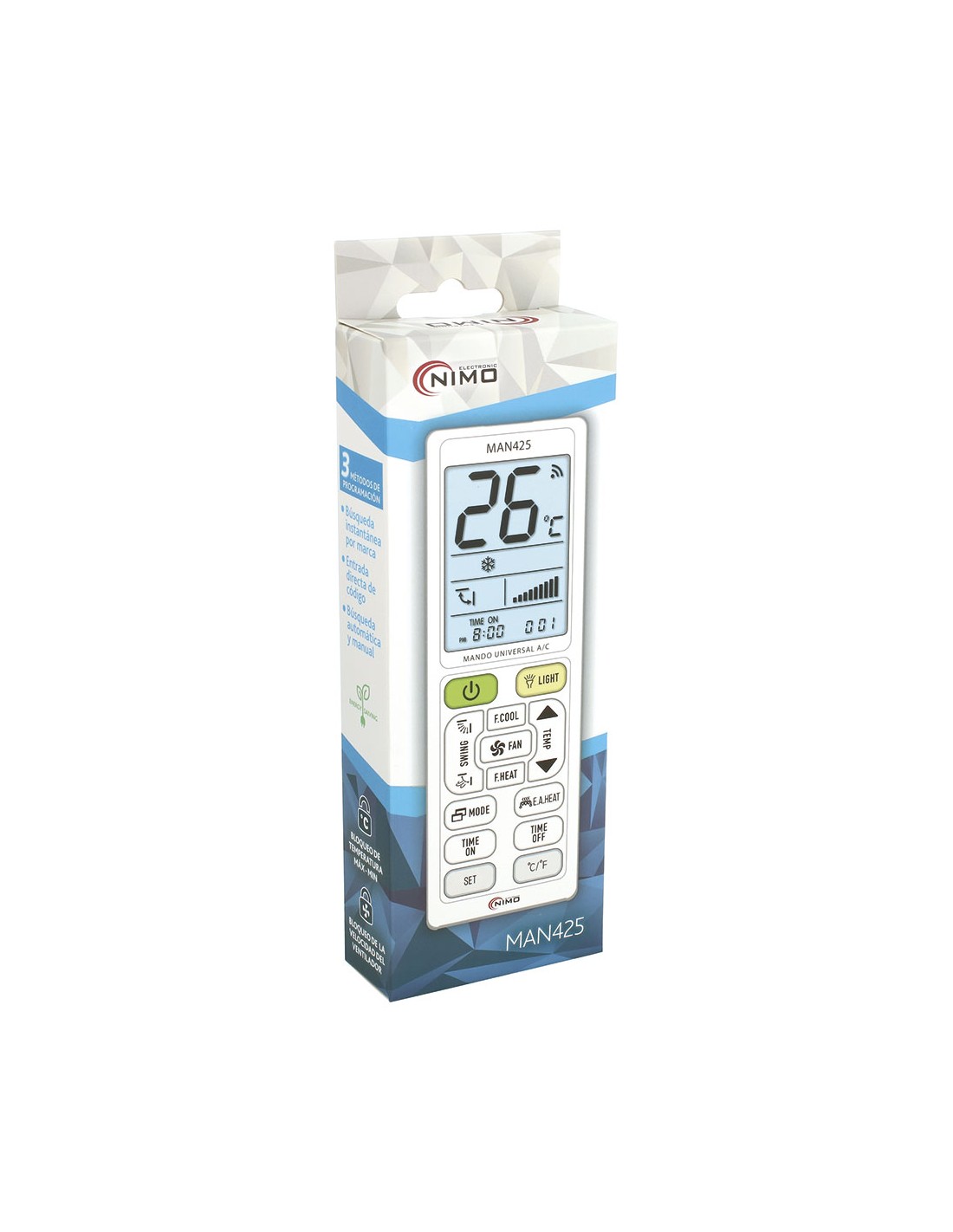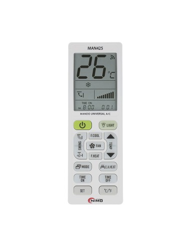 Mando universal para aire acondicionado con 5000 códigos. válido para todas las marcas, opción eco, bloqueo de temperatura máx.-min. función de temporizador, termómetro, reloj, linterna, pantalla iluminada, 3 métodos de programación: búsqueda instantánea por marca, entrada directa de código o búsqueda automática y manual. alimentación pilas 2xaaa (no incluidas).