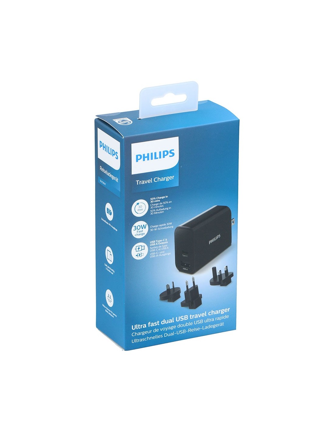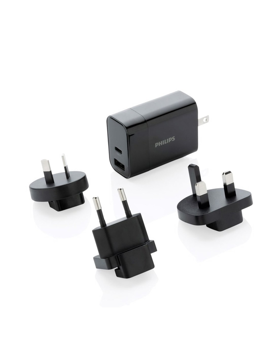 Cargador de viaje ultra rapido con accesorios philips. incluye adaptadores de enchufe internacional aus, uk, eu, us. 2.4a. carga rápida de 30w. usb tipo c.