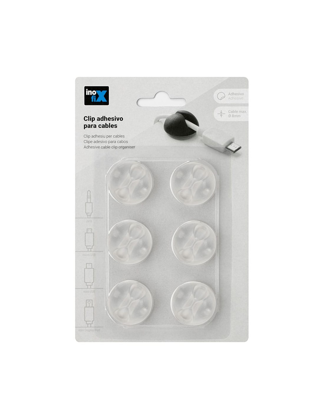 Clip adhesivo para cables transparente inofix. clips ideales para tener los cables ordenados, para tenerlos siempre localizados en el lugar adecuado.se introduce el cable y se retira con extrema facilidad. aplicable a todo tipo de cables de hasta un grosor de ø8mm (cables de carga, de alimentación, hdmi, usb, etc). muy útiles tanto a nivel doméstico como en una oficina. de tacto agradable y bien acabado, no daña cables o dispositivos electrónicos.