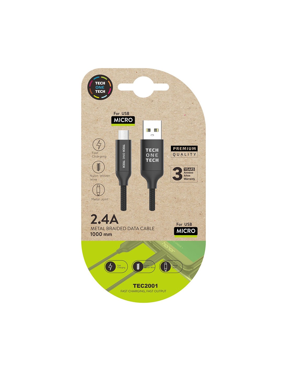Cable negro braided nylon (usb-a a micro usb) 1m 2 tech one tech. cable de datos y carga rápida de nylon, recubierto, trenzado y reforzado. anti-torsión y abrasión. conectores y uniones metalizados para una mayor resistencia y durabilidad. 2,4a. 1m longitud y 30 gr. de peso. válido para móviles, tablets, cascos, juguetes, etc. con conexión micro usb (android). normativas y seguridad: cumple con las normas de ce, fcc y rohs. multi-protecciones contra sobrecarga y cortocircuito previenen efectivamente los posibles daños a tus dispositivos. garantía: 3 años. la más alta calidad del mercado con la mayor garantía. productos pensados para durar.